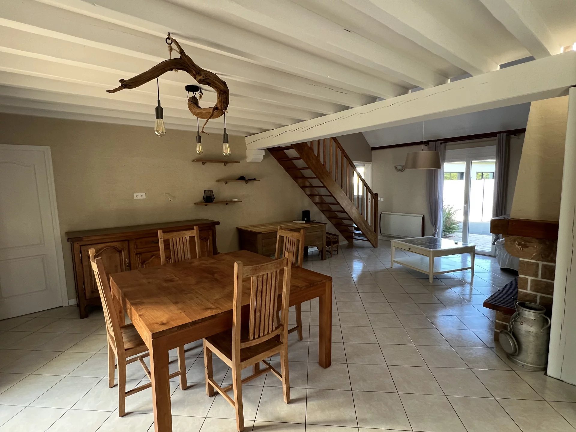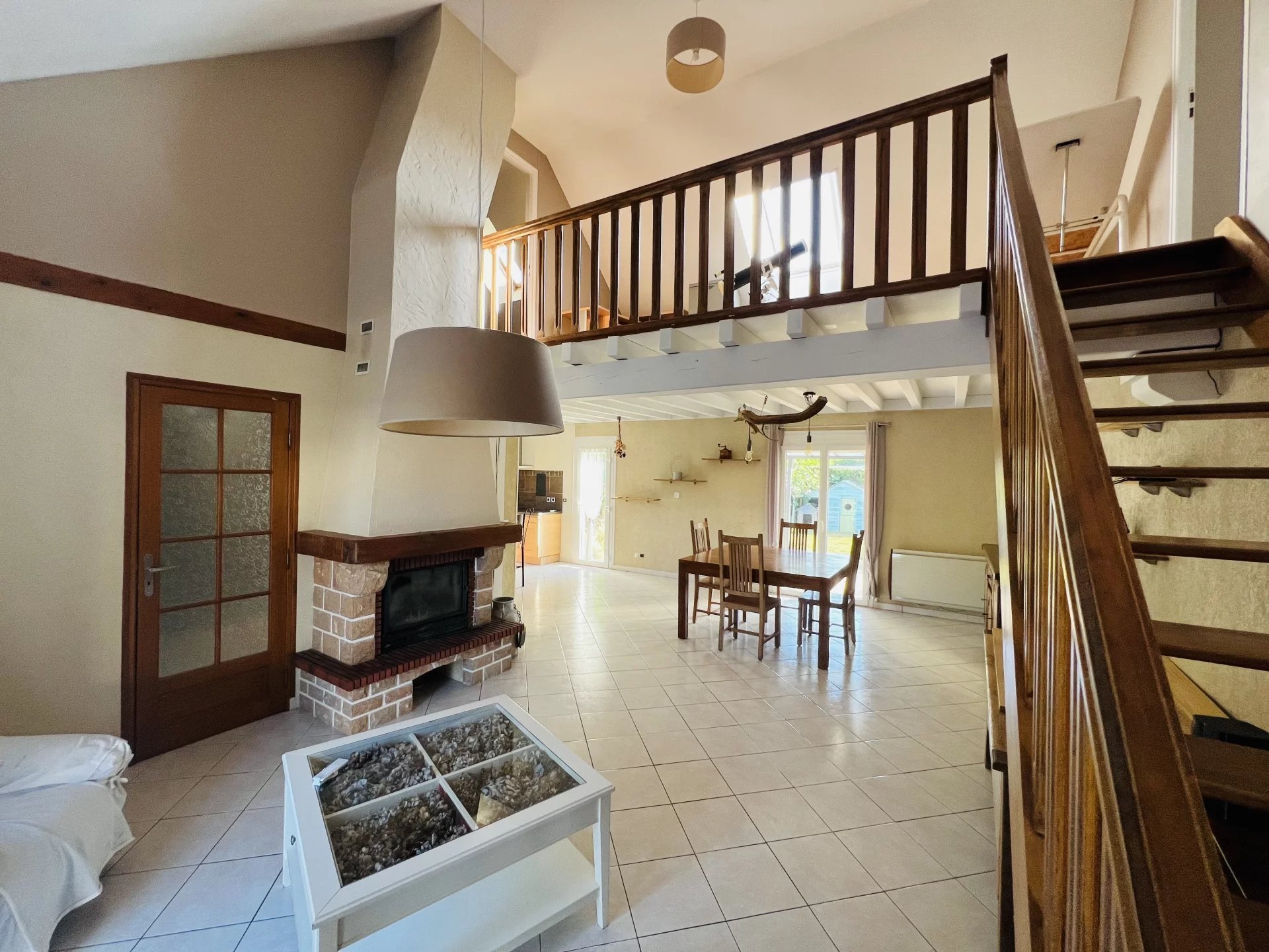 - 1 cuisine équipée et aménagée ouverte sur un grand séjour salon avec cheminée bois