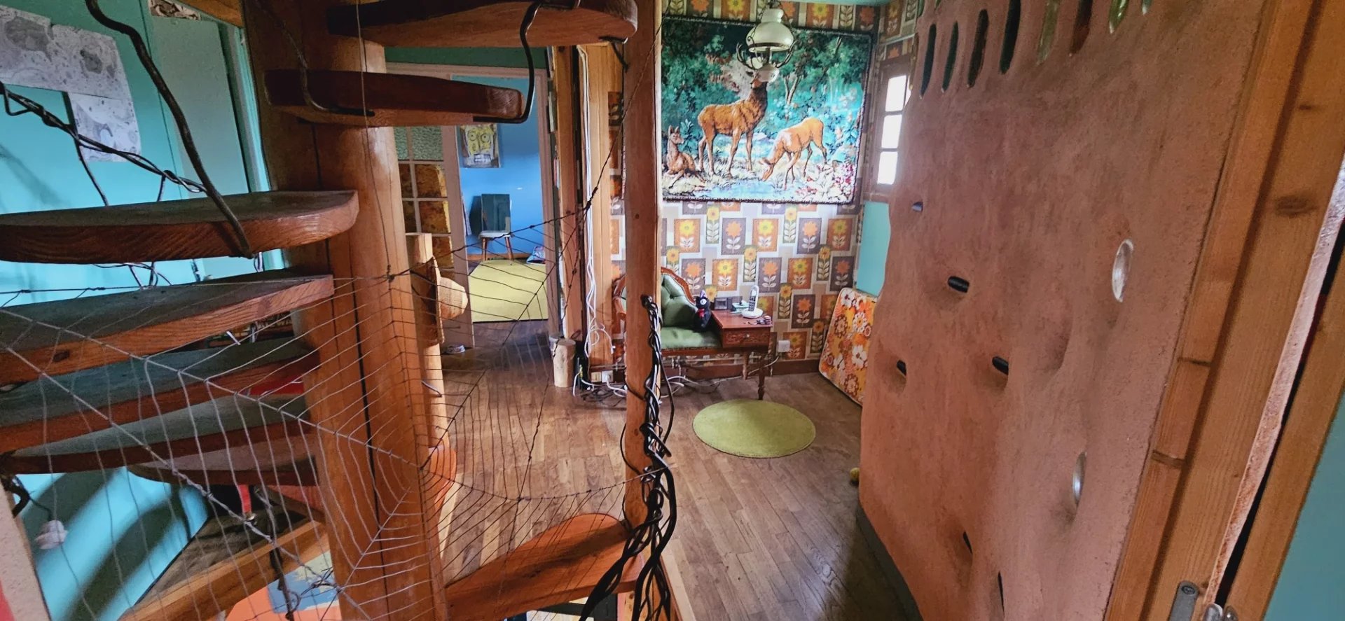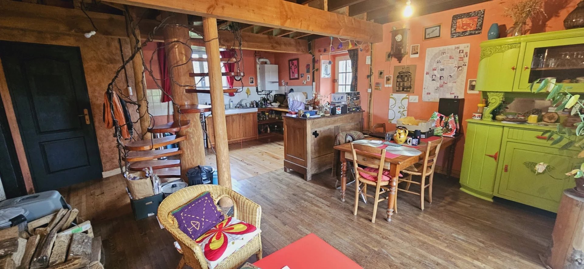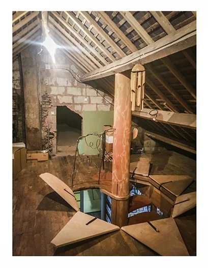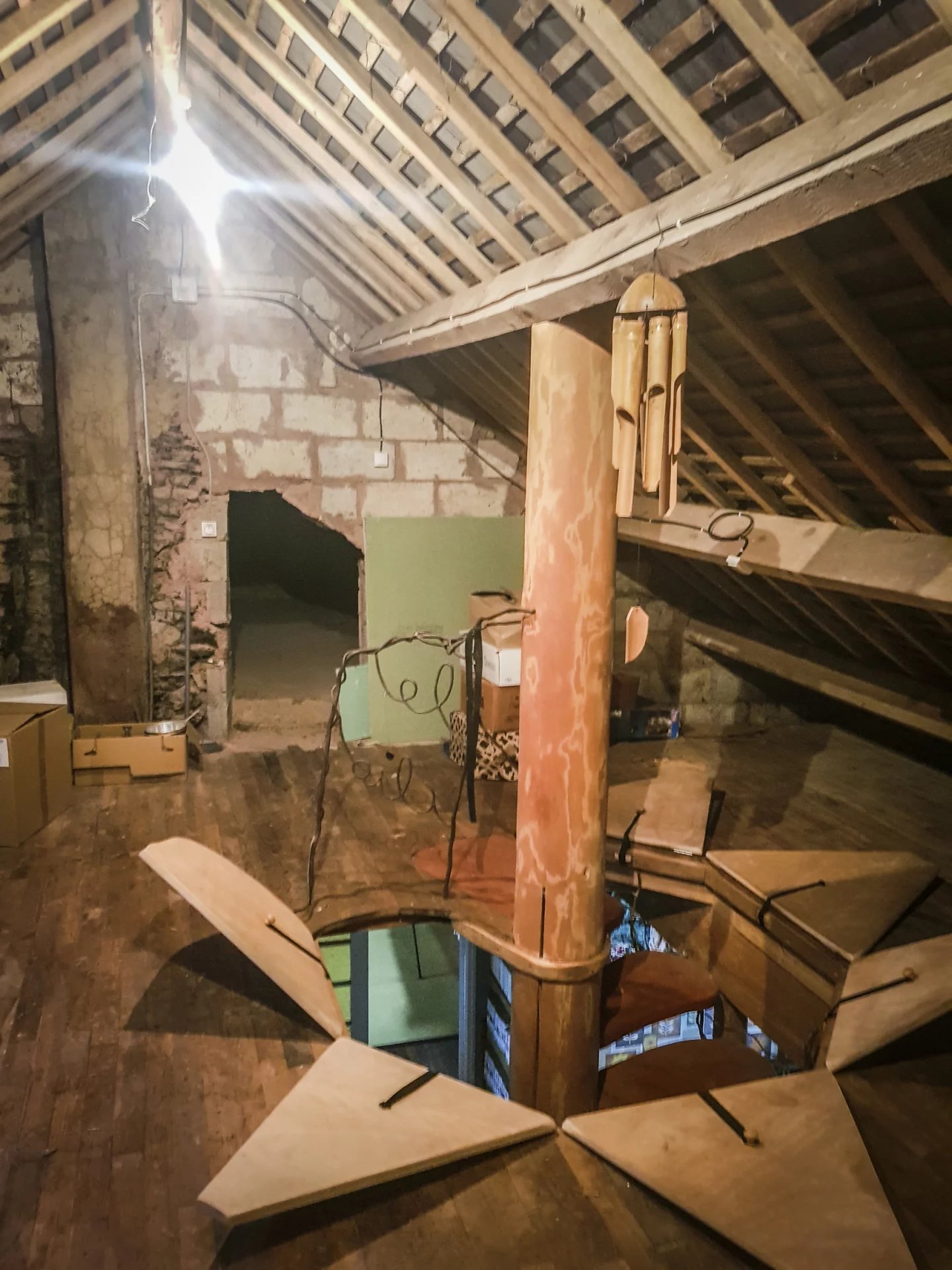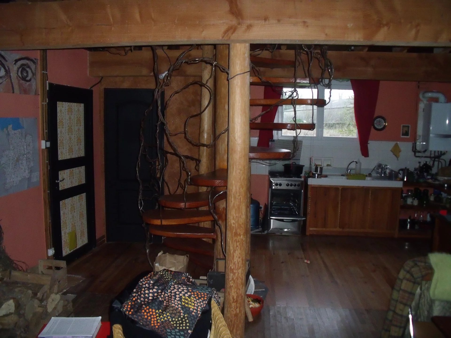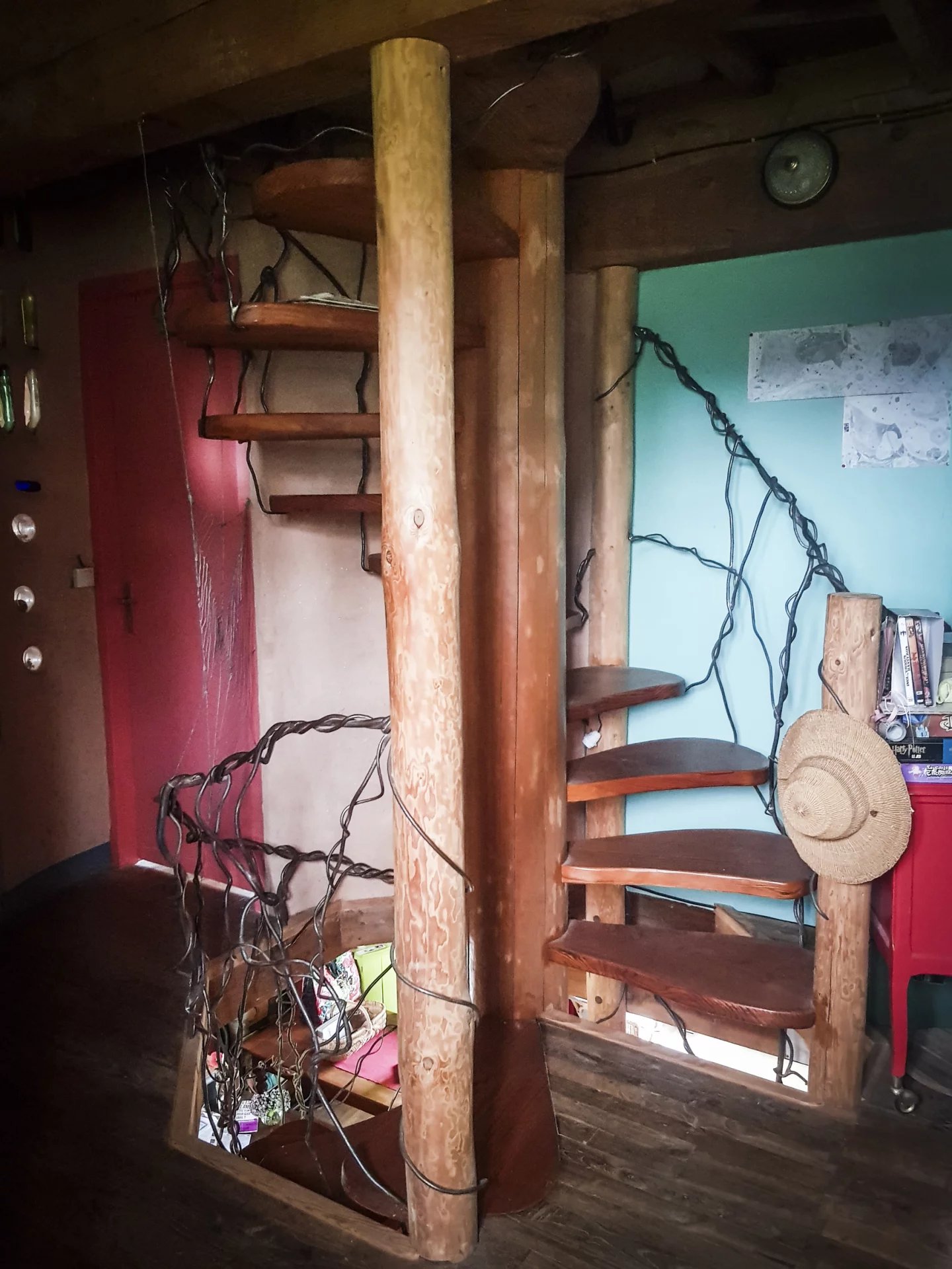 Escalier en colimaçon en bois avec tronc Douglas qui va jusqu’au grenier.