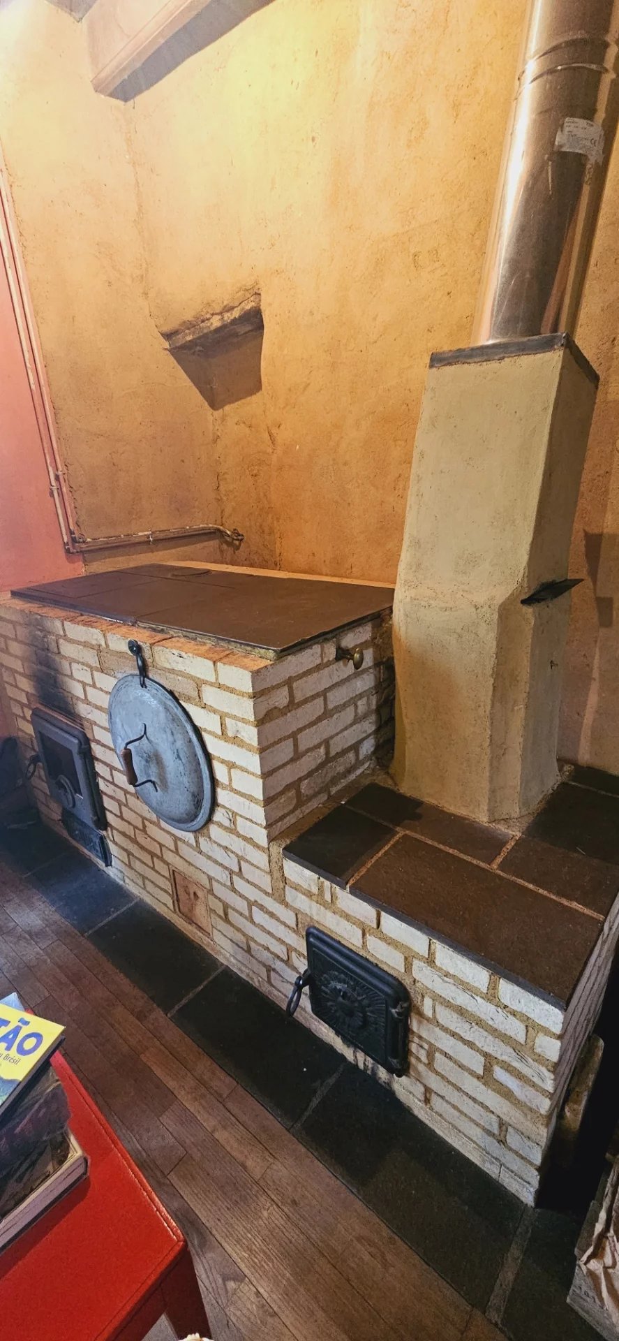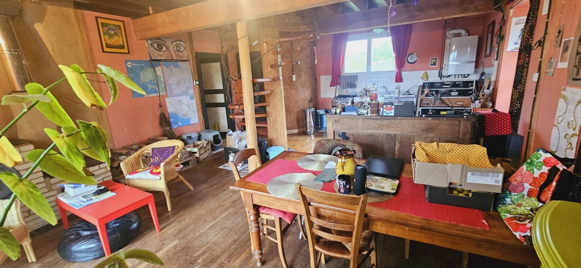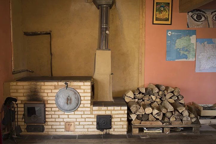 Au rez-de-chaussée, une cuisine ouverte sur la salle à manger avec un poêle/boisinière demi-masse, un salon avec cheminée ouverte, toilettes sèches avec mur en terre/paille, buanderie, véranda.