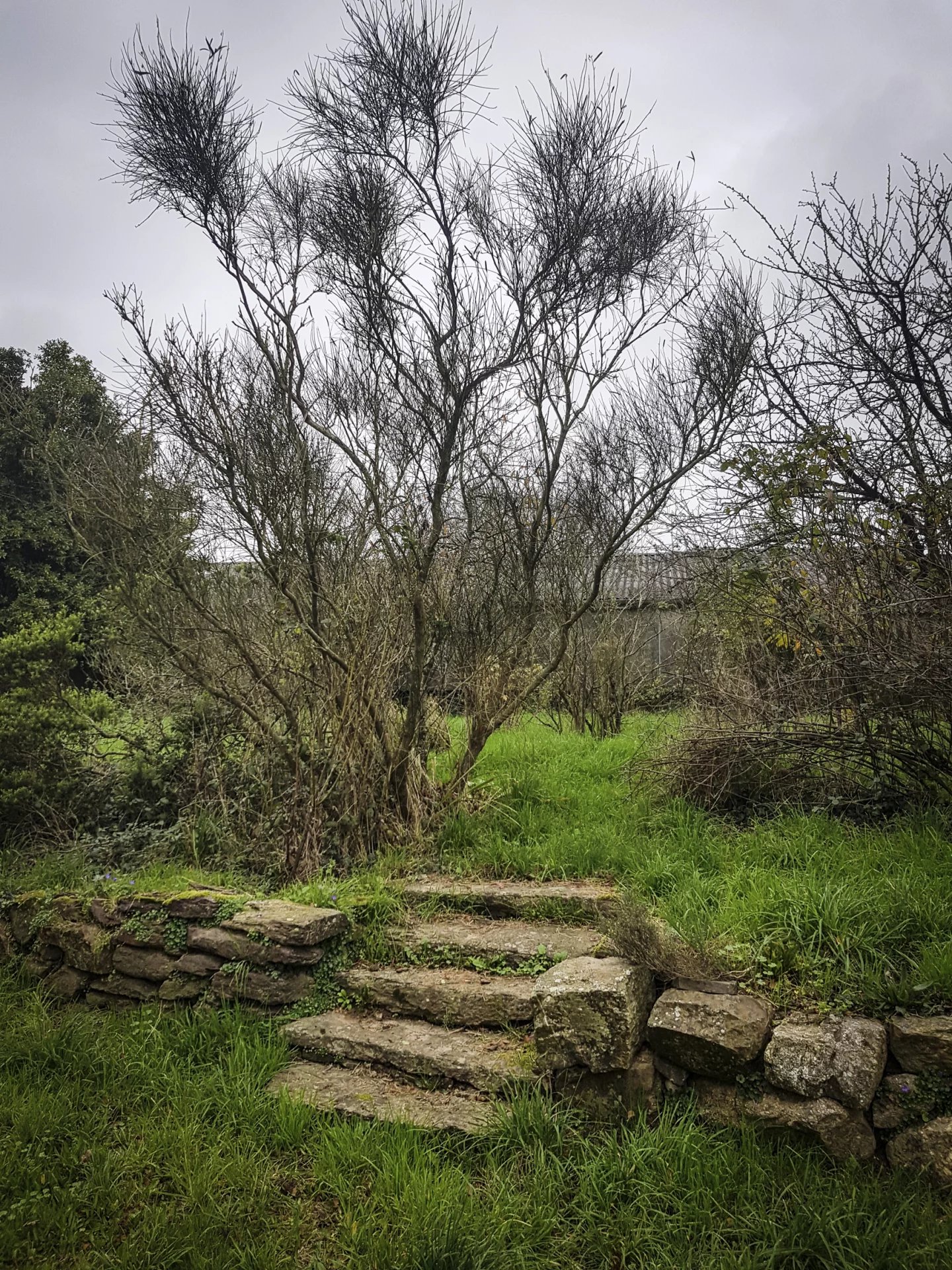 A l'avant de la maison, une haie a été plantée tout autour du terrain avec différentes variétés d'arbres et d'arbustes : bouleaux, arbres à papillons, genêts, forsythias, baies de goji... et également cassissiers et framboisiers.
