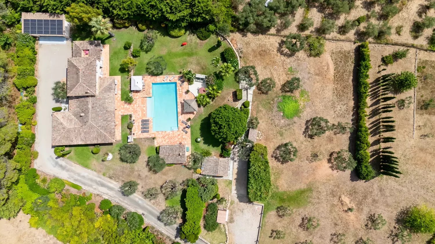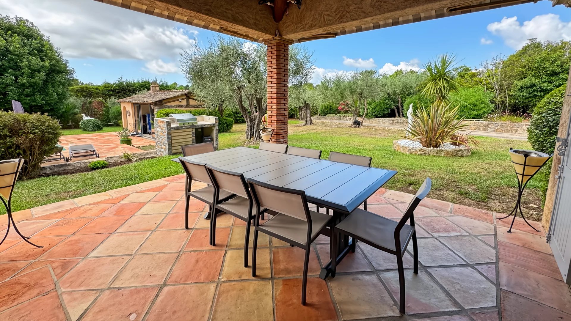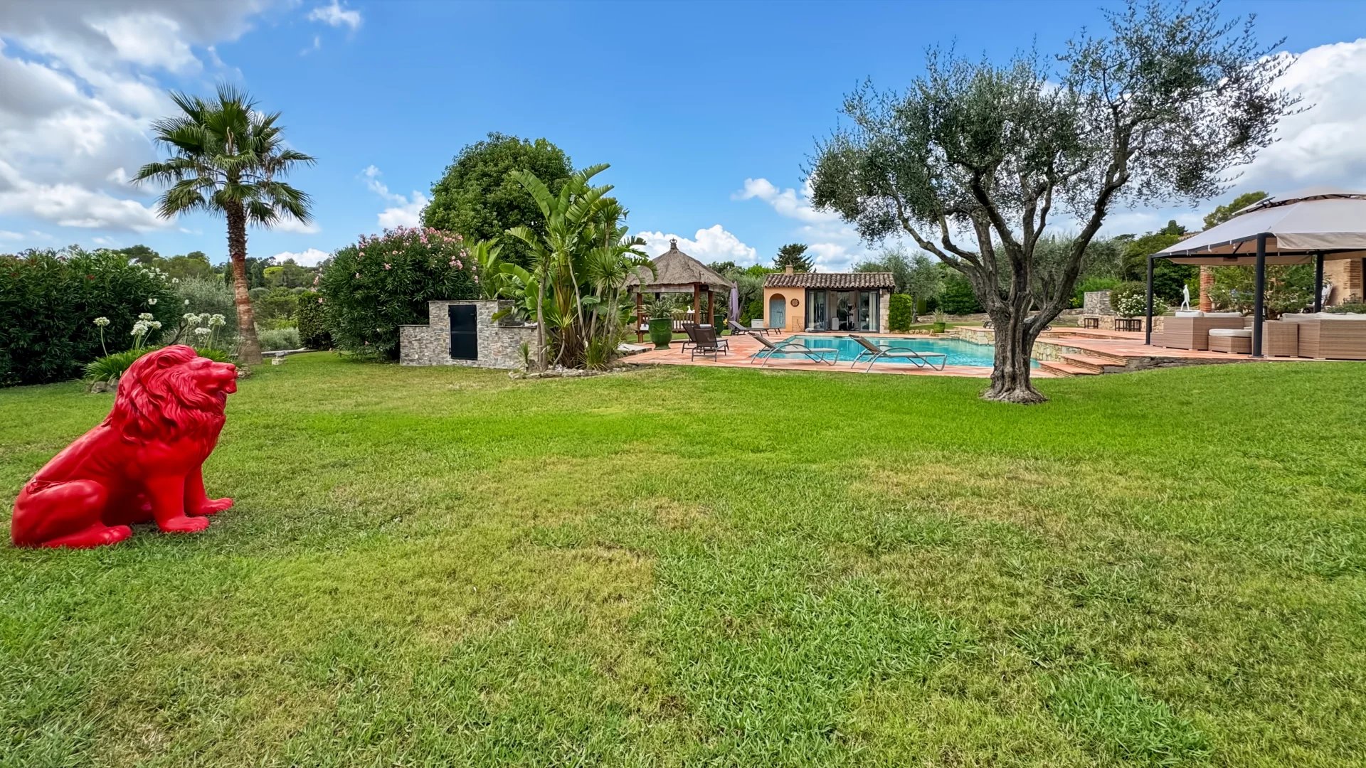 Le jardin luxuriant accueille 58 oliviers, une fontaine, un jacuzzi, un boulodrome et un pool house aménagé en salle de sport.