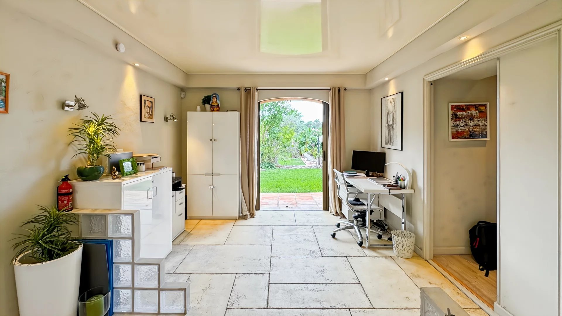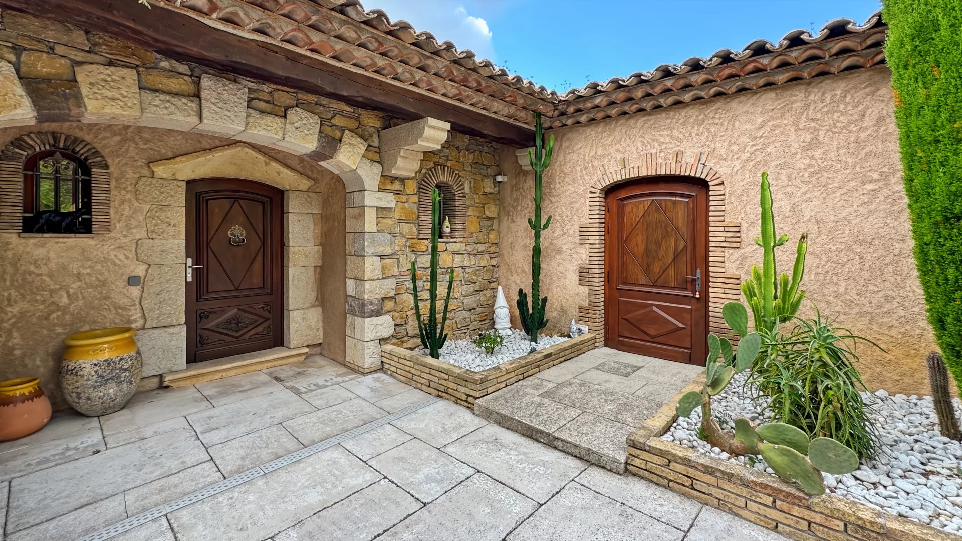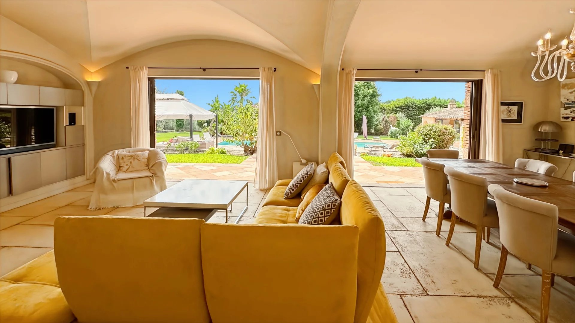 Le jardin luxuriant accueille 58 oliviers, une fontaine, un jacuzzi, un boulodrome et un pool house aménagé en salle de sport.