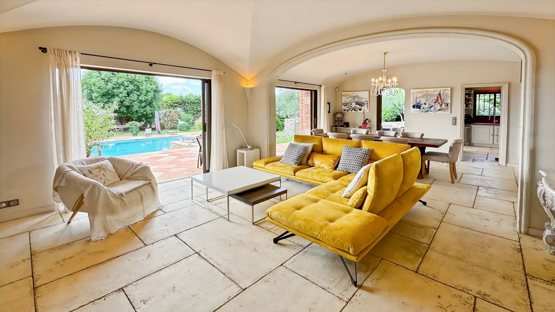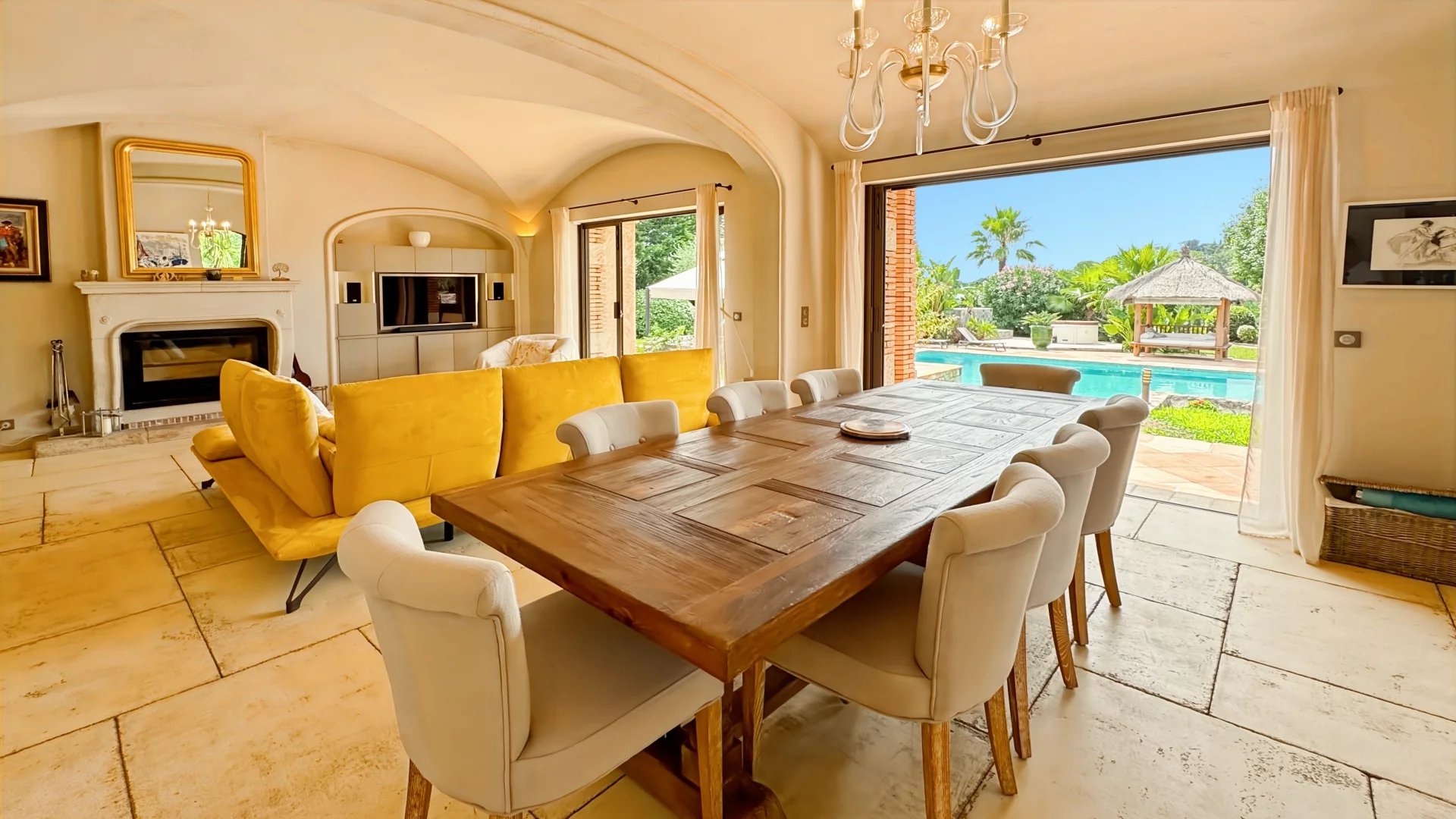 L’espace de vie principal séduit par sa luminosité et son ouverture sur l’extérieur : un salon avec cheminée, une salle à manger conviviale, et une grande cuisine aménagée ouvrant sur une terrasse idéale pour les repas d’été. La piscine (16 x 7 m) devient le cœur des moments de détente en famille ou entre amis.