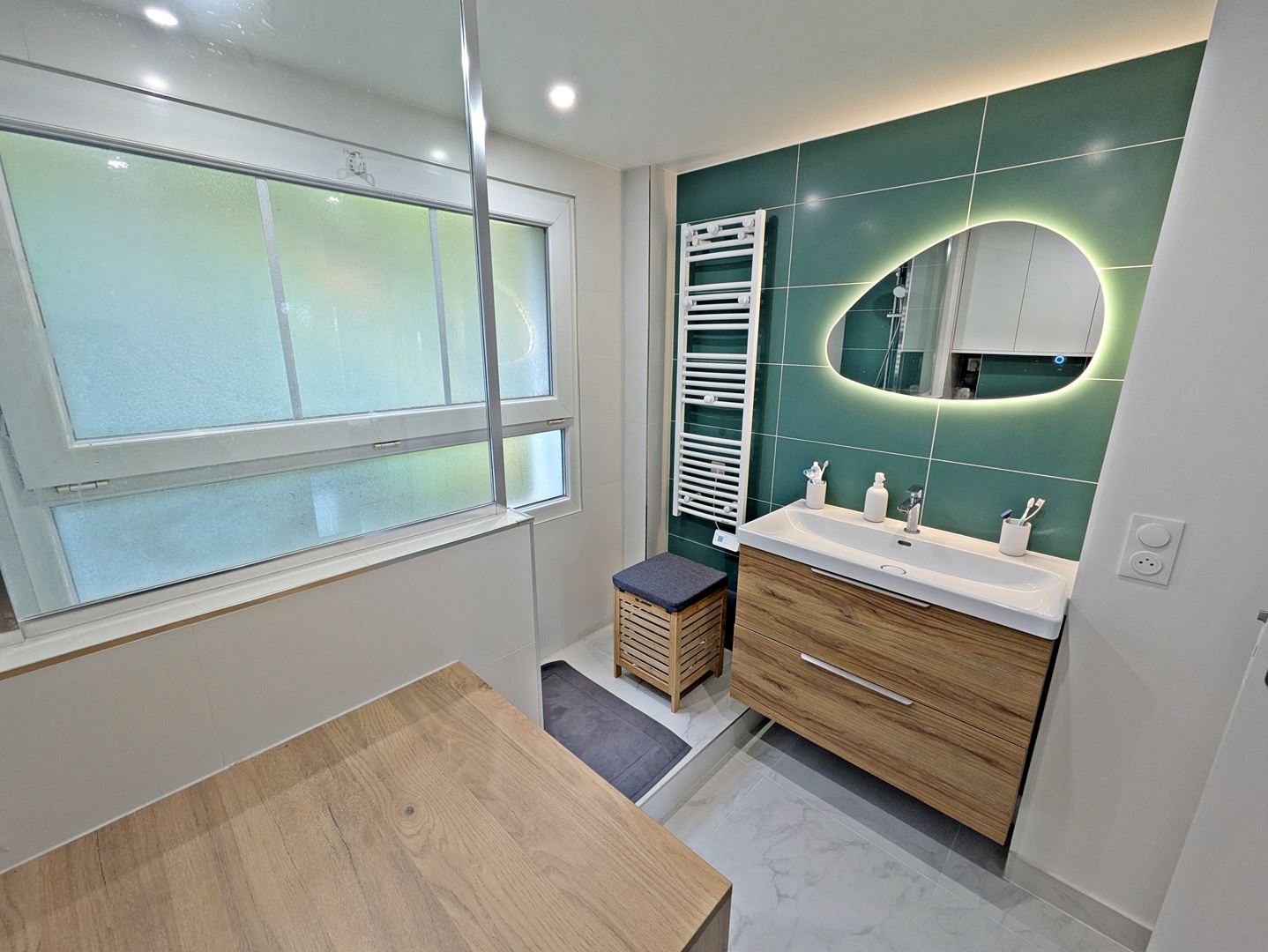 Une salle deau avec toilettes, entièrement rénovée en 2025, au style contemporain et élégant.