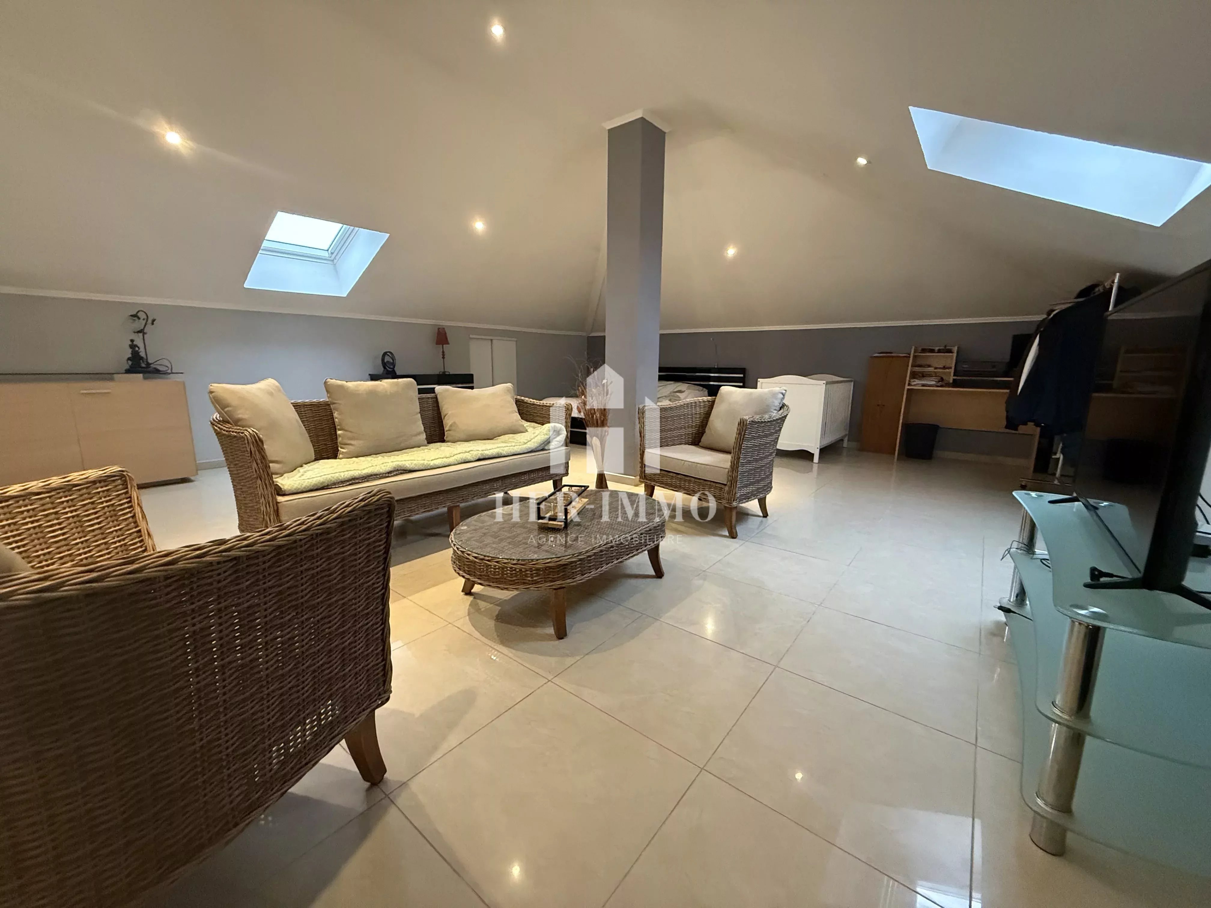 Une superbe mezzanine de 57 m² pouvant faire office de chambre parental, vous offre une vue imprenable sur la pièce de vie, tout en laissant libre cours à votre imagination pour un tout autre aménagement (bureau, salle de loisirs, ou autre).
