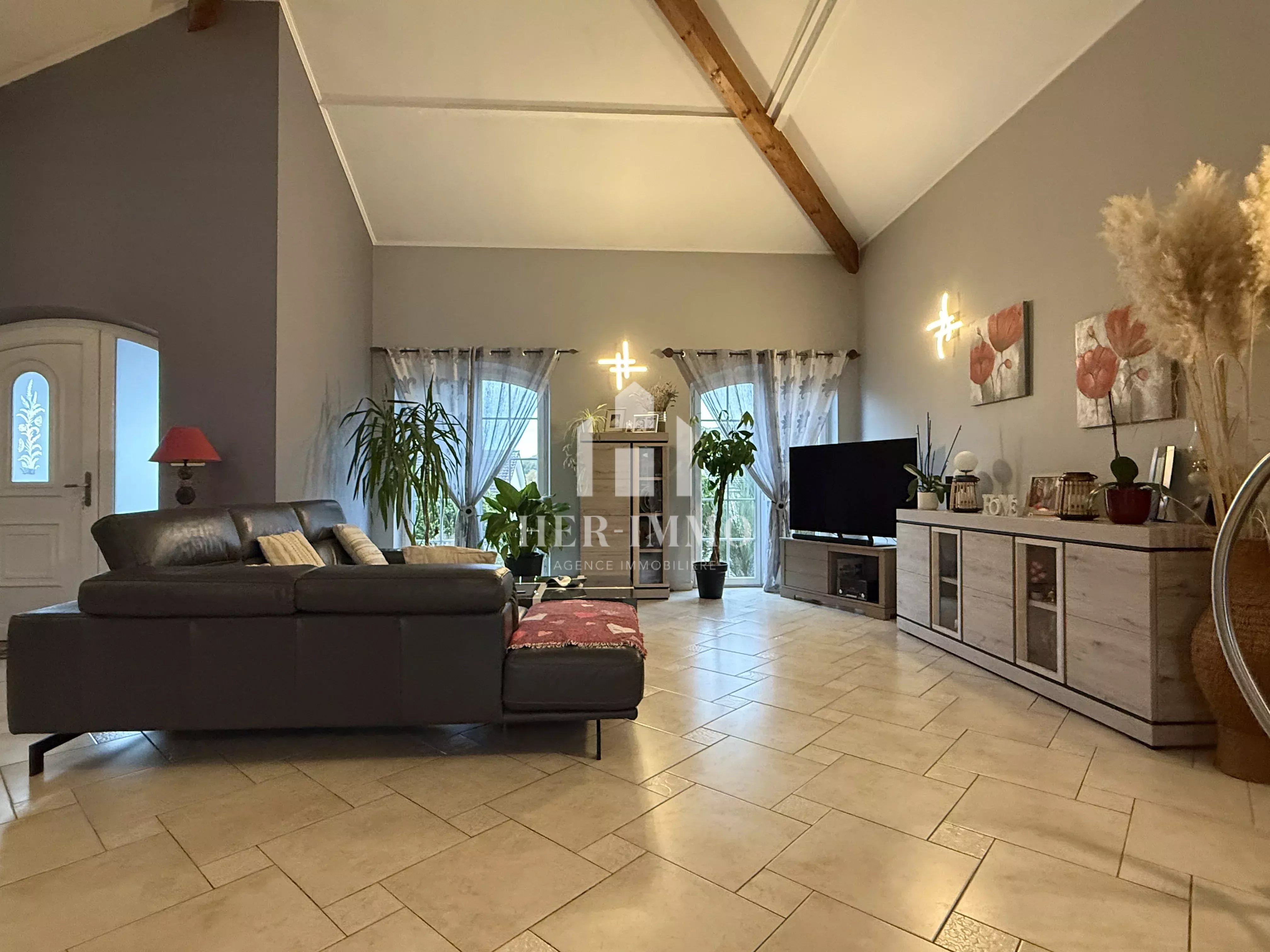 Un hall d'entrée accueillant mène à un vaste espace de vie lumineux, ouvert sur une cuisine équipée moderne, donnant sur le jardin. Ce même niveau comprend également trois chambres, une grande salle de bain familiale, ainsi qu'un WC séparé.