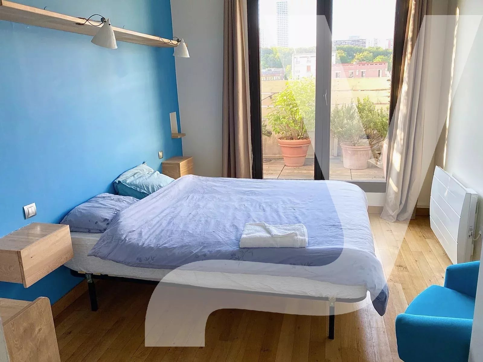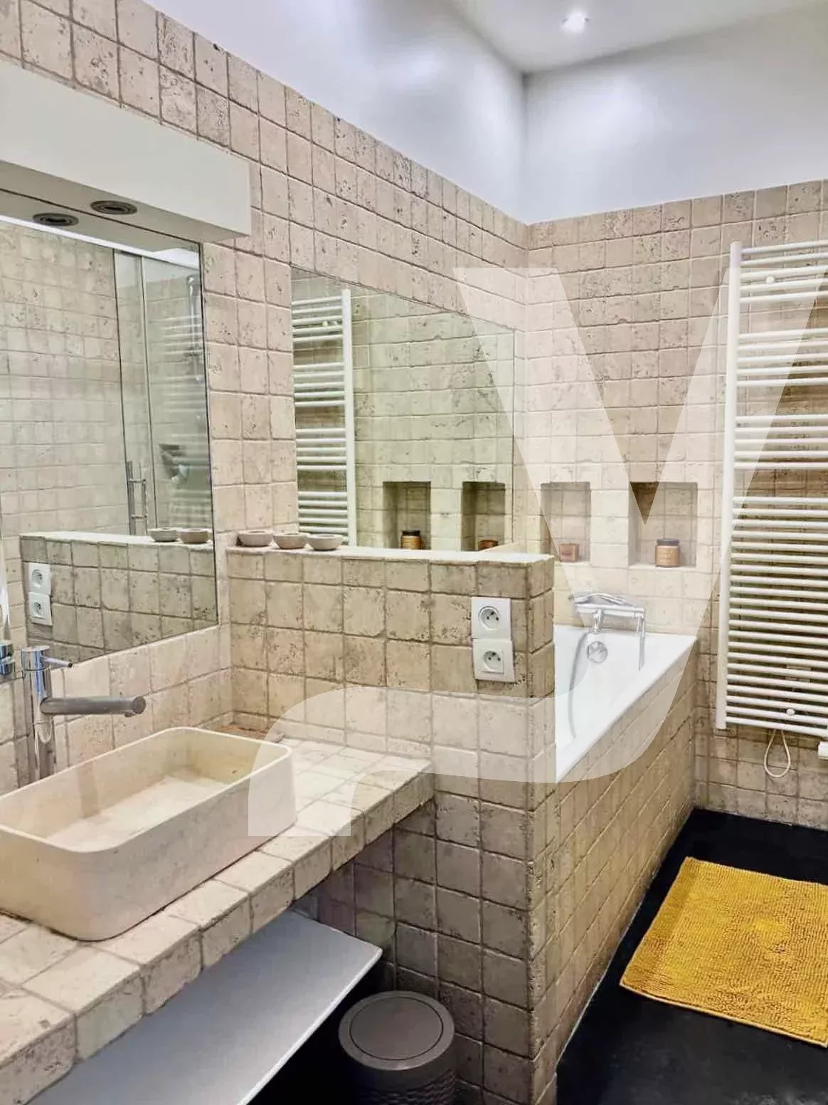 Le loft comprend également une cuisine semi-ouverte, équipée et aménagée, ainsi que deux chambres de 14 m² et 11 m², chacune bénéficiant d'une belle luminosité. La terrasse est idéalement accessible depuis l'une des chambres, renforçant la sensation d'ouverture et de fluidité. La salle de bains, ornée de marbre et d'ardoise, propose un luxe quotidien avec ses doubles douches et sa baignoire.