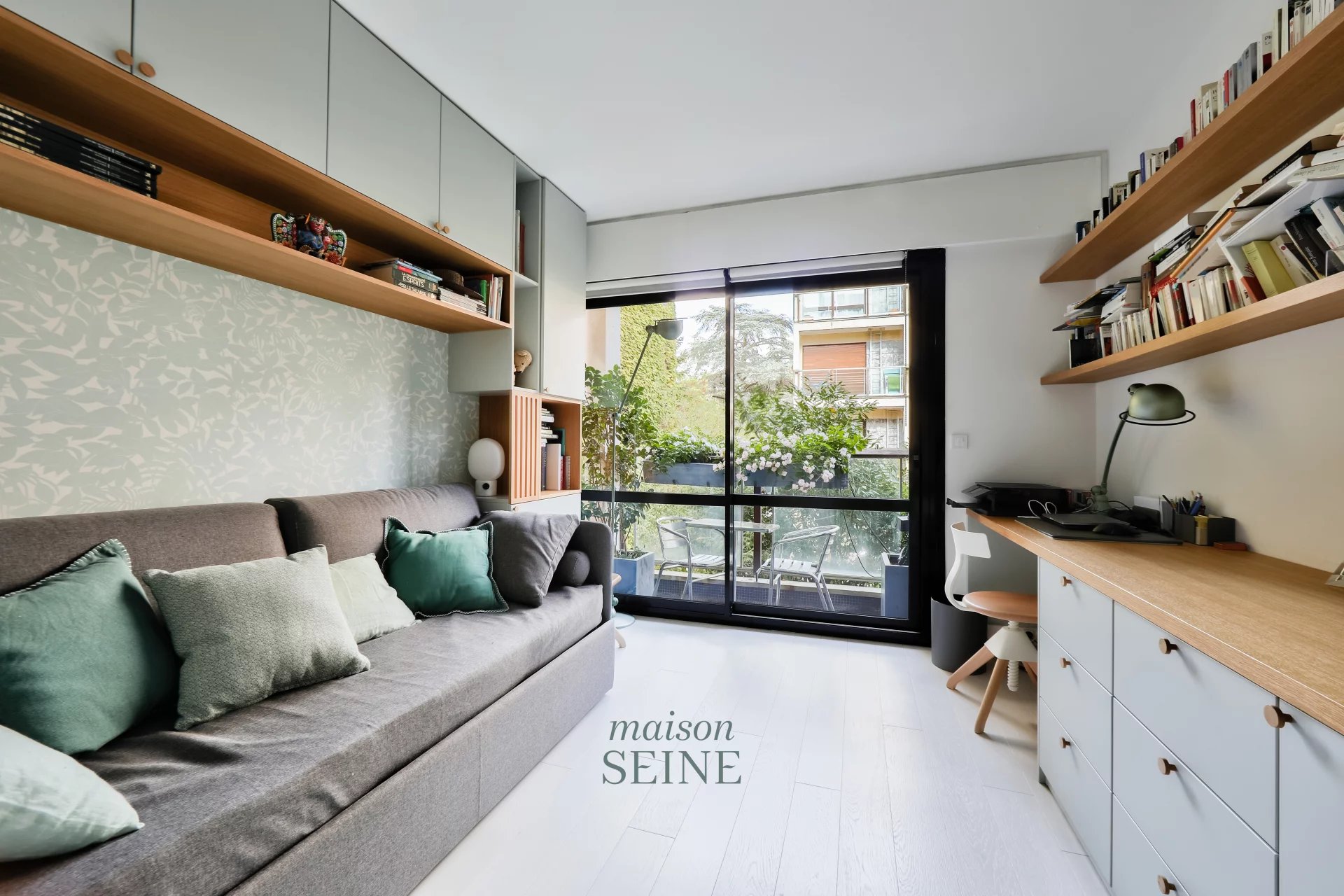 L'appartement comprend une entrée desservant une double réception avec menuiseries sur mesure et donnant sur un balcon orienté plein Sud, une cuisine meublée et équipée indépendante et dinatoire, une suite parentale avec rangements et salle de douche, une seconde chambre avec rangements, les deux chambres ayant chacune un accès à un balcon, une salle de bain et un toilette indépendant.