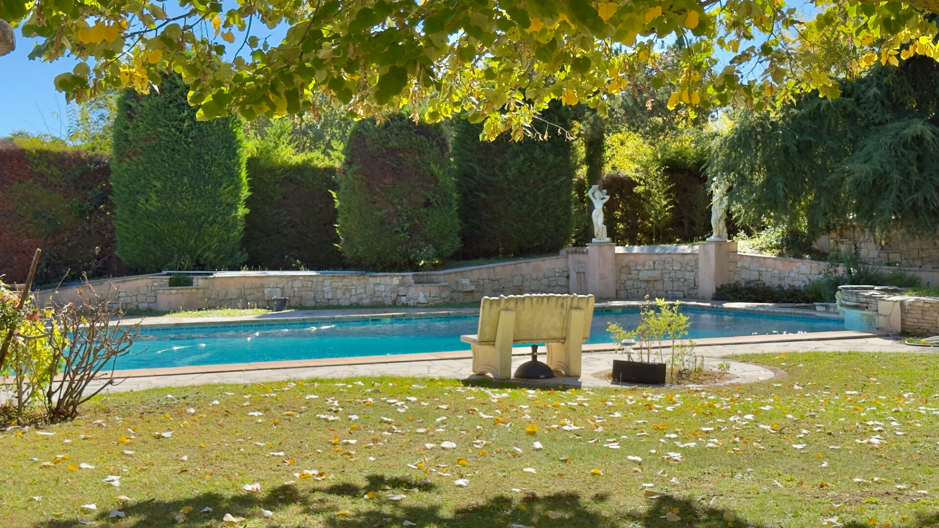 Belle demeure de 260 m2 sur terrain de 4000 m2 avec piscine et jacuzzi au calme, dans la verdure. Ce bien est composé d'une entrée spacieuse, d'une cuisine avec salle à manger, d'une grande pièce de vie de 56 m2 avec cheminée traversante, d'une chambre et sa salle d'eau ainsi que de trois autres chambres dont une suite parentale avec salle de bain. Une dépendance de 60 m2 à aménager ( pool house ou studio) Un grand garage ainsi qu'une buanderie et de nombreuses places de stationnement complètent ce bien. Une belle piscine avec jacuzzi et fontaines agrémentent le jardin paysagé. Cette maison est construite sur vide sanitaire, de plein pied, double vitrage, menuiserie aluminium ( certains volets sont électriques). Une chaudière récente au gaz alimente le système de chauffage. Très gros potentiel , travaux de mises au goûts du jour à prévoir Taxe foncière : 2800 euros DPE : en cours GES : en cours Prix honoraires agence inclus: 898 000 euros frais d'agence inclus honoraires à la charge du vendeur. RCS AIX 81457699700021 Bénéficiez d'un accès complet et exclusif à la visite 3D et à toutes les photos, descriptif détaillé du bien ou encore des informations sur le quartier directement sur notre site internet www.aixty.com