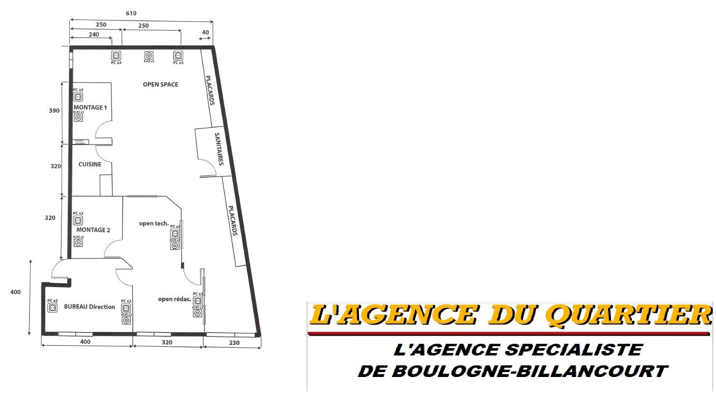 L'Agence du Quartier vous propose de prévisualiser ces bureaux en VRAIE VISITE 3D ! Rue Henri Martin, à proximité immédiate de la Porte de Saint-Cloud (métro ligne 9) et de toutes commodités, bureaux/espaces de travail/locaux de plan pied d'une surface de 109 m² comprenant deux entrées distinctes, grande pièce principale, 4/5 bureaux distincts, une cuisine, une salle d'eau avec WC aux normes PMR et de nombreux placards. Idéal pour co-working ou professions libérales. Chauffage et eau chaude électriques. Fenêtres double vitrage et volets électriques roulants. Disponibles immédiatement. DPE vierge. Honoraires d'agence : 30 % du loyer annuel HT HC Dépôt de garantie : 3 mois HT HC minimum Provisions sur charges : 100 euros environ. Bail précaire possible (max 23 mois). Révision annuelle du loyer. L'Agence du Quartier, 98 Rue Gallieni 92100 Boulogne-Billancourt