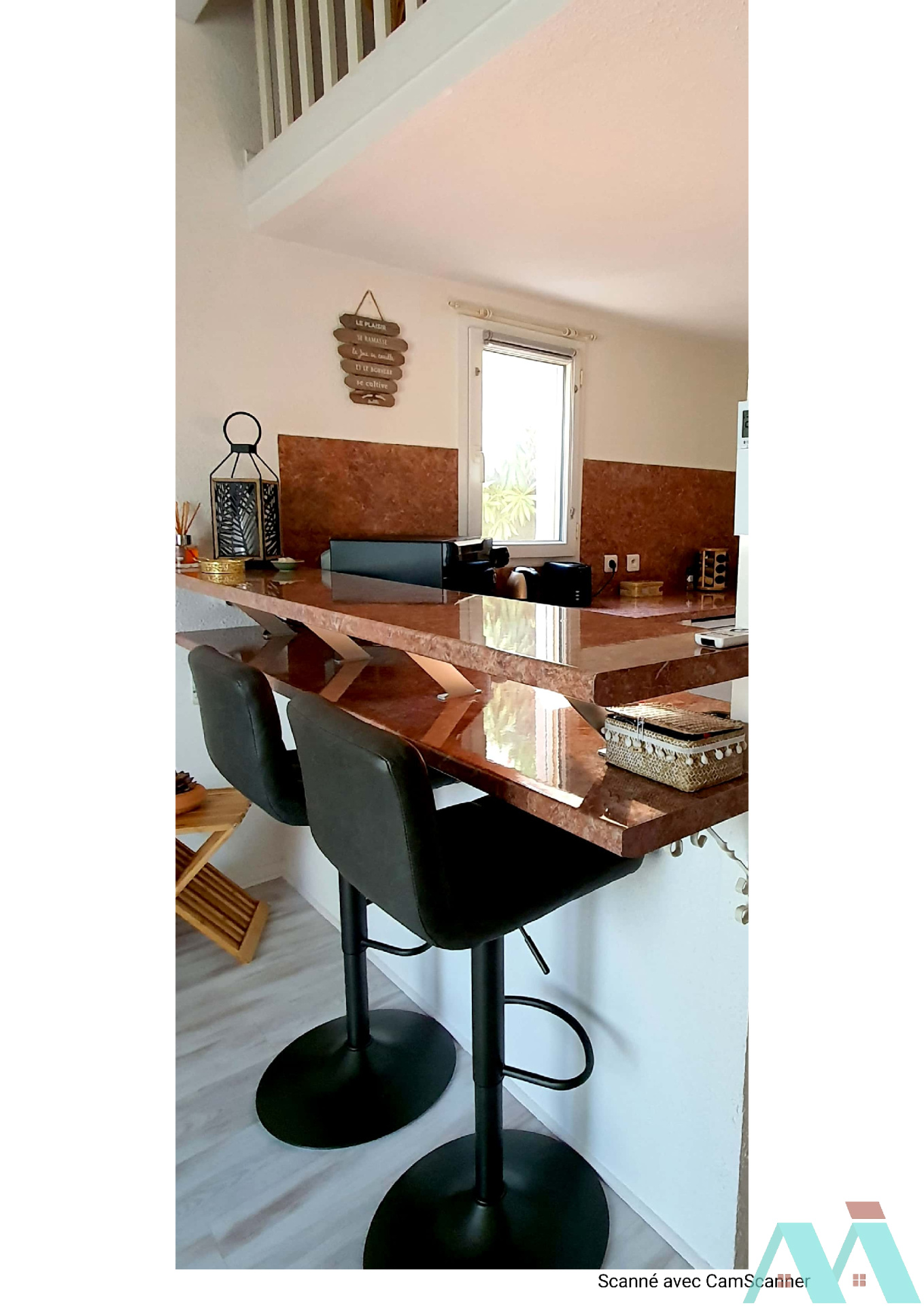 L'appartement comprend au rez-de-chaussée une pièce à vivre avec cuisine et salle de bains avec WC. A l'étage, une mezzanine faisant office de chambre. Vous pourrez profiter de son jardin privatif et de sa terrasse.