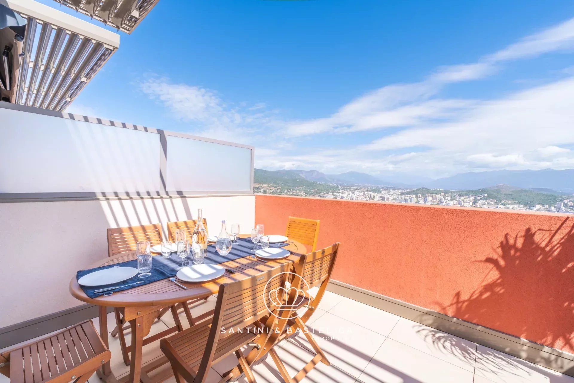 Vous bénéficierez également d'une belle terrasse de près de 20m² avec vue panoramique sur le golfe d'Ajaccio et les montagnes en arrière plan.