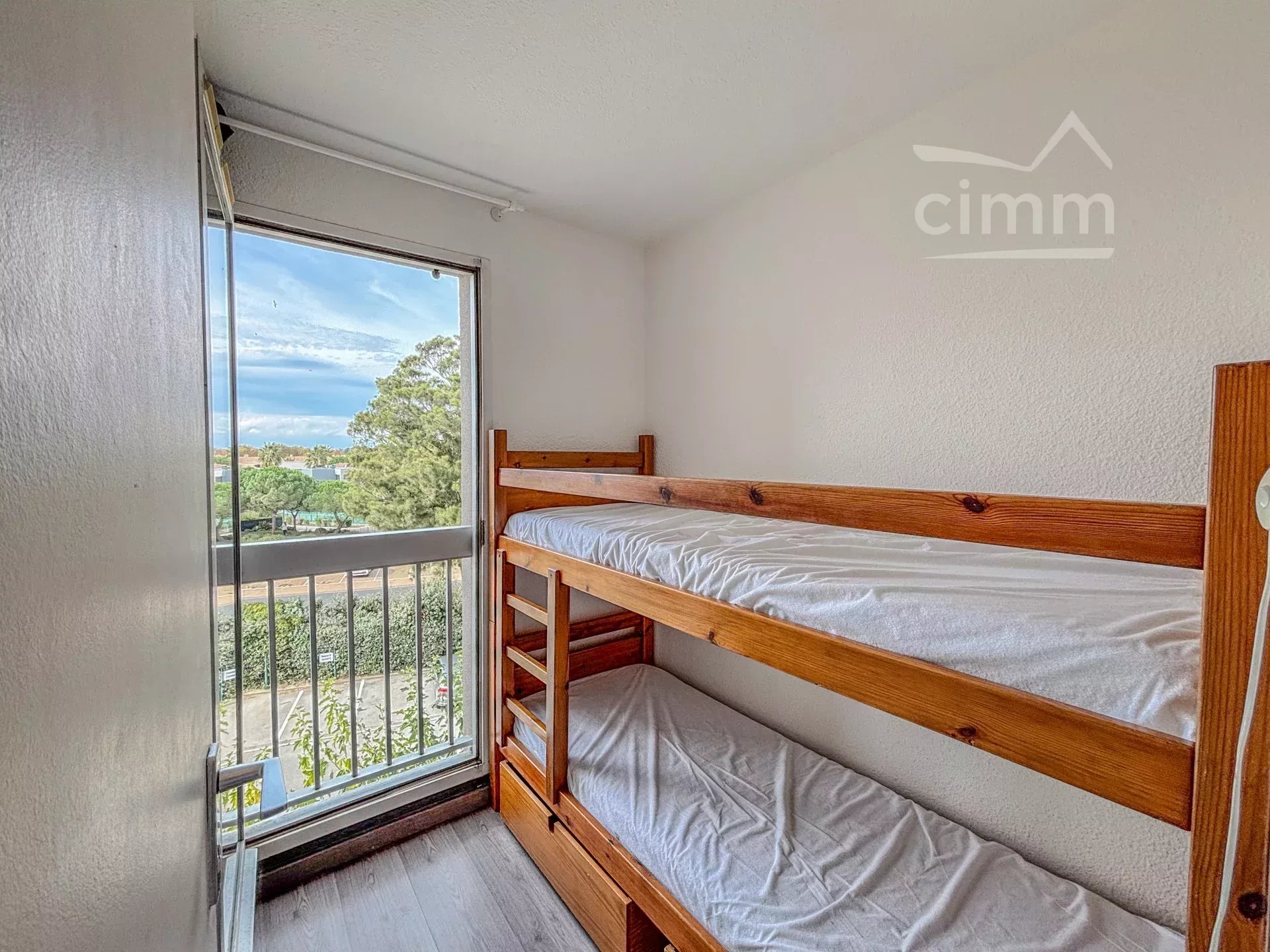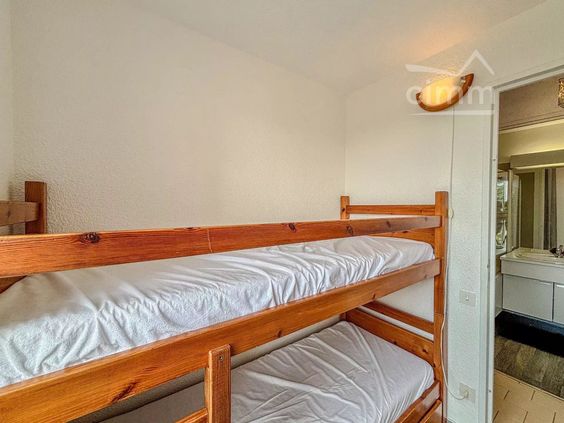 La cabine est aménagée avec des lits superposés et la salle de bain dispose d’un WC. L’appartement est vendu meublé et se situe au troisième étage d’une résidence sans ascenseur.