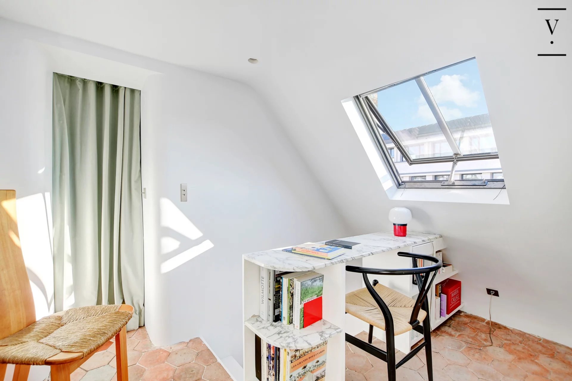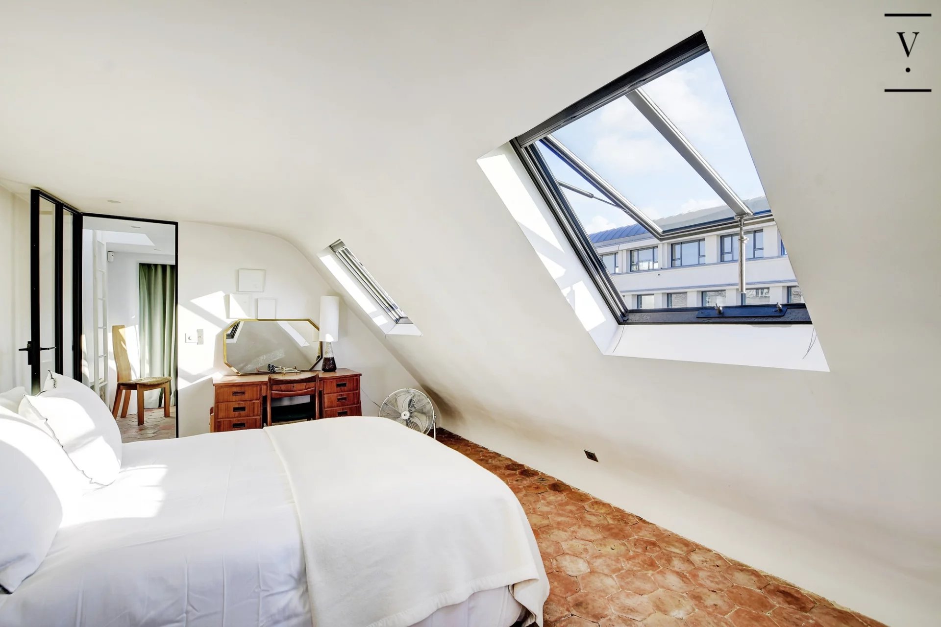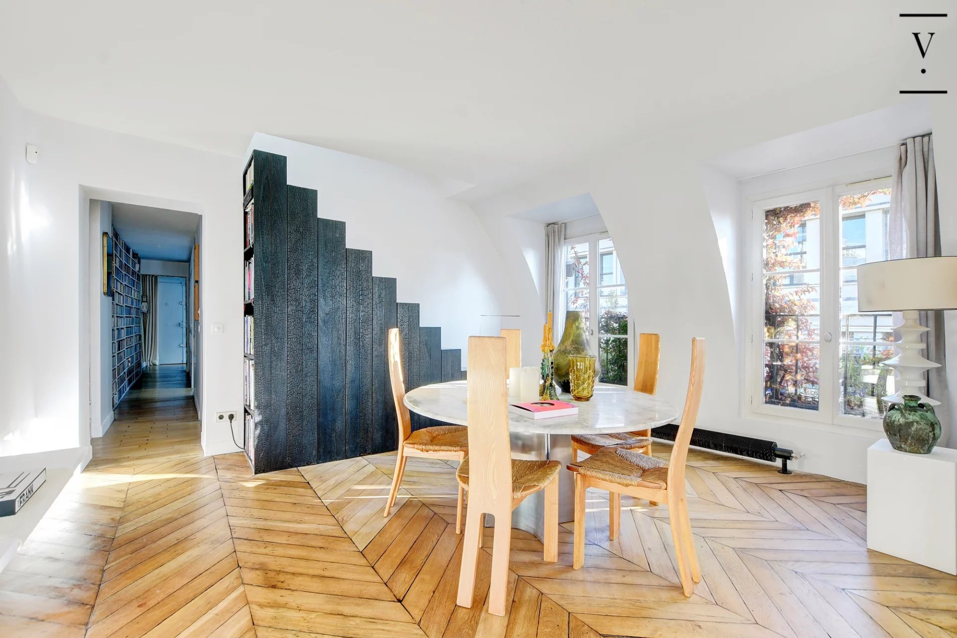 Entre la porte Saint Denis et le quartier des Petites Ecuries. Villaret Immobilier vous propose ce magnifique duplex entièrement rénové par architecte, situé aux derniers étages d'un bel immeuble ancien. D'une surface de 94m2, ce lieu unique se compose d'une entrée, d'un séjour avec cheminée et vues dégagée, profitant d'un agréable balcon, d'une cuisine indépendante, d'une chambre avec des rangements, d'une salle de bains avec toilette et d'une buanderie. A l'étage, un bureau et une chambre. Sublime appartement d'angle, avec vue dégagée, balcon et des prestations de grande qualité. Une chambre de bonne complète ce bien.