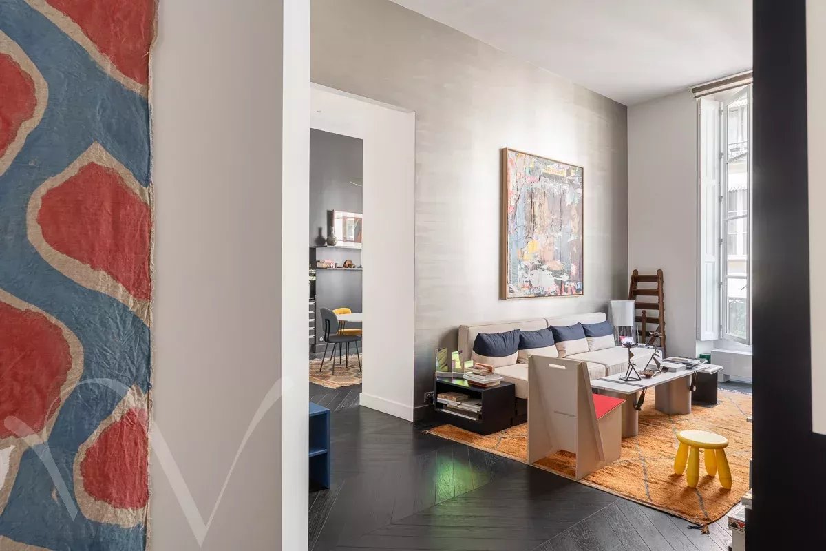 Saint Germain des Prés. Au sein d'un hôtel particulier XVIIIe, à l'étage noble avec ascenseur (premier étage au-dessus de l'entresol), un ravissant appartement de 190 m² loi Carrez et 202 m² au sol composé d'une entrée, un salon, un petit salon (ou troisième chambre - la salle de douche est déjà présente), une suite comprenant une grande chambre avec sa salle de bains et ses dressings, une deuxième chambre avec sa salle de douche, une buanderie. Cet appartement traversant entre rue et cour est en parfait état, il est très élégant avec ses quatre mètres d'hauteur sous plafond, les moulures, le parquet point de Hongrie. Emplacement de premier ordre, entre la Place Saint Sulpice et le Jardin du Luxembourg.