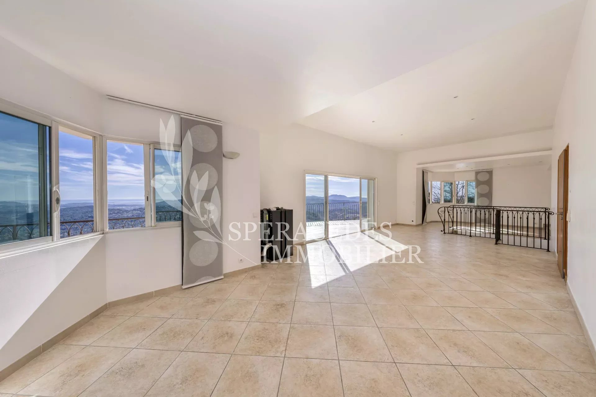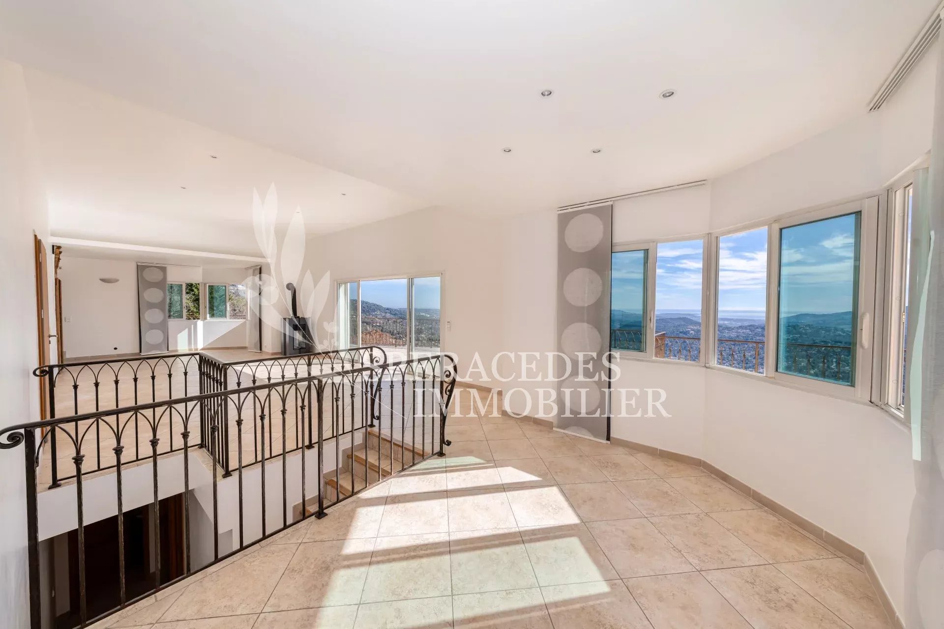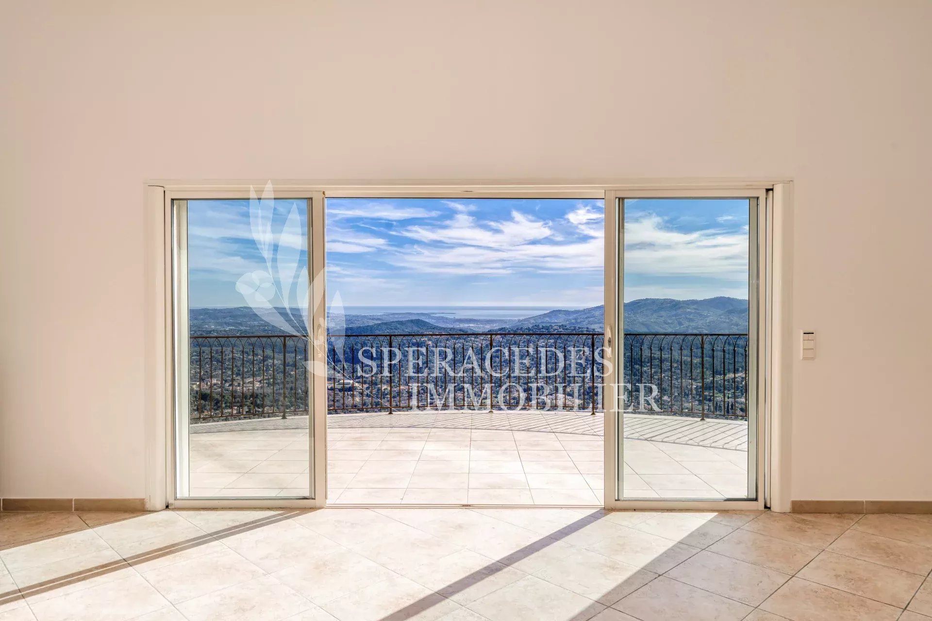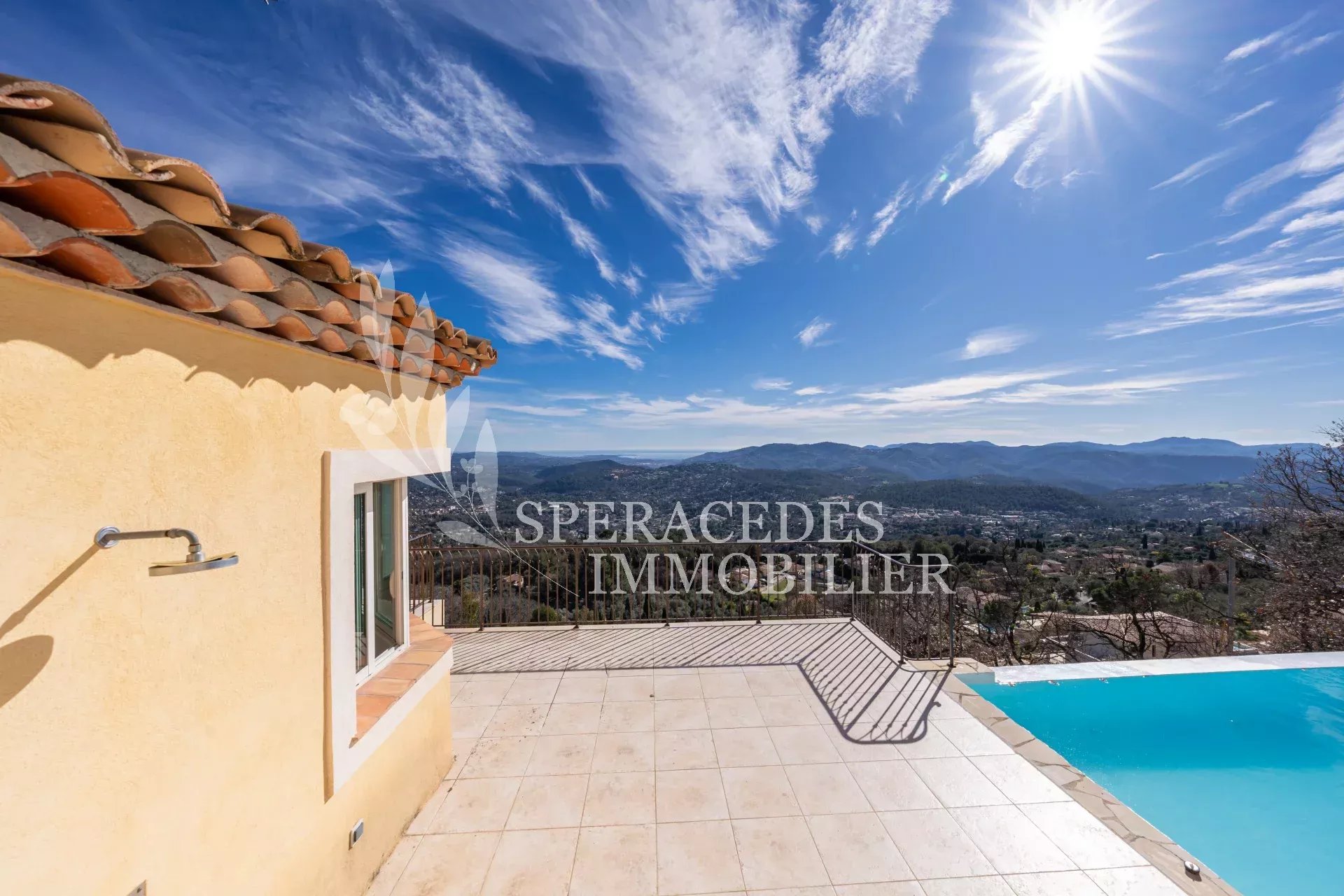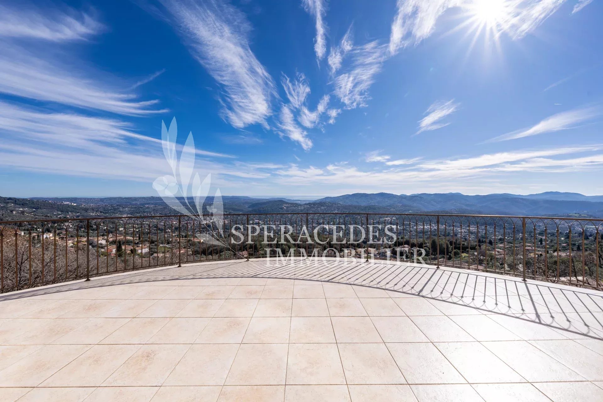 Magnifica villa d'architetto nuova di circa 210 m2 su due piani. Vista panoramica di 180° sulla baia di Cannes le colline di Tanneron e il lago St Cassien, senza vis a vis. Vasto soggiorno con immenza vetrata con accesso su 200m2 di terrazza di cui 60 m2 coperta. Grande e bella cucina americana arredata. 4 luminose camere tutte con vista mare. Belle prestazioni di prestigio: piscina a debordamento al sale, allarme, illuminazione esterna, due porte indonesiane in teck scolpite, fontana in pietra lavorata da un artista, 120 ml di ferro battuto di stile anziano. Riscaldamento elettrico con climatizzatore. Garage per due veicoli. Calma assoluta.