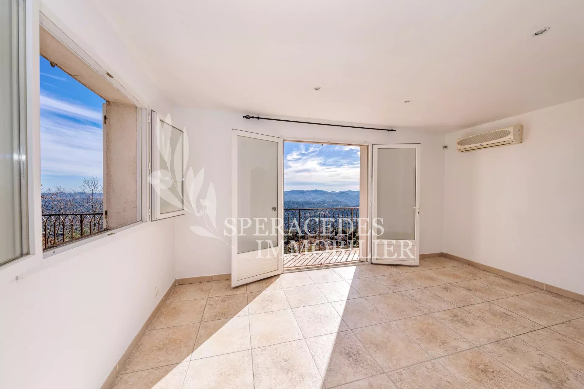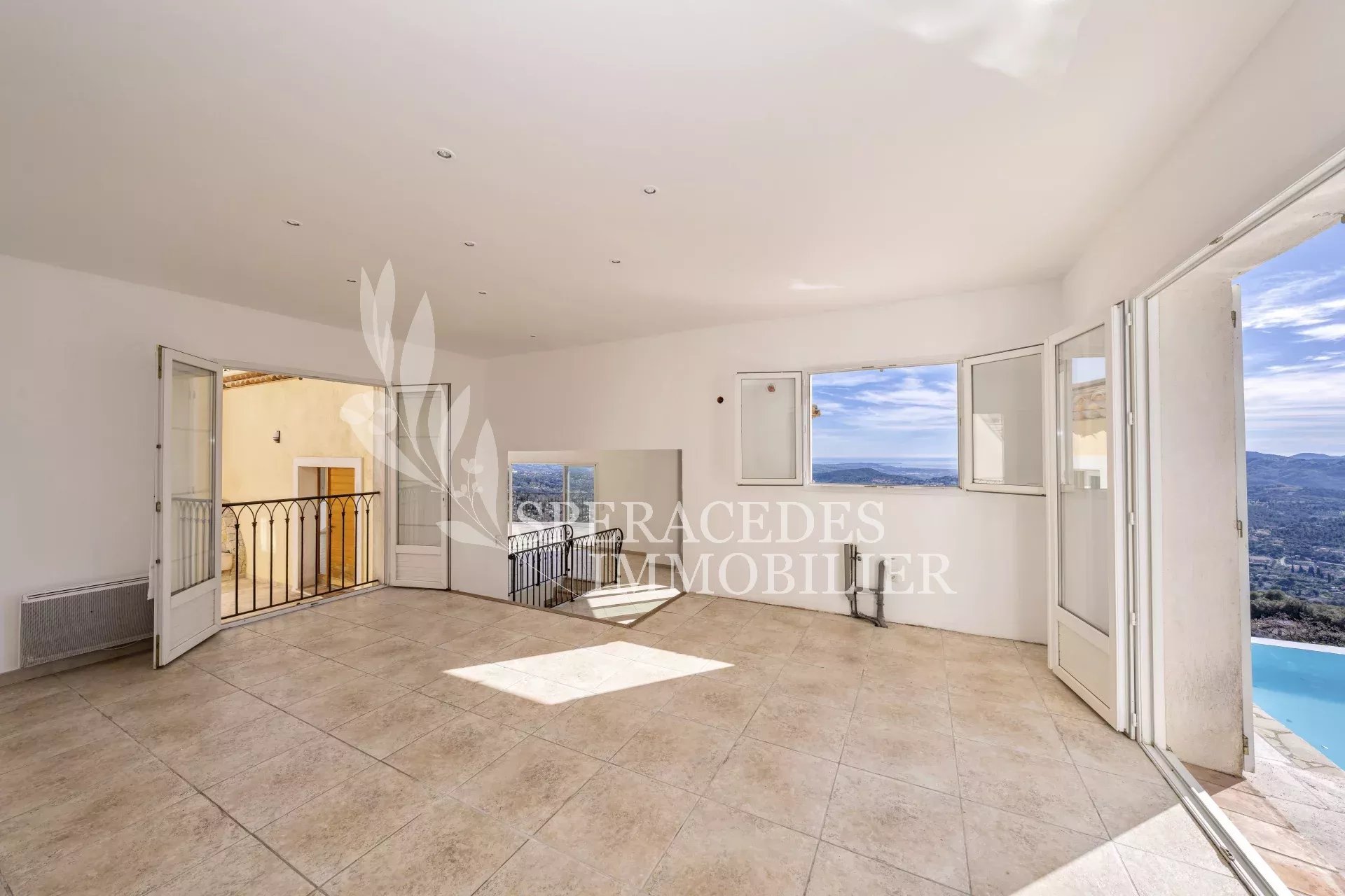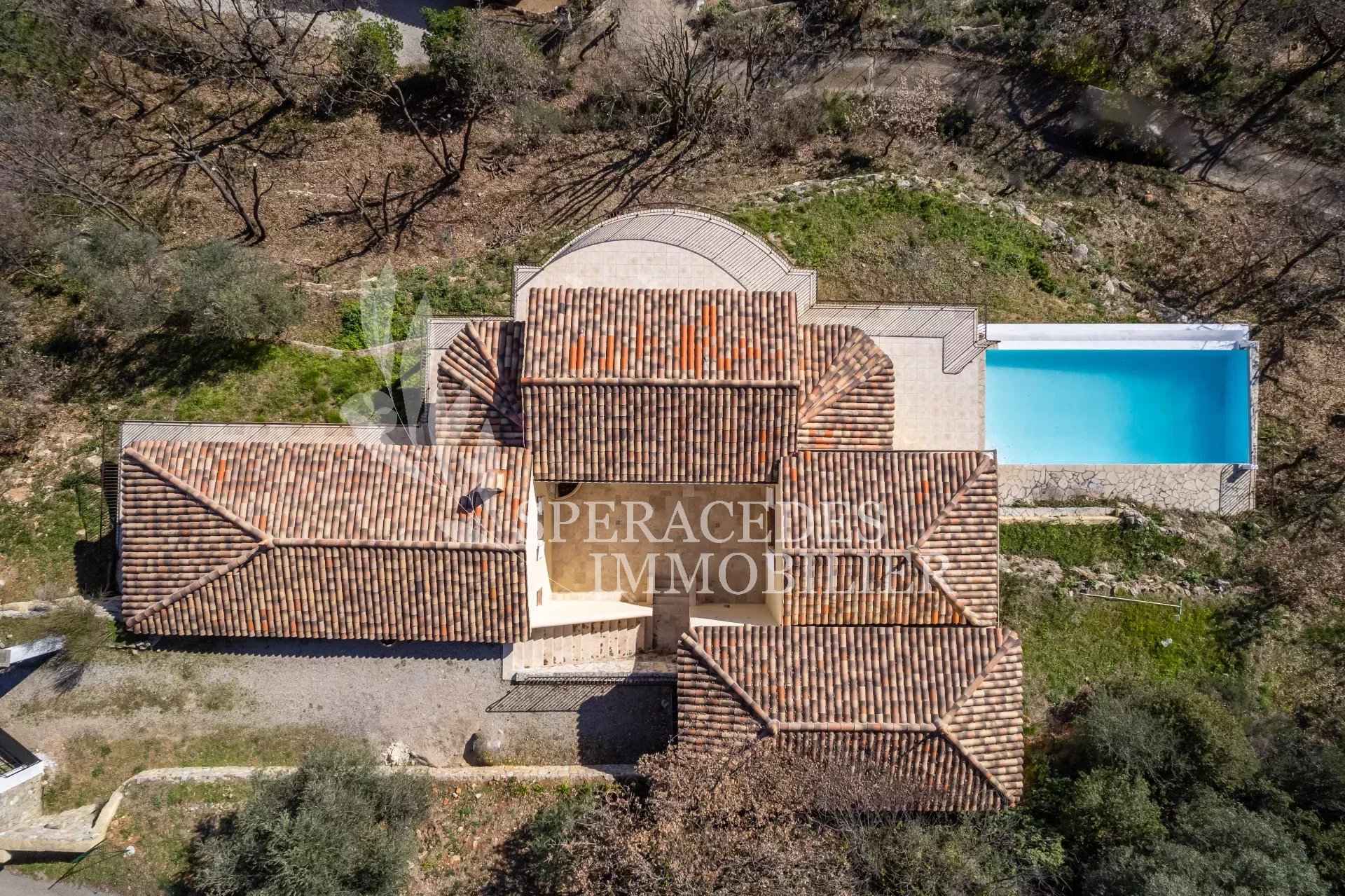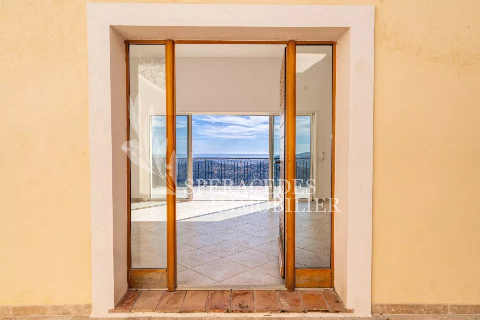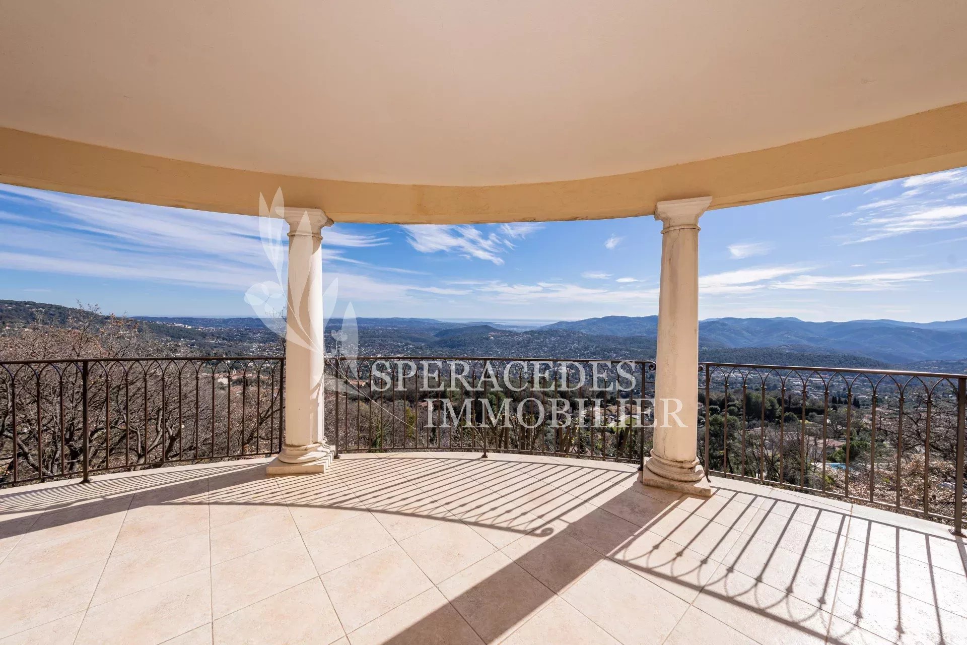 Magnifica villa d'architetto nuova di circa 210 m2 su due piani. Vista panoramica di 180° sulla baia di Cannes le colline di Tanneron e il lago St Cassien, senza vis a vis. Vasto soggiorno con immenza vetrata con accesso su 200m2 di terrazza di cui 60 m2 coperta. Grande e bella cucina americana arredata. 4 luminose camere tutte con vista mare. Belle prestazioni di prestigio: piscina a debordamento al sale, allarme, illuminazione esterna, due porte indonesiane in teck scolpite, fontana in pietra lavorata da un artista, 120 ml di ferro battuto di stile anziano. Riscaldamento elettrico con climatizzatore. Garage per due veicoli. Calma assoluta.