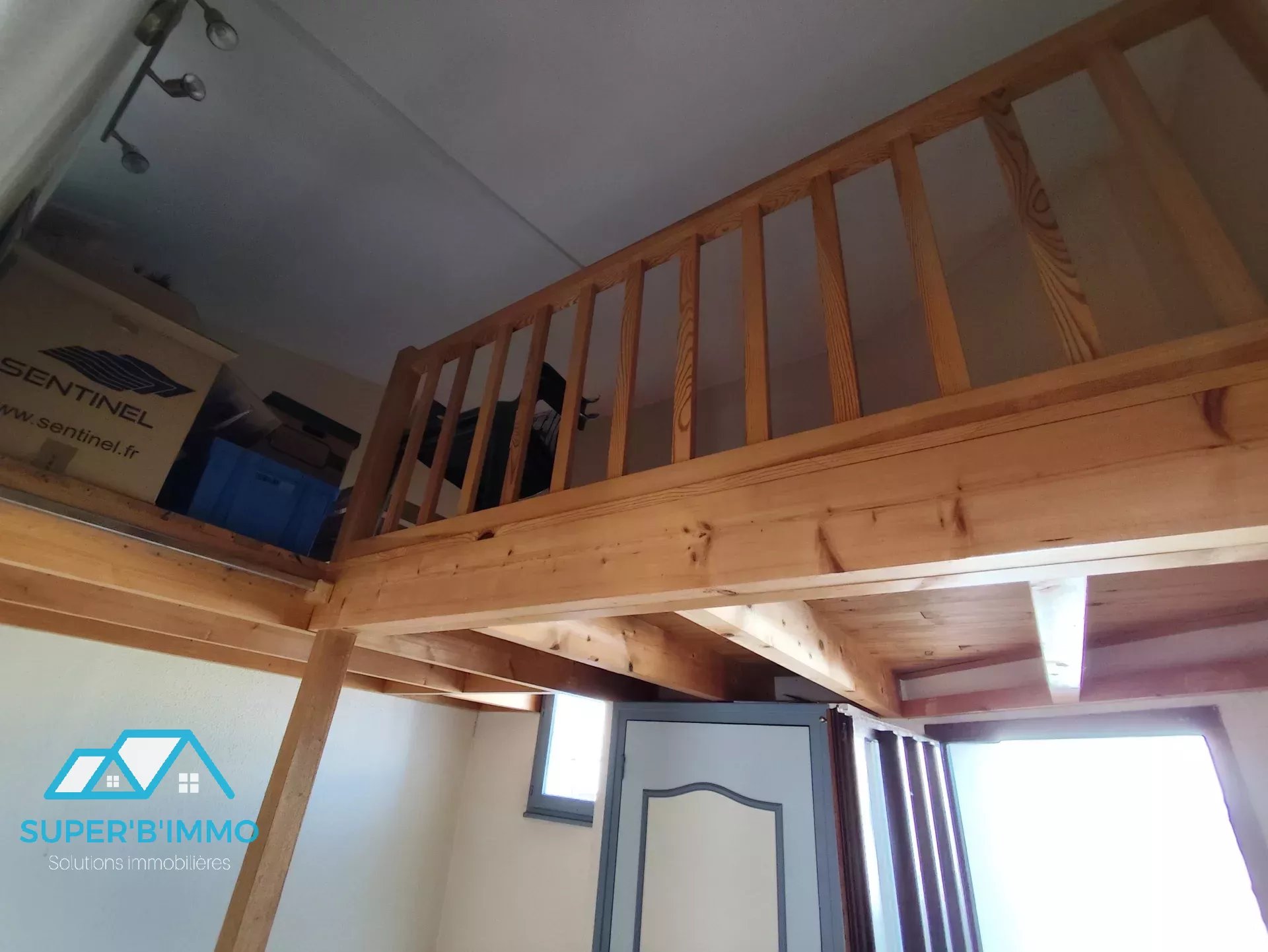 Un escalier permet l'accès a 2 chambres et une salle de bain. Une mezzanine permet du rangement .