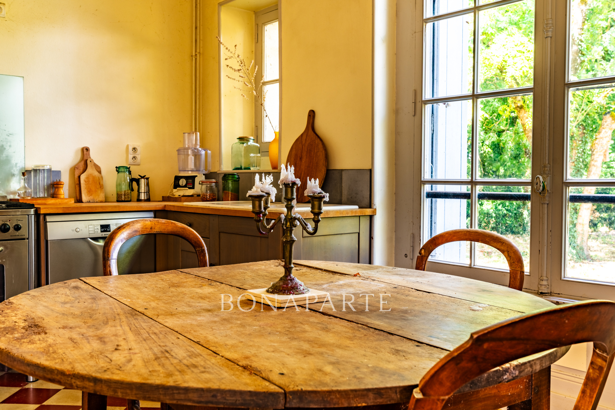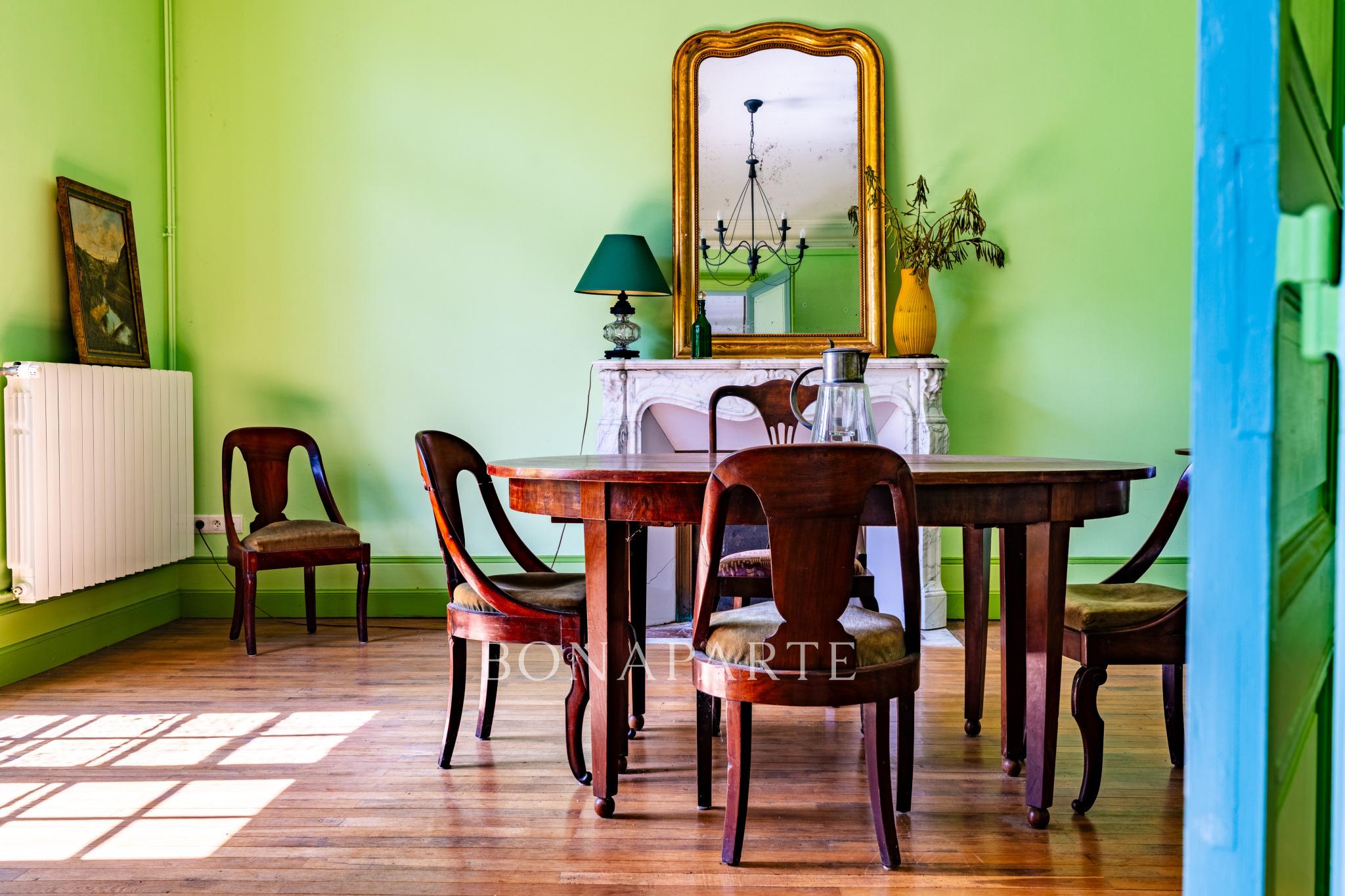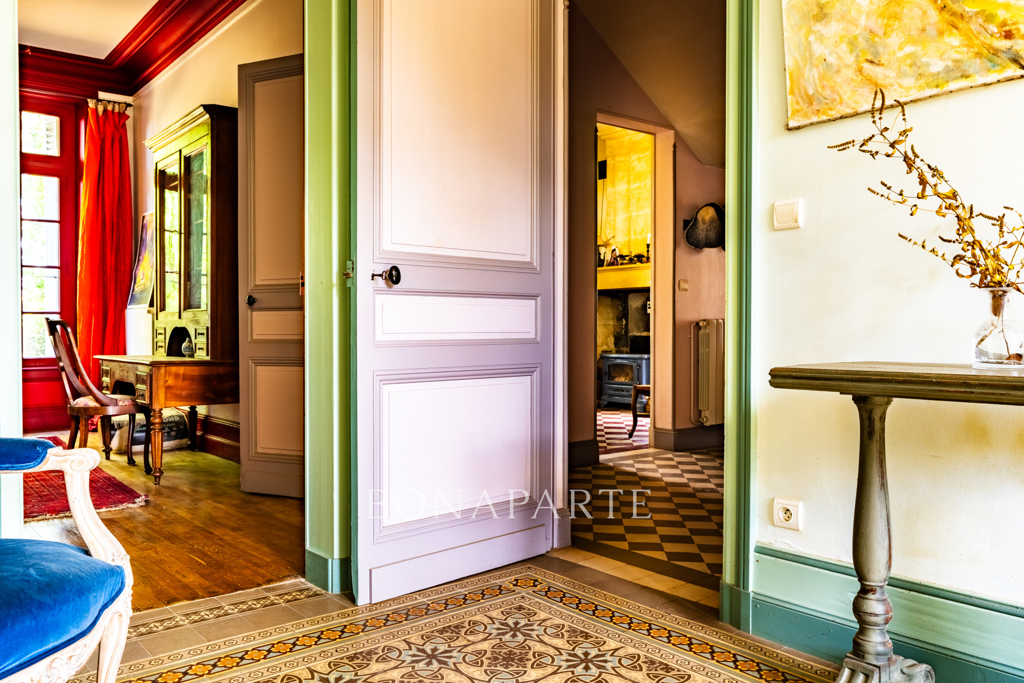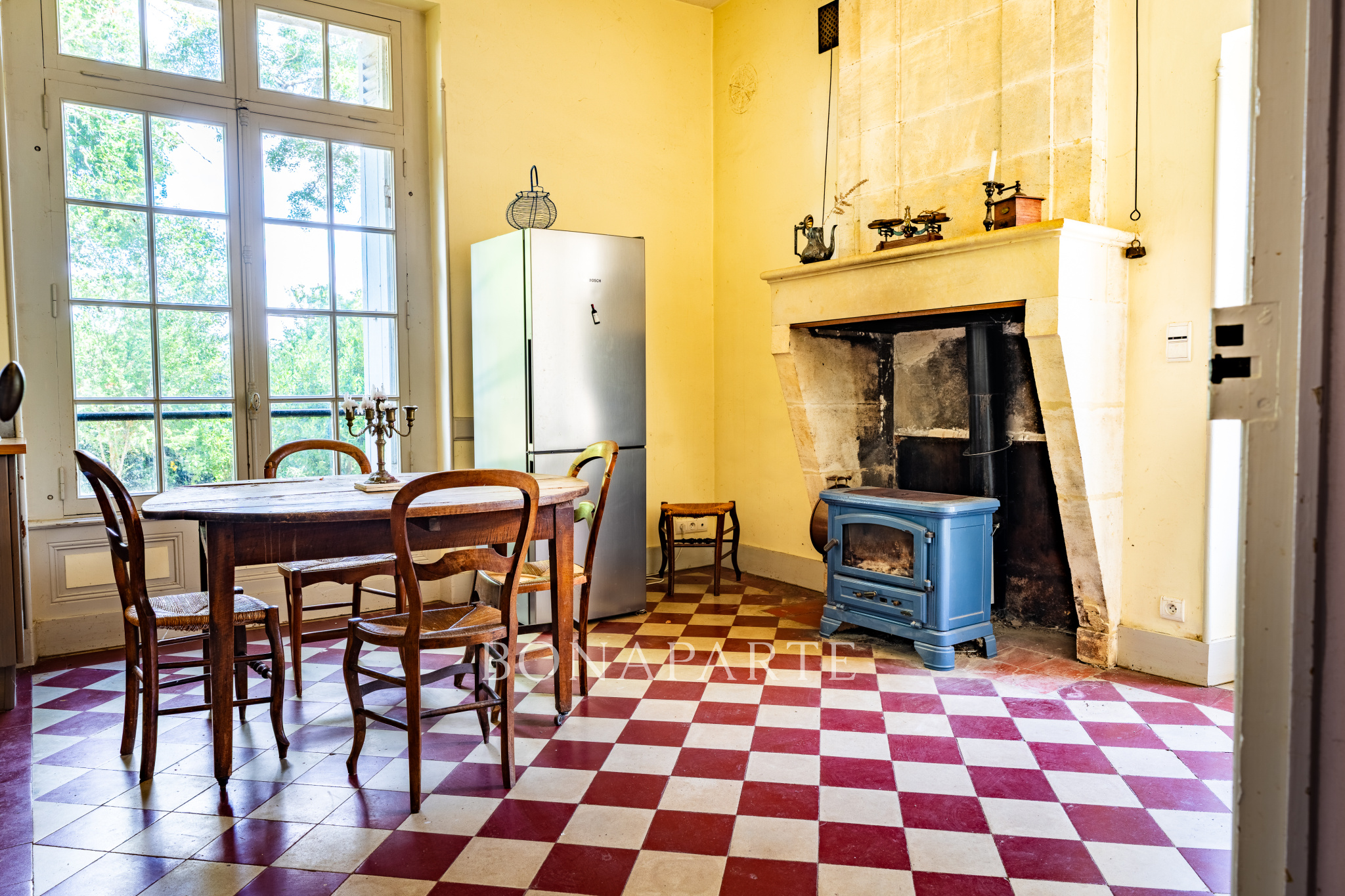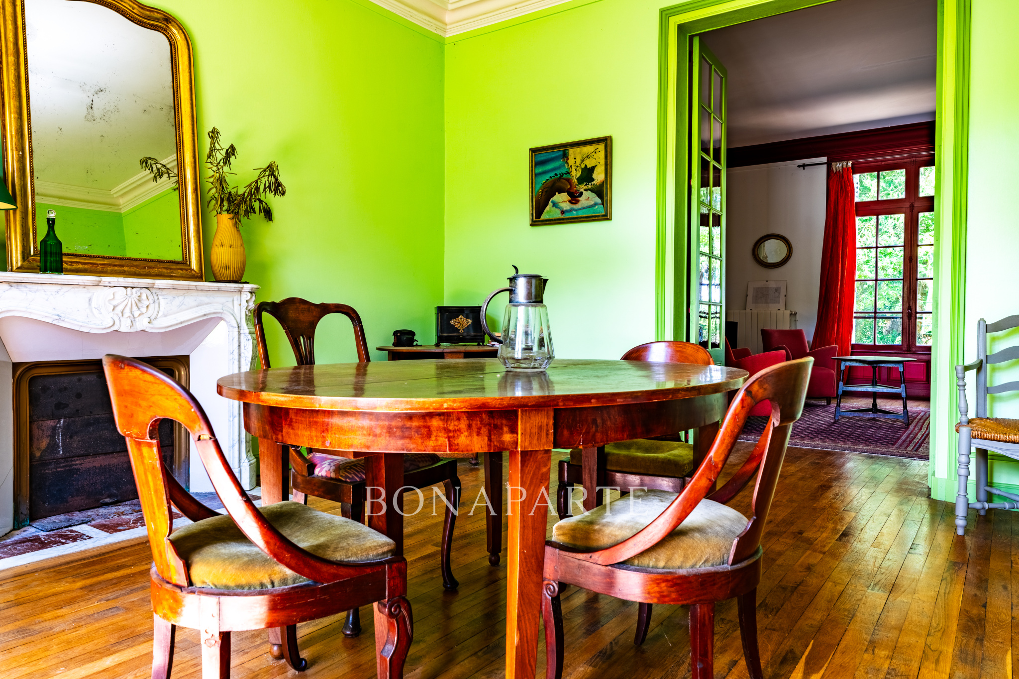 Maison de Maître : entrée desservant : bureau / petit salon, salle à manger, grand salon, cuusine équipée d'un poêle à bois, toilettes. A l'étage : palier, toilettes séparées, salle de bain avec douche, 4 vastes chambres, une autre plus intimiste, bibliotthèque.