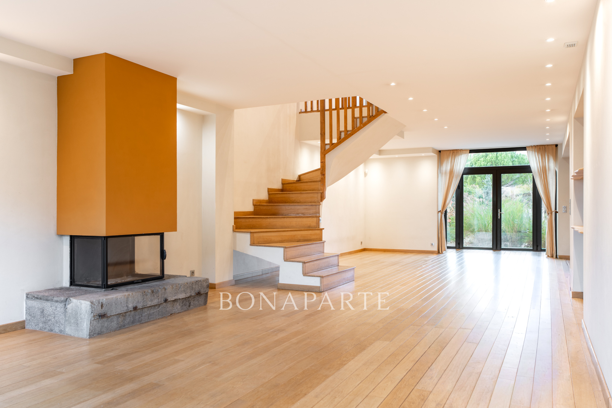 Elle bénéficie de volumes généreux et lumineux. Le rez-de-chaussée s'ouvre sur un vaste espace de vie comprenant un salon avec cheminée, un séjour et une cuisine ouverte entièrement équipée, parfait pour recevoir et partager des moments conviviaux.