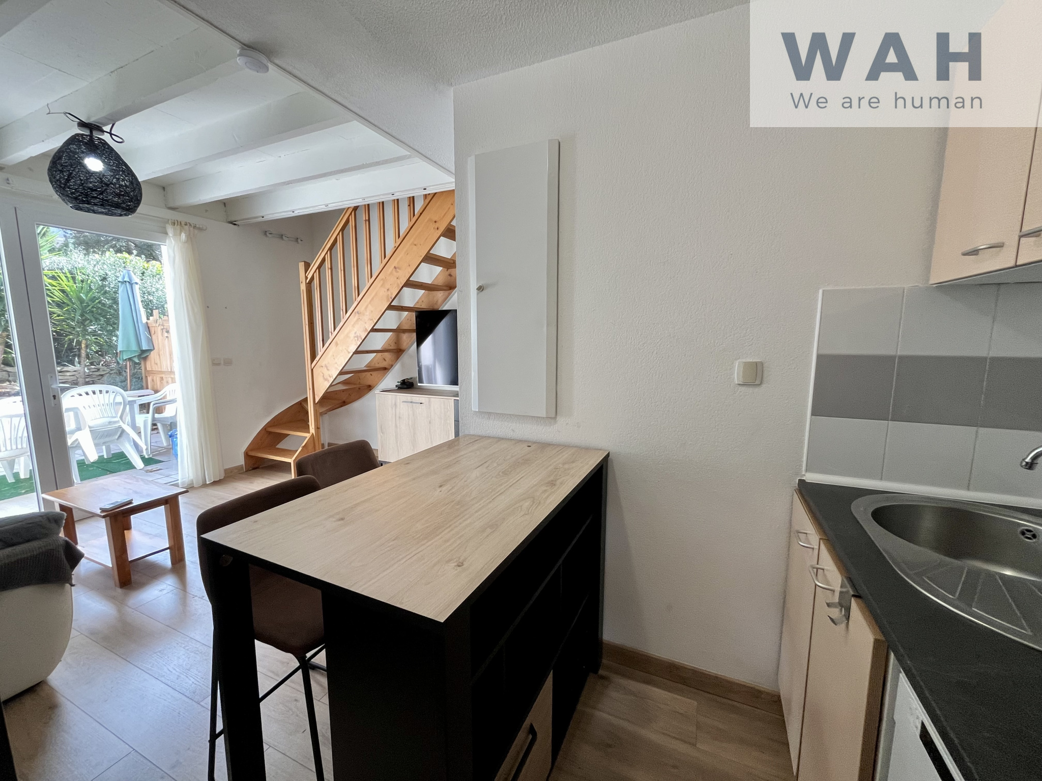 MAISON d'environ 31m2 comprenant au rez de chaussée: séjour avec cuisine ouverte, salle d'eau avec wc et une TERRASSE d'environ 15m2 avec store banne. A l'étage 2 pièces amenagées en chambre.