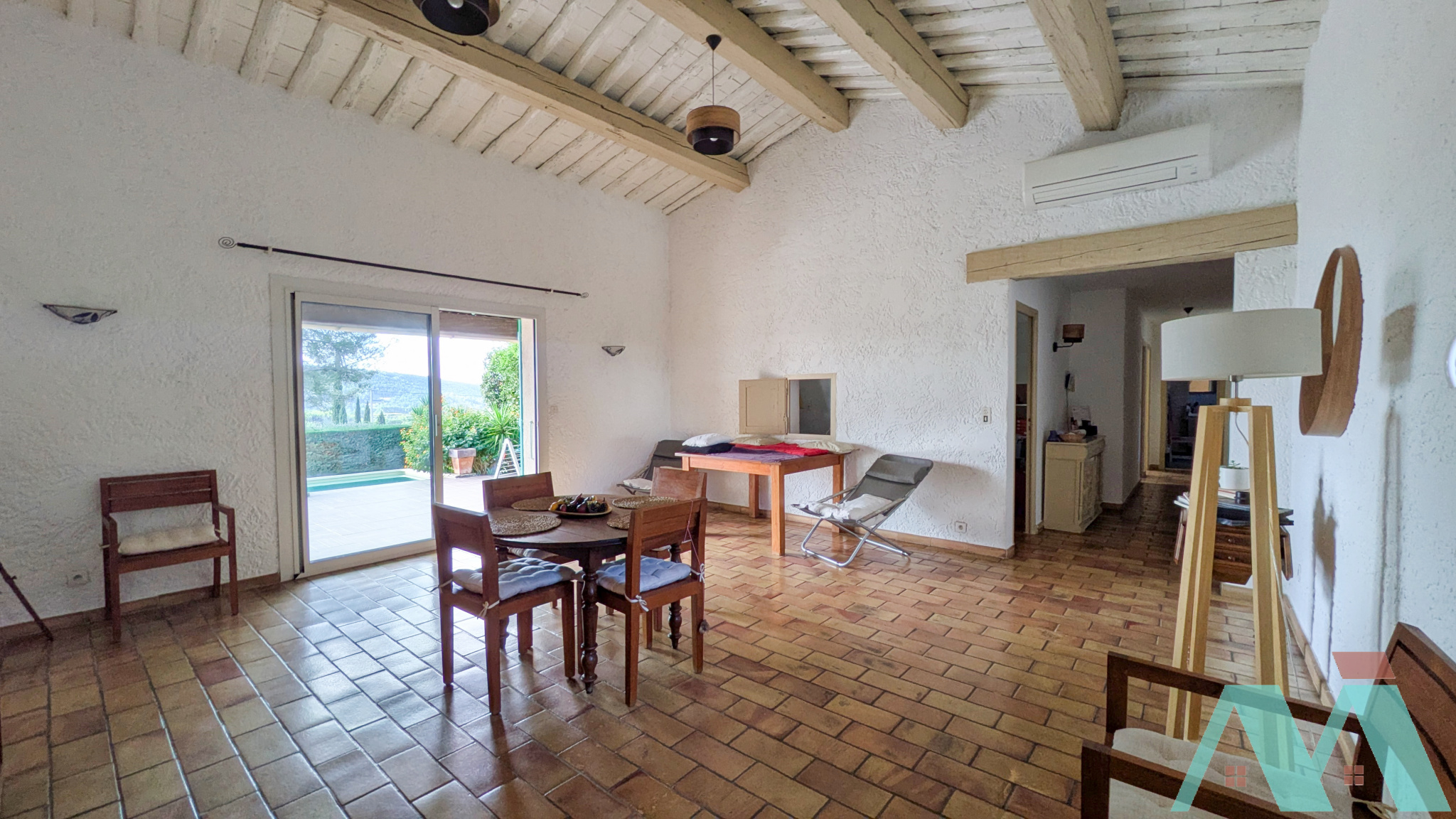 À l'extérieur, le charme opère : une grande terrasse plein sud vous invite à la détente ou aux repas d'été, face à une piscine rénovée, entourée de verdure. La vue est splendide et vous ne souffrirez d'aucun vis-à-vis.