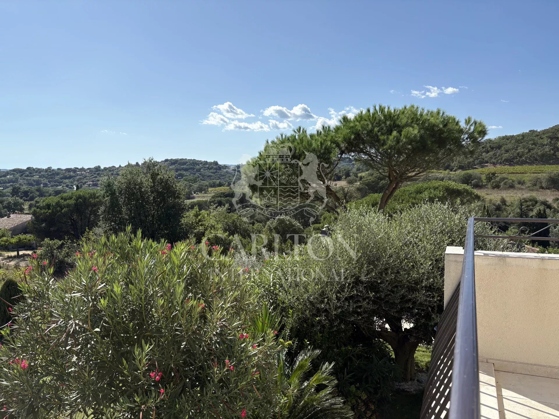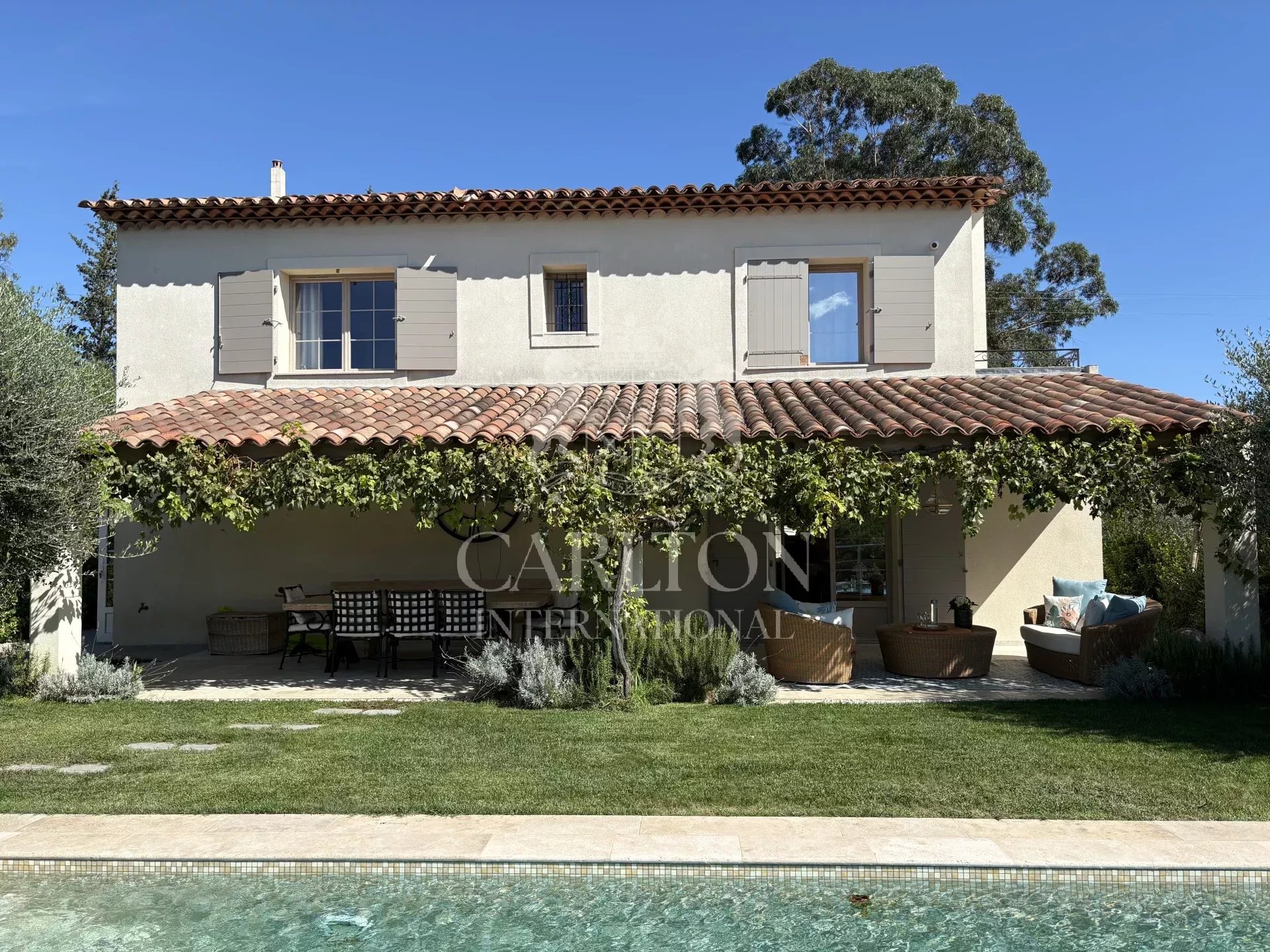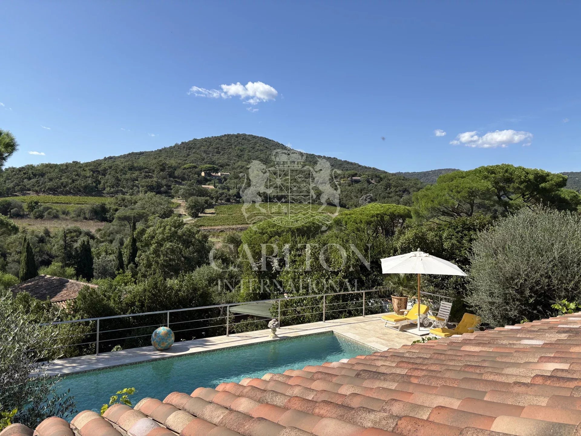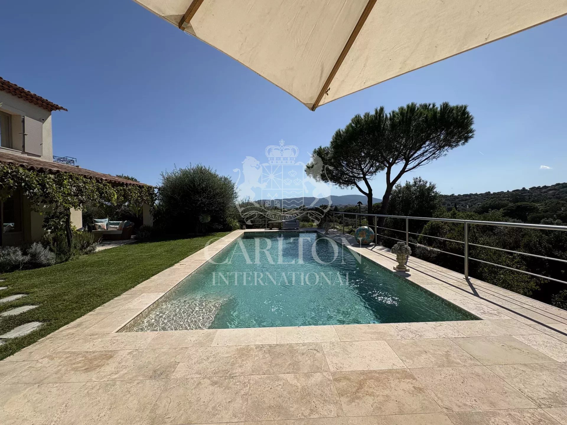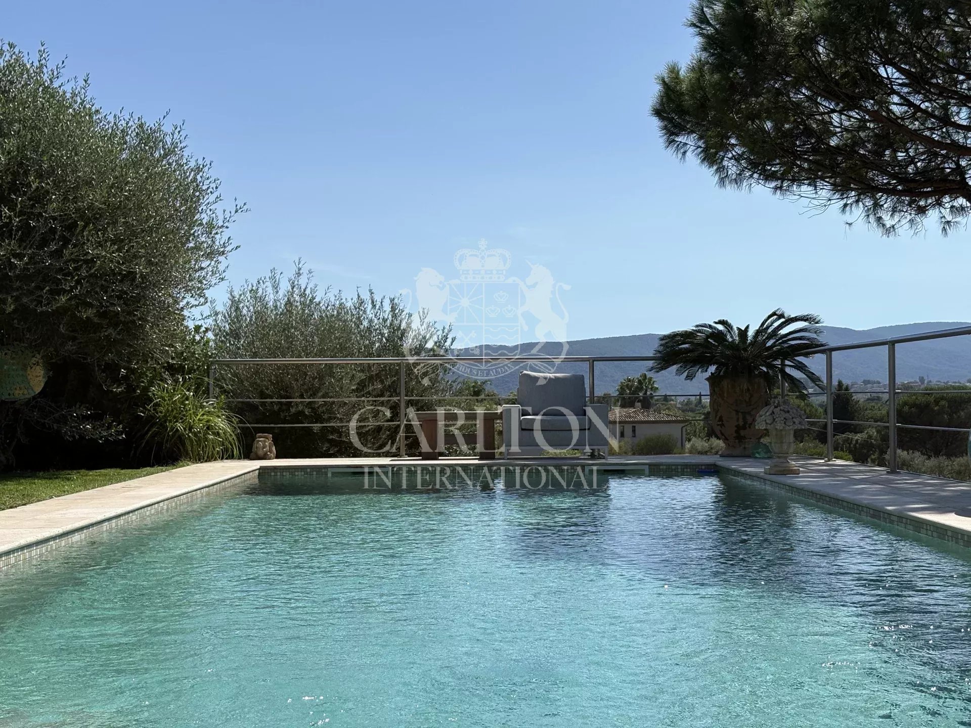 Dans un quartier résidentiel prisé de Grimaud, cette superbe villa néo-provençale près de 180 m² allie à la perfection le charme intemporel de la Méditerranée à un design moderne raffiné. Son portail automatique s’ouvre sur une allée pavée en pierre menant à un abri couvert et à un garage. Dès l’entrée, l’élégance de la propriété s’impose : le vaste séjour communique harmonieusement avec une cuisine américaine entièrement équipée. De larges baies vitrées baignent l’intérieur de lumière et s’ouvrent sur une vaste terrasse dominant la piscine, offrant une vue panoramique époustouflante sur le château emblématique de Grimaud. L’exposition ouest idéale de la villa permet de profiter chaque soir des sublimes couchers de soleil. À l’étage, l’espace nuit propose quatre chambres élégamment décorées et trois salles de bains, chacune pensée pour le confort et l’intimité. Pour accueillir vos invités, un charmant studio indépendant offre praticité et discrétion. Les prestations incluent également un grand garage avec buanderie et cave. Le jardin paysager abrite un agréable verger de fruitiers et des oliviers. Les vues sont remarquablement dégagées, embrassant la campagne et le village médiéval de Grimaud, dans un cadre serein et préservé. Malgré son atmosphère paisible, la propriété se situe à seulement dix minutes des plages de sable et de l’effervescence de Saint-Tropez. Rénovée en 2014, la villa se présente en excellent état, à l’intérieur comme à l’extérieur, et associe une construction semi-traditionnelle provençale aux meilleurs conforts contemporains : climatisation intégrée, double vitrage, arrosage automatique, façade soigneusement enduite et toiture en tuiles classiques. Cette opportunité offre non seulement une demeure d’une qualité exceptionnelle, mais aussi un art de vivre unique au cœur du Golfe de Saint-Tropez.