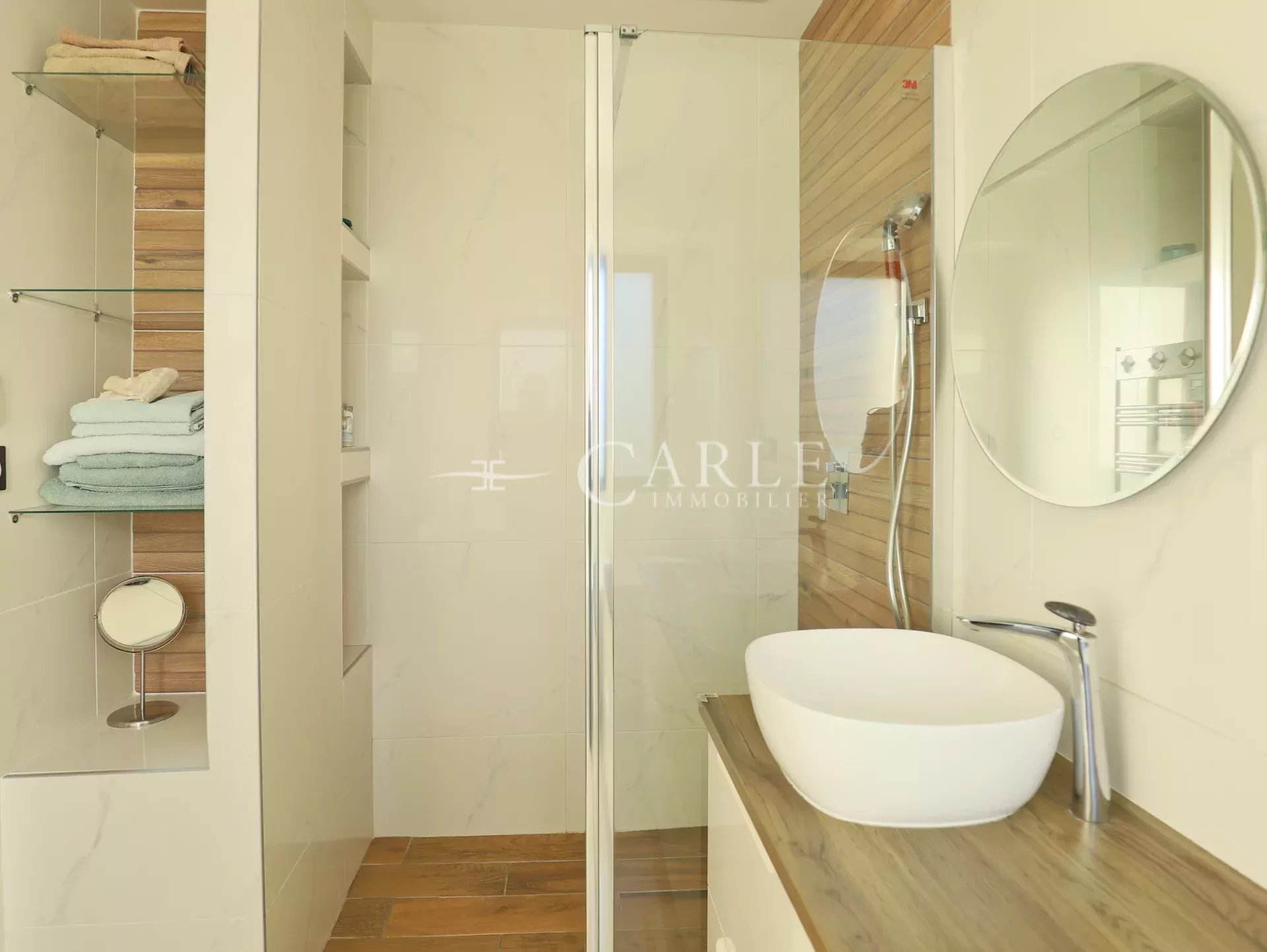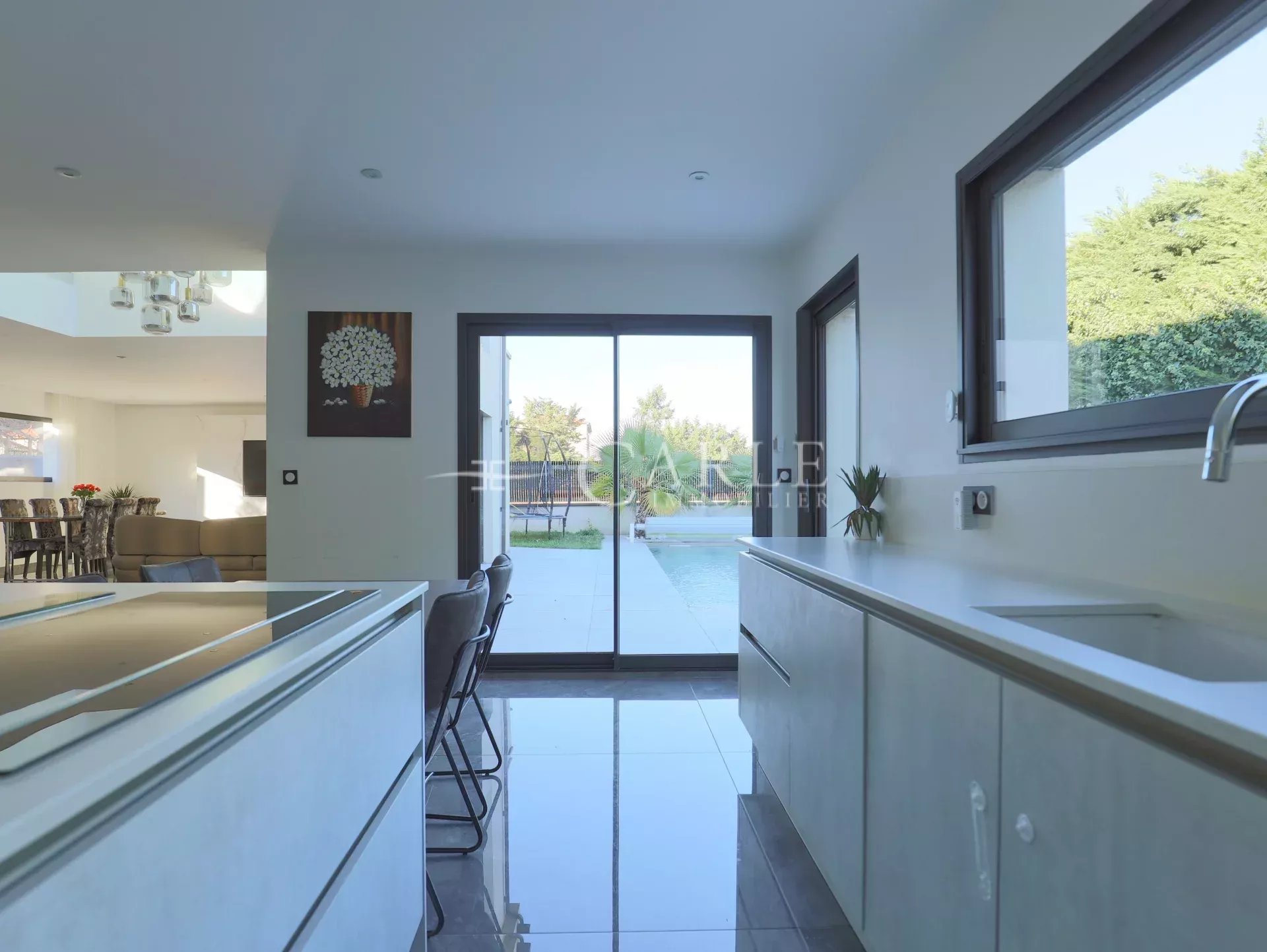 L’ensemble d’une surface de plus de 77 m² offre une luminosité exceptionnelle et une continuité naturelle vers le jardin et la piscine chauffée.