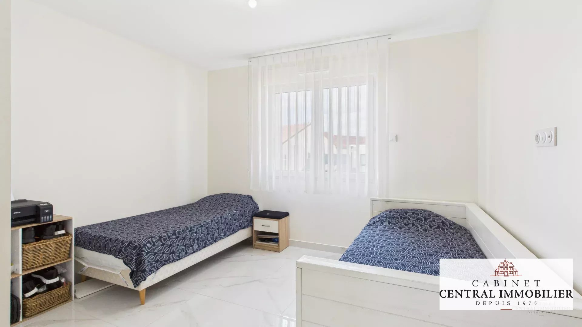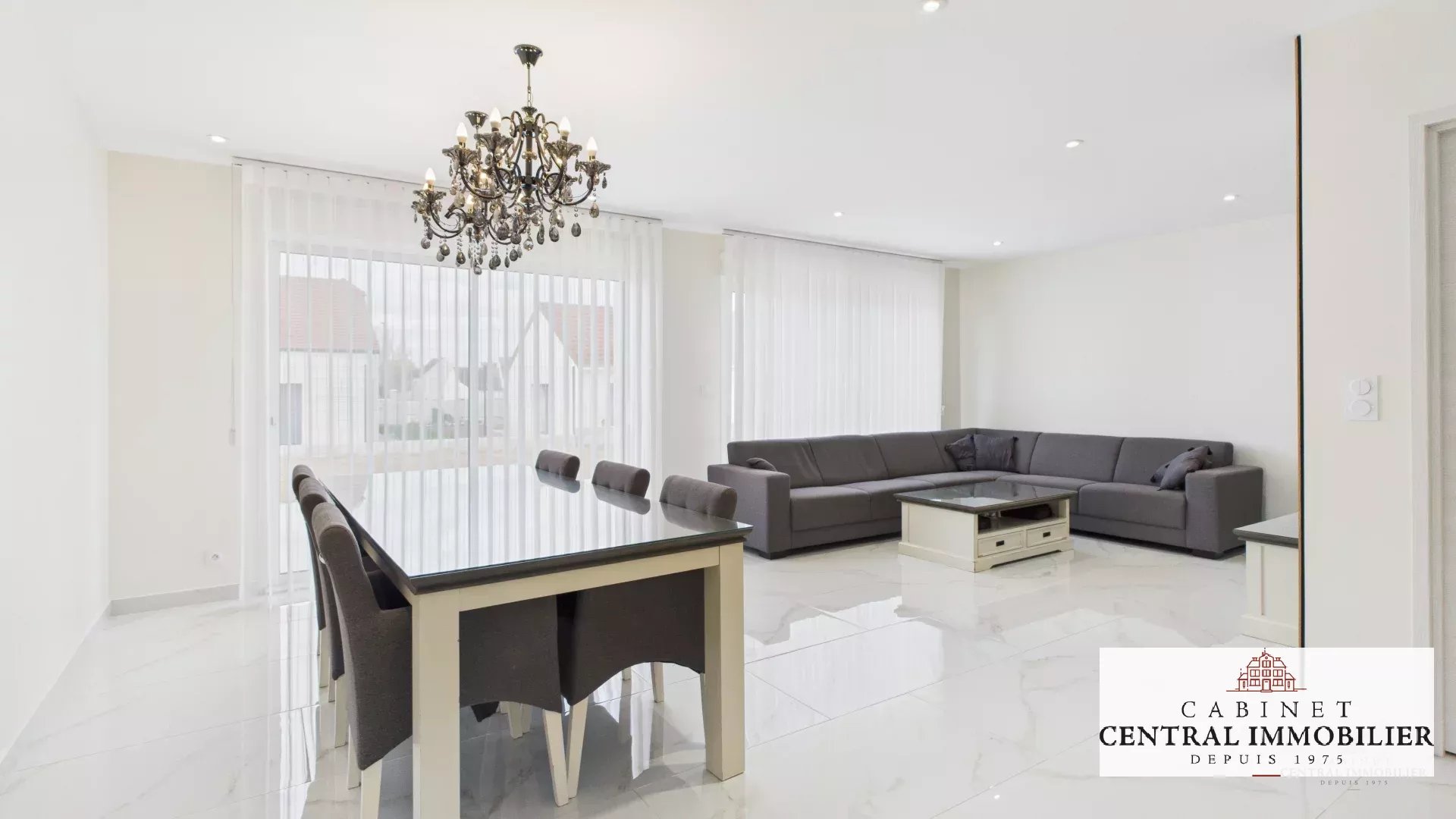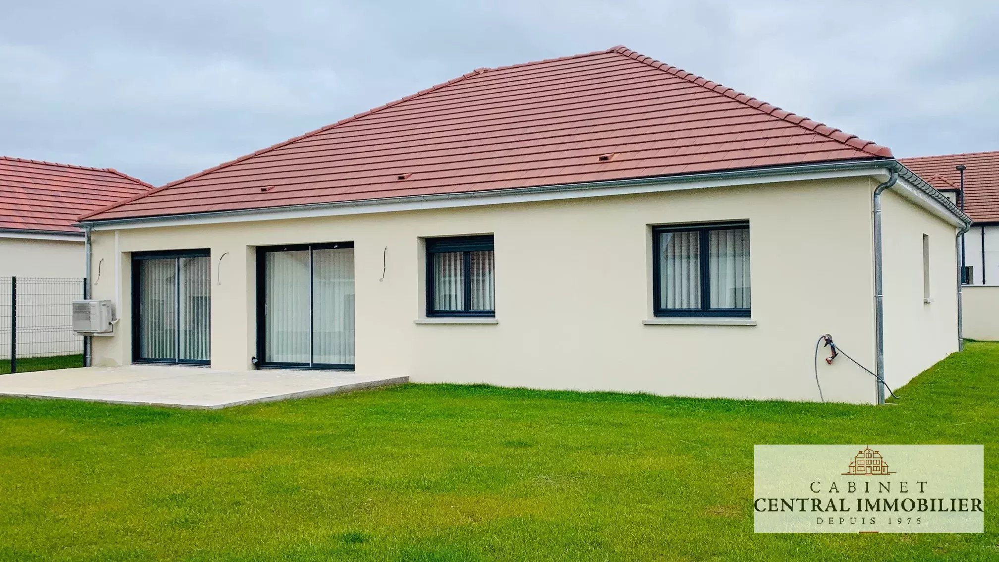 Maison comprenant : entrée sur couloir carrelé avec placards, séjour salon carrelé avec cuisine aménagée équipée et baies vitrées de 44,30m² accès terrasse, suite parentale (chambre carrelée de 12,90m², salle d'eau carrelée avec double vasques et sèche serviettes de 4,90m², wc, dressing de 4,40m²), 2 chambres carrelées avec placards de 11m² et 13,70m², salle d'eau carrelée avec double vasques, wc et sèche serviettes de 6,70m². Garage carrelé de 22,70m² avec porte motorisée et coin buanderie. Chauffage au sol par PAC air/eau. Double vitrage. Volets roulants électriques. Terrain clos de 500m².