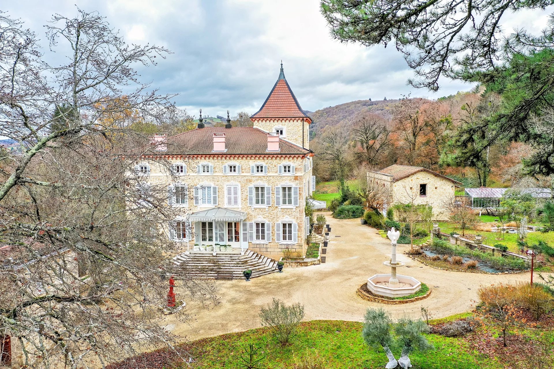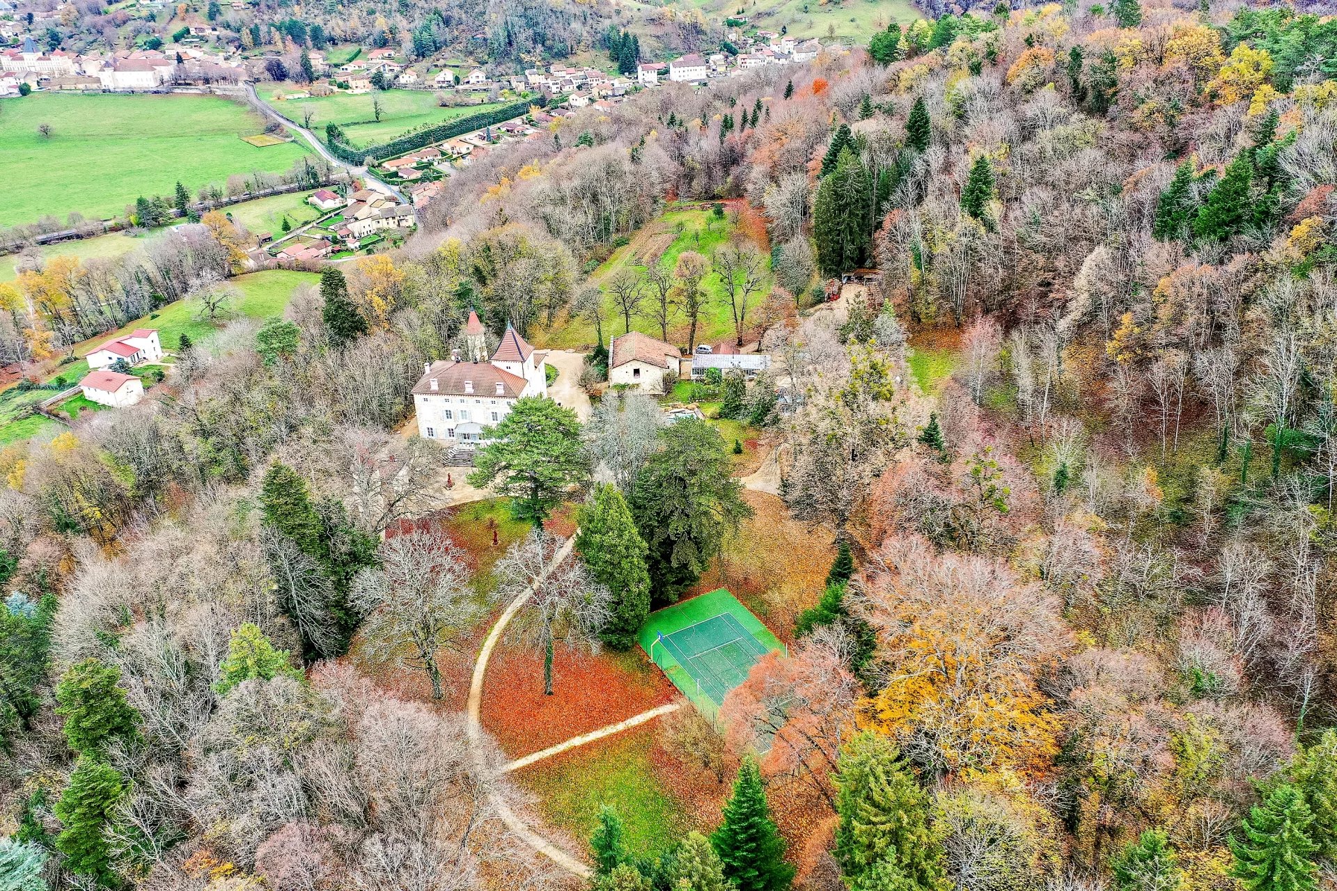 Domaine discret, situé dan un village avec commodités et commerces. Grace à sa position dominante, la vue est très lointaine. A quelques kilomètres de l'aérodrome, golf et Bourg en Bresse, 60km de Lyon. Ce lieu unique est composé d'un château familiale comprenant 20 pièces, d'une maison de gardiens, d'une maison d'invités, d’une chapelle, de son pigeonnier, d’un studio pour le personnel, et de ses dépendances. L'ensemble des bâtiments, dans un état exceptionnel, a été entièrement rénové dans le respect des savoirs faire, tout en alliant le confort actuel ( le chateau est équipé d'un monte charge, volets automatisés, sécurité). Dans le parc, d'environ 12hectares, vous découvrez un bassin romain pour se détendre, des terrasses, un court de tennis, un potager, une serre chauffée.