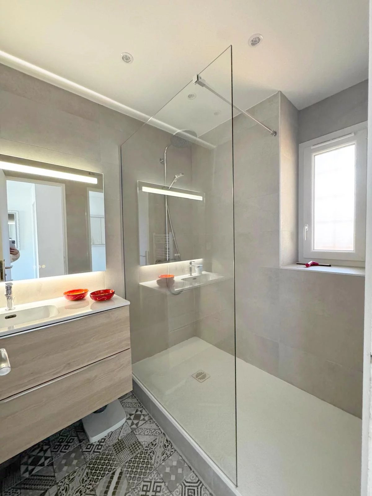 Proche de tout à pied, plages, commerces, médecin, pharmacie, dans une petite résidence de six appartements, un F3 qui ressemble à un programme neuf : rénové du sol au plafond, installation électrique, cuisine et salle d'eau neuves, climatisations neuves.