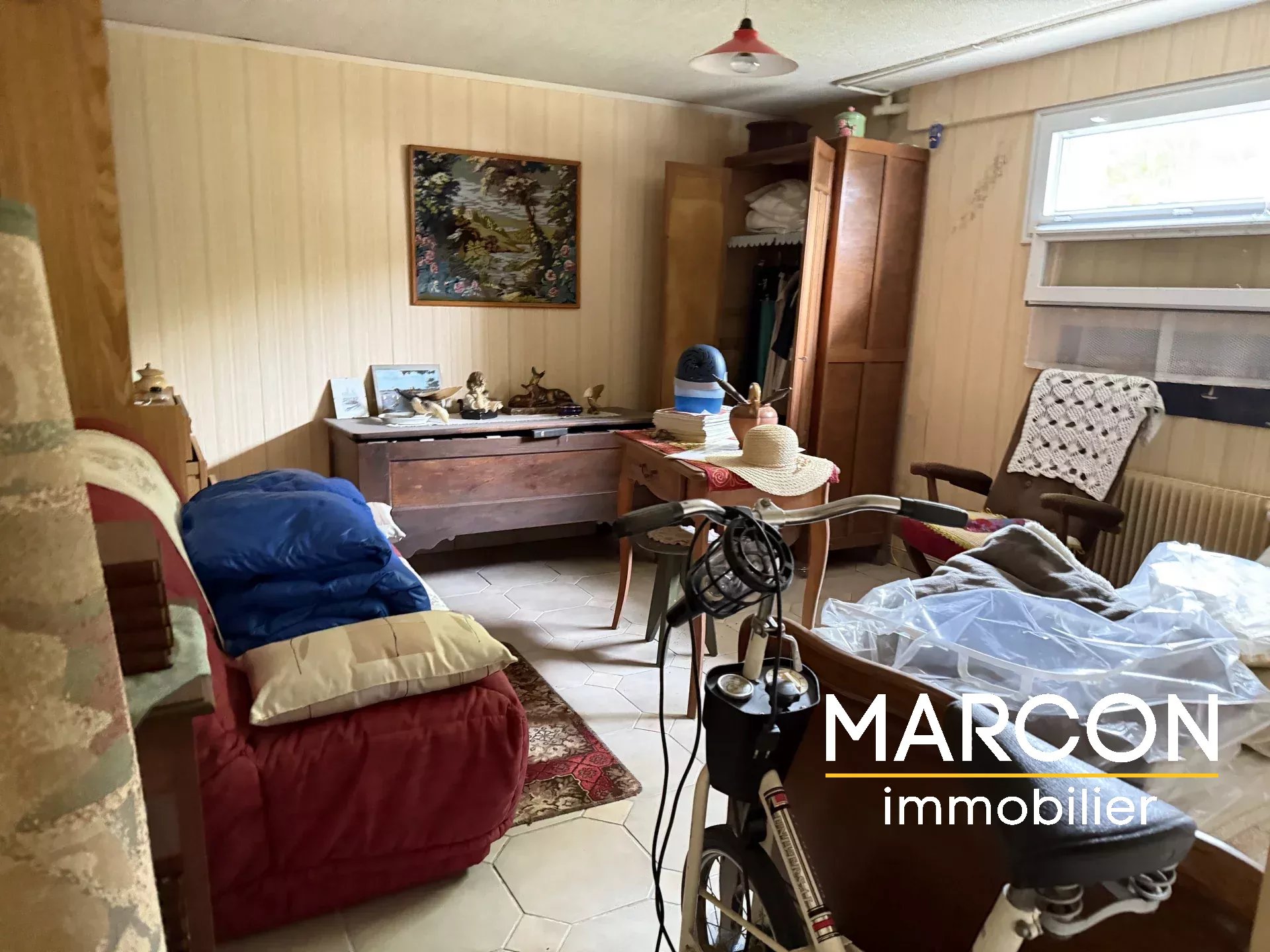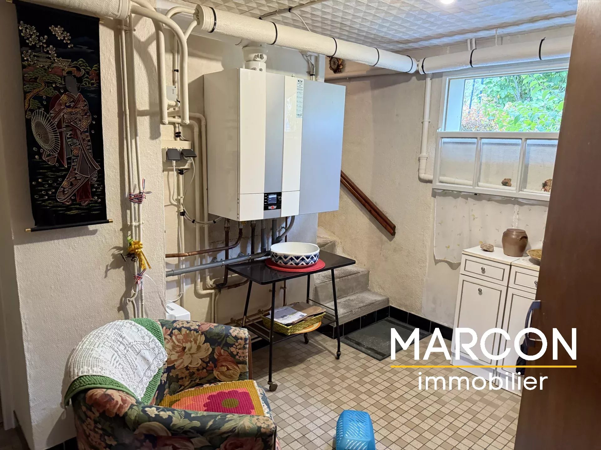 Sous-sol semi-enterré avec dégagement/coin chaufferie, une chambre supplémentaire, garage avec coin lavabo/WC et remise.
