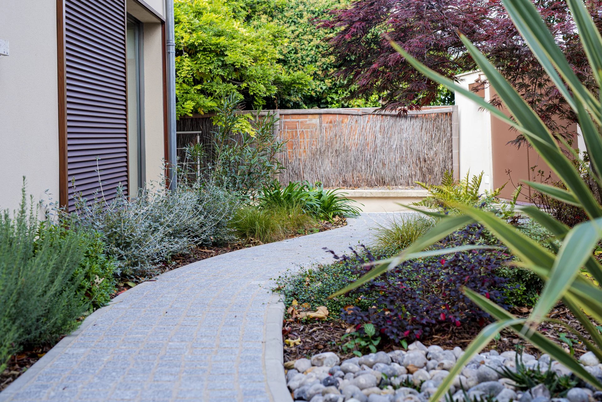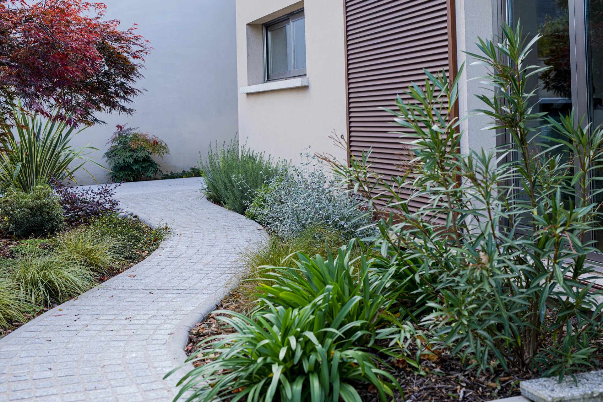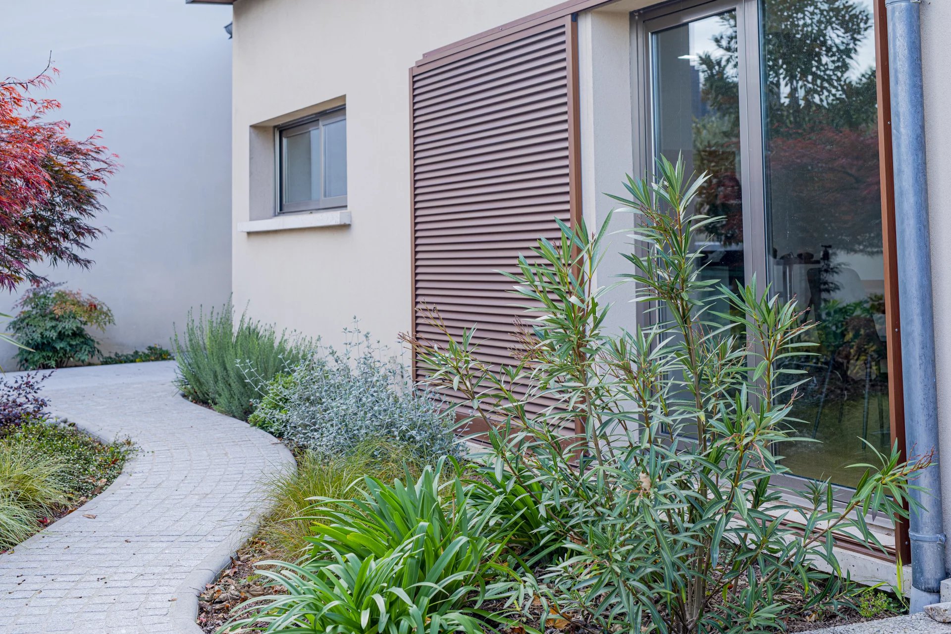 Implantée sur un terrain clos et paysager de 600 m², cette maison bénéficie d’un jardin sans vis-à-vis, véritable havre de paix.