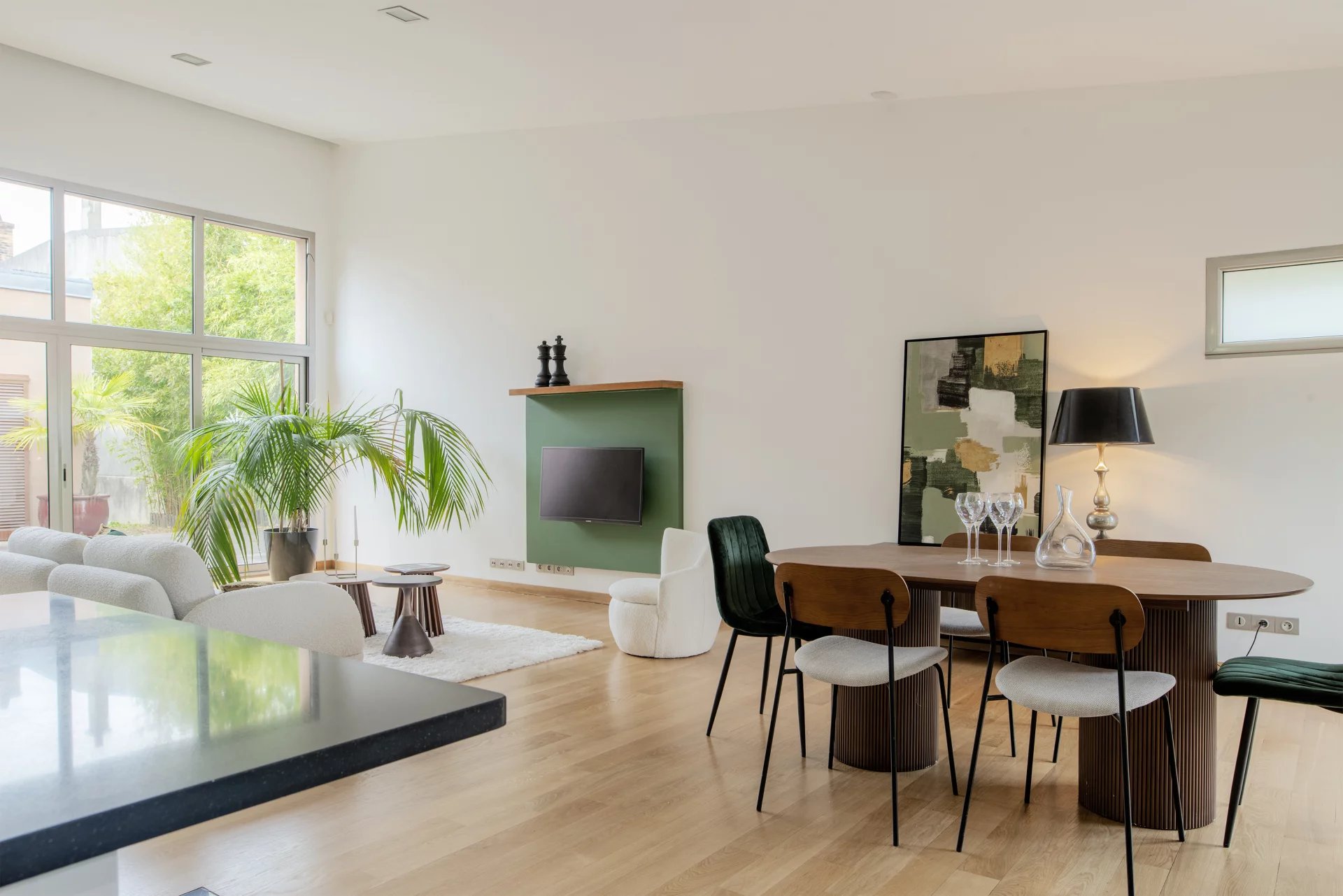 Dès l’entrée, un hall spacieux, avec grand placard aménagé sur-mesure. Triple séjour en parquet chêne massif avec cheminée, espace de vie lumineux grâce à une exposition idéale s’ouvrant sur un patio intime, parfaitement orienté.