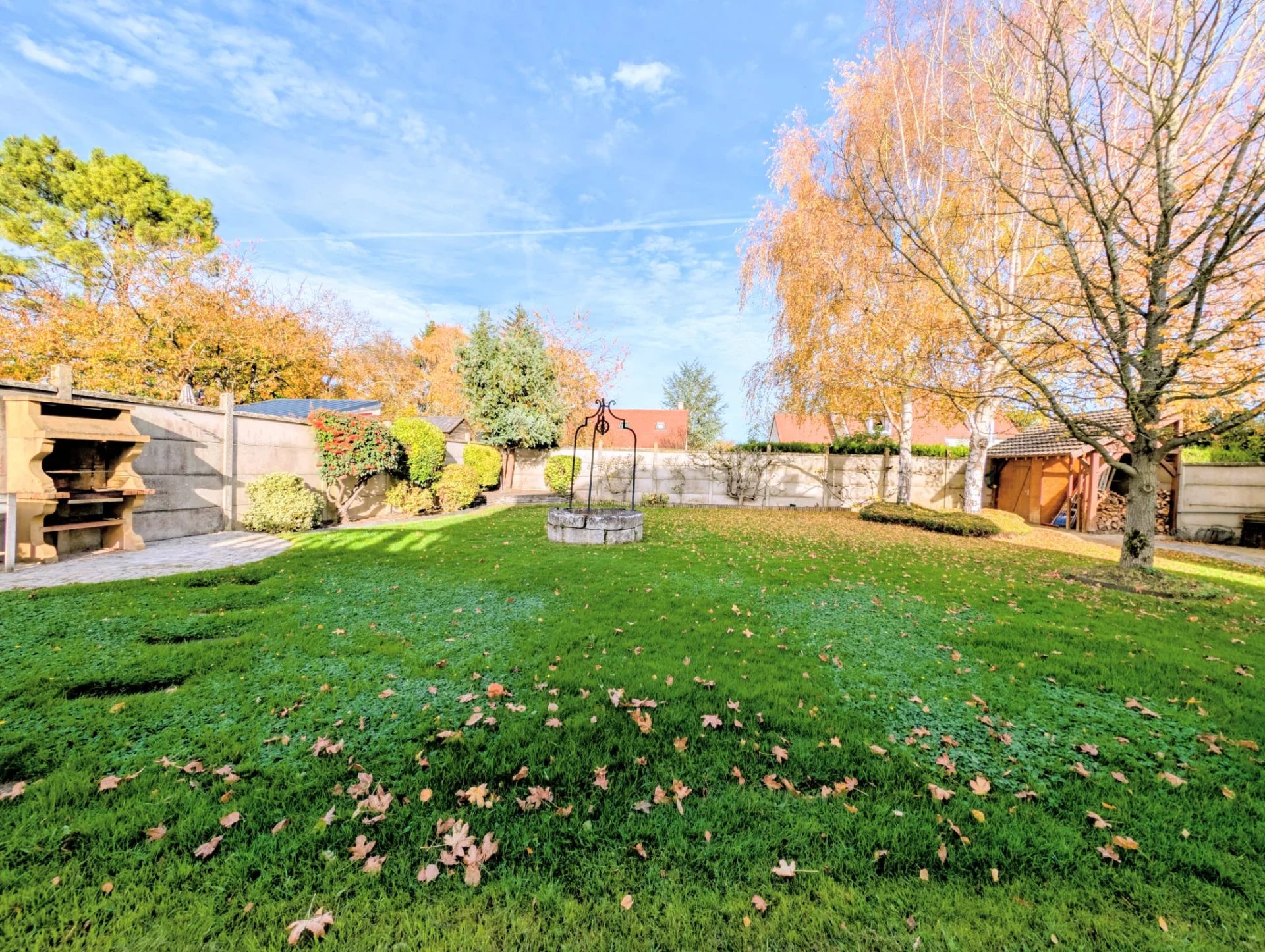 La parcelle de 1000 m² offre un jardin agréable sans vis-à-vis, une grande terrasse, un espace barbecue, plusieurs emplacements de stationnement et un double garage avec mezzanine.