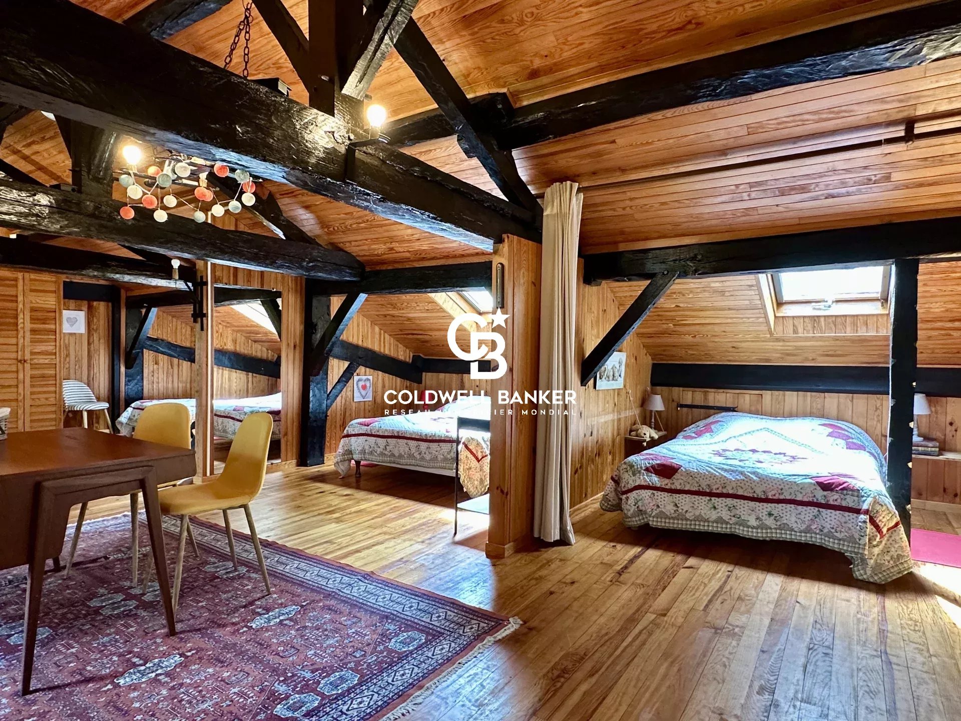 La maison principale, élégante et authentique, offre une belle pièce de vie avec insert, une véranda de plus de 40 m² tournée vers la verdure, une cuisine équipée, trois chambres dont une suite parentale, salle de bains, et plus de 100 m² de combles aménageables.