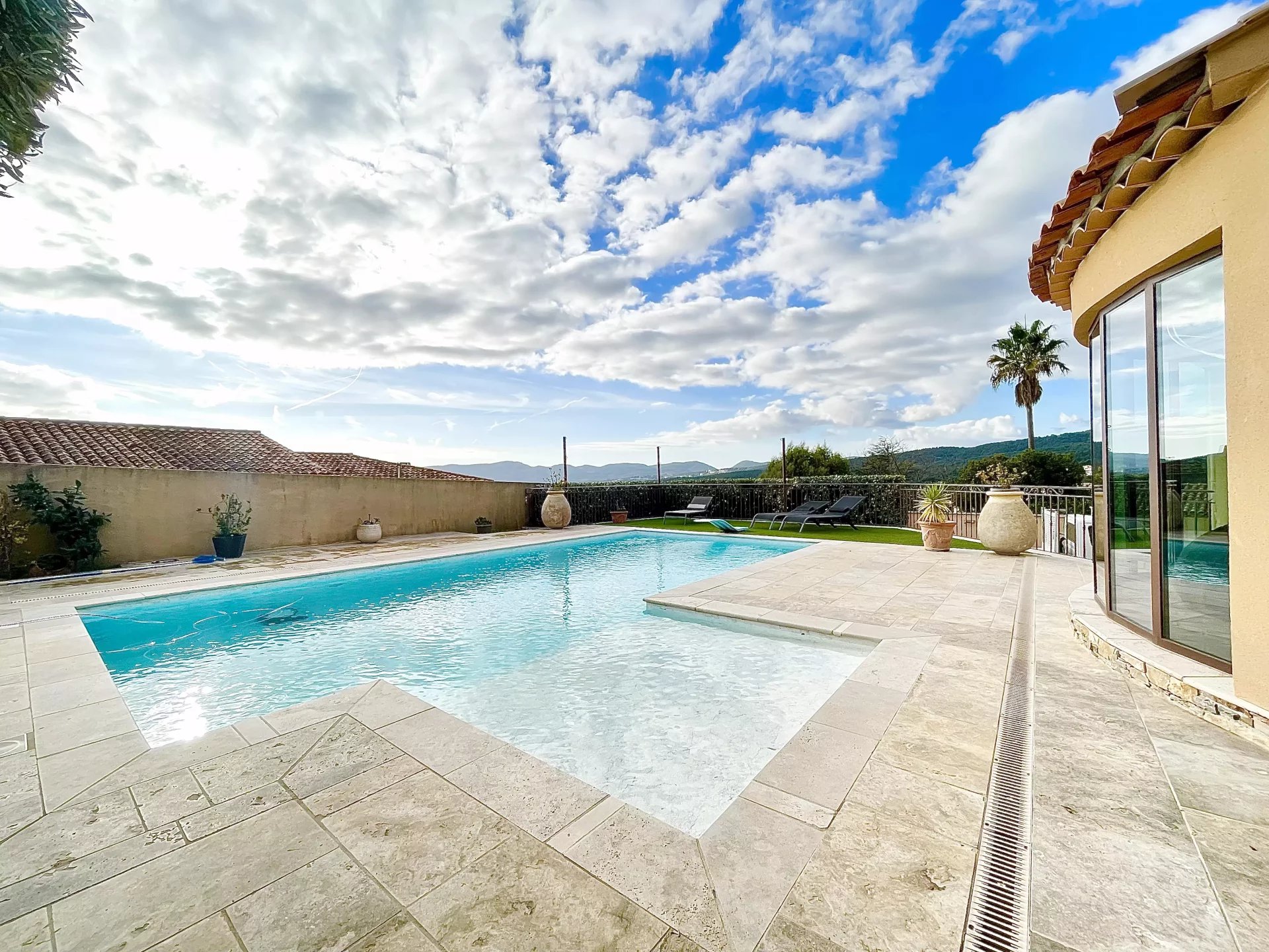 La cuisine et la salle à manger, contiguës au séjour avec sa mezzanine ainsi qu'une suite parentale donnent directement sur la piscine.