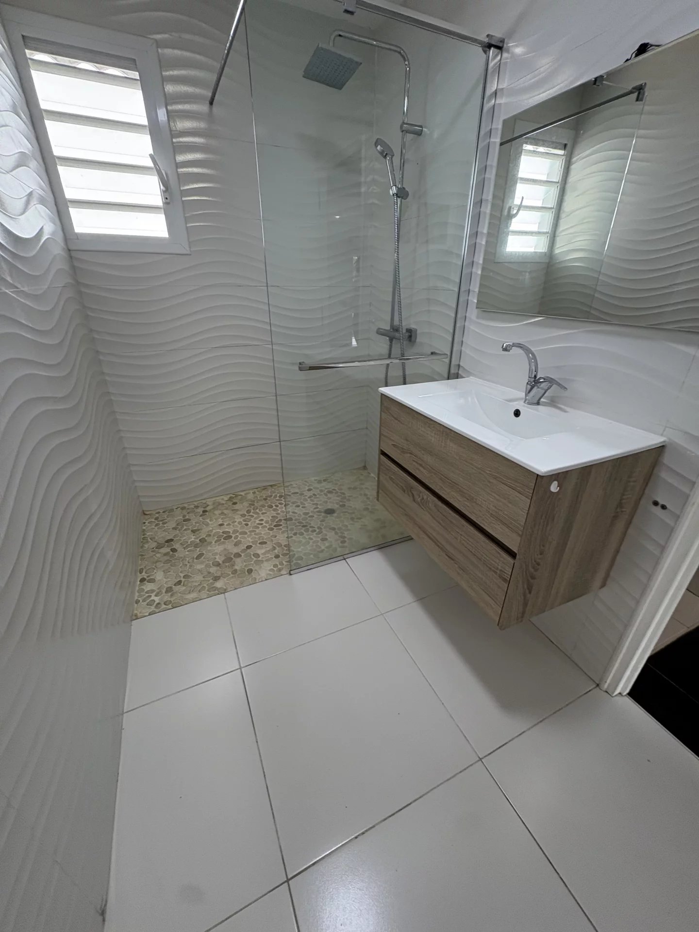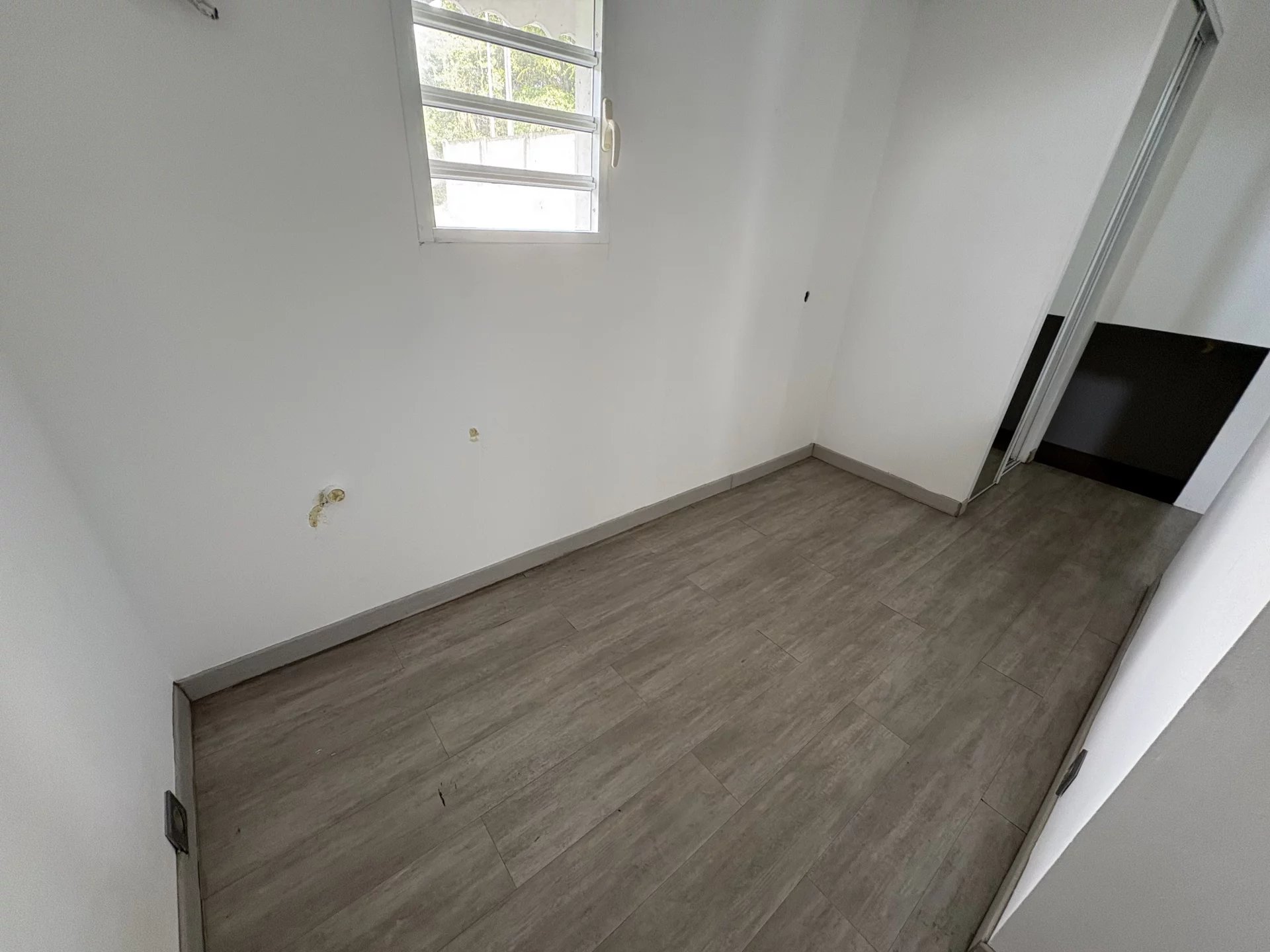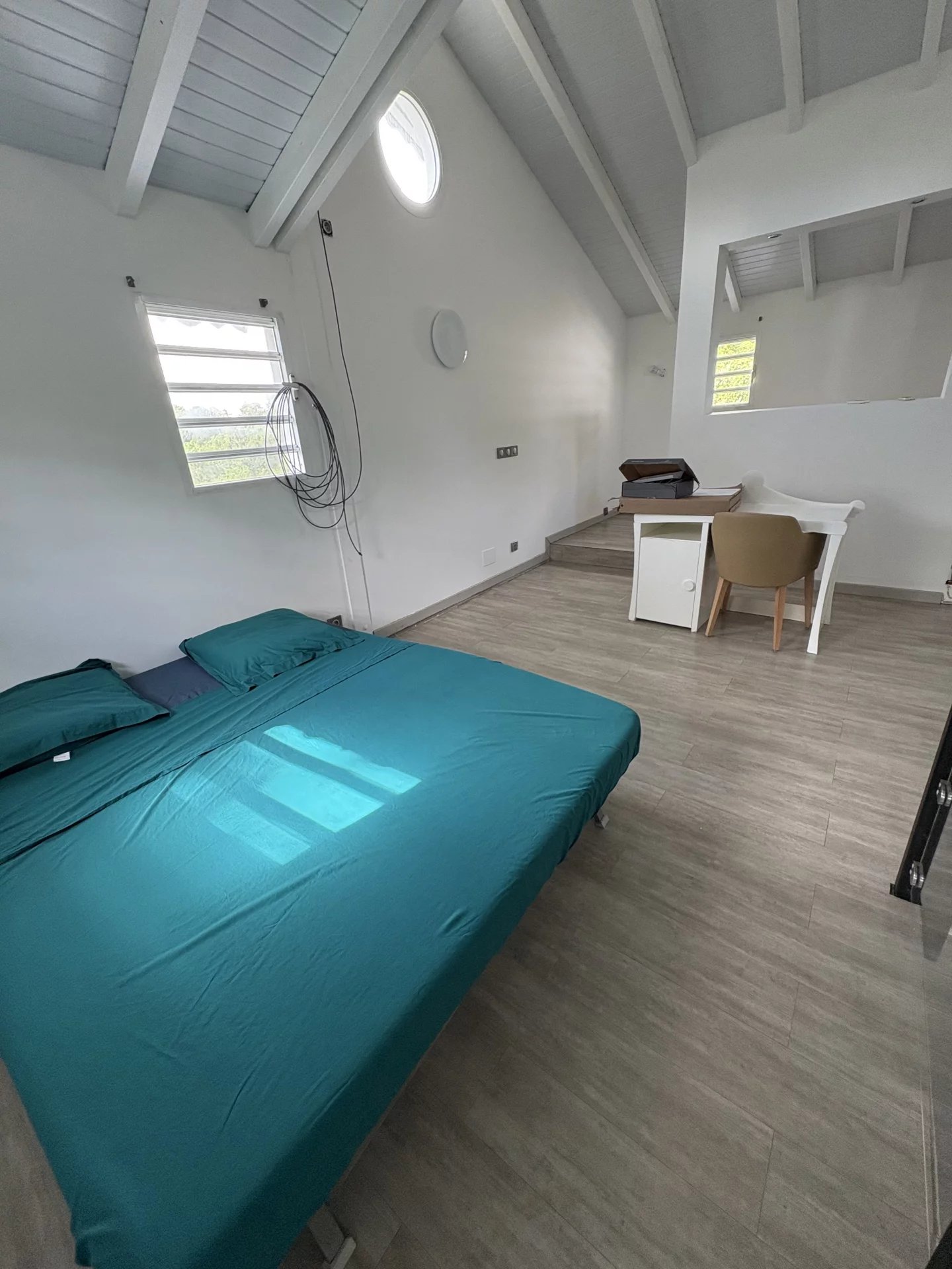Beau haut de villa T4 meublé, moderne, équipements de qualité, vue dégagée sur la campagne, à Moreau Le Gosier, dans un quartier calme comprenant : 1 séjour ouvert sur une belle cuisine aménagée et équipée, 1 dégagement avec placard, 1 chambre parentale climatisée avec sa salle de bain et wc et son dressing, 1 wc indépendant, 1 salle d'eau, 1 chambre climatisée avec rangement. A l'étage : 1 chambre climatisée avec coin bureau et placards. 1 grande terrasse en L avec emplacement parking.