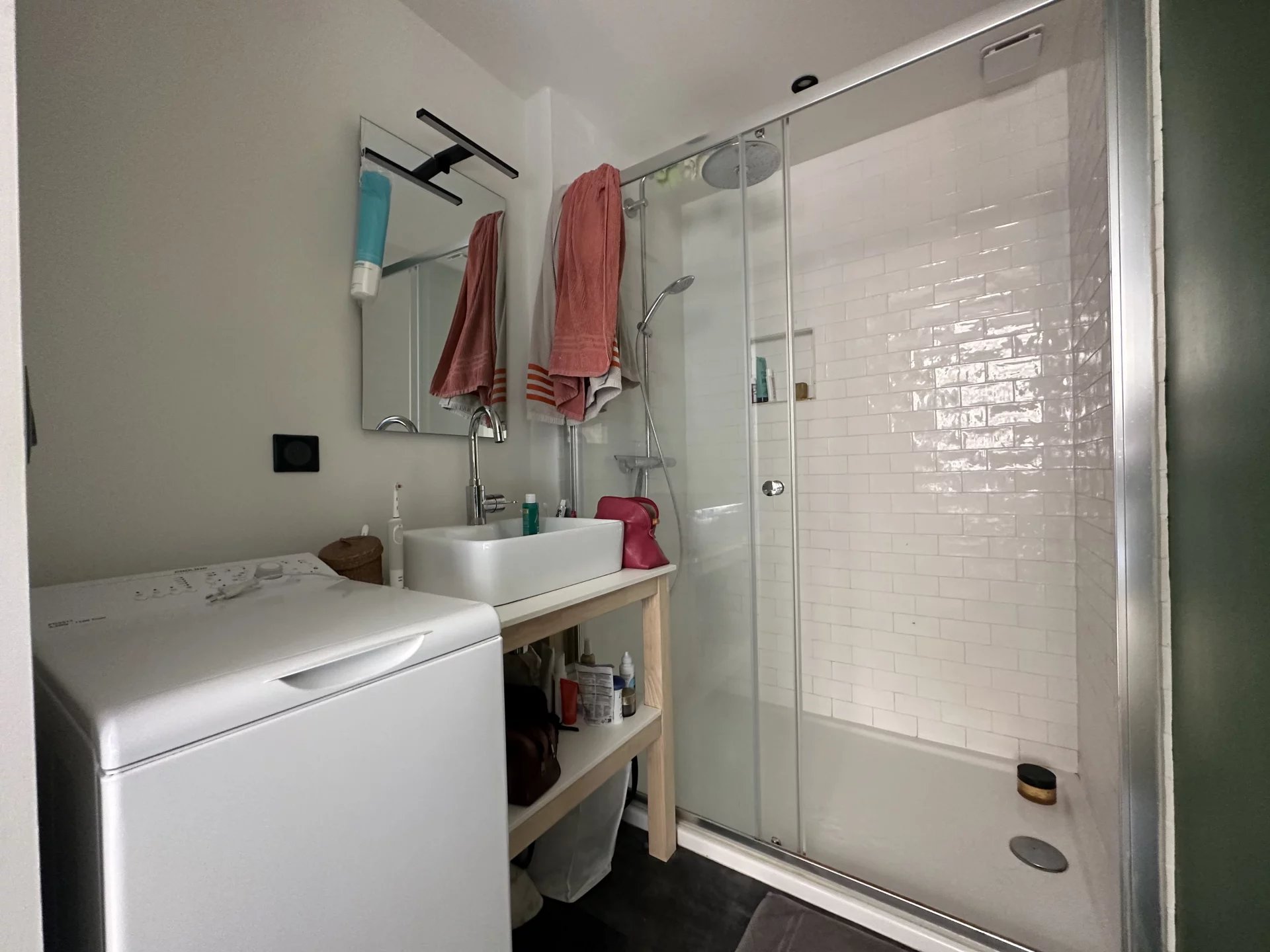 Au niveau supérieur, une chambre équipée, avec salle d'eau et machine à laver.