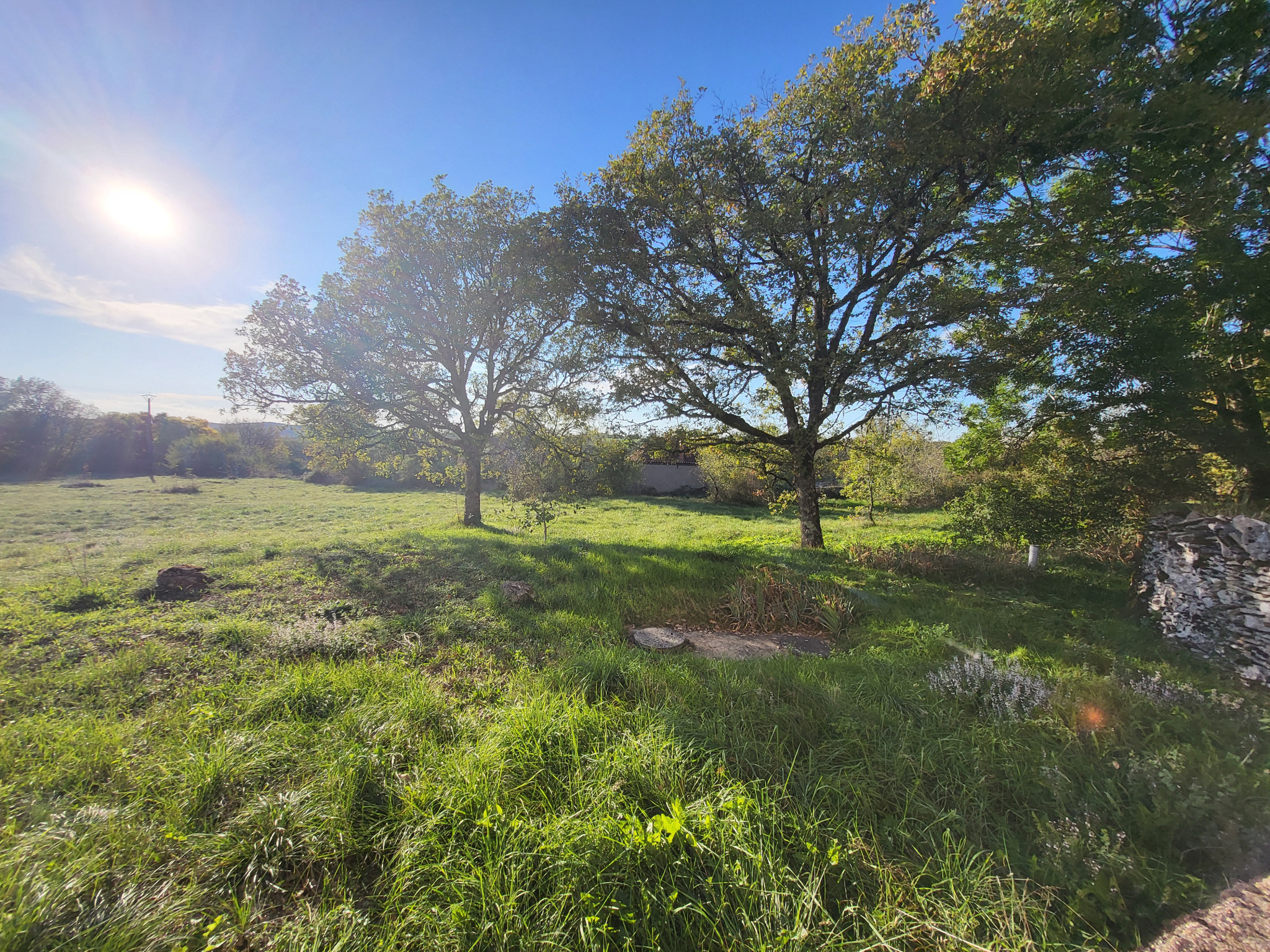 Vaste terrain avec murets en pierre et accès voiture avec garage indépendant.