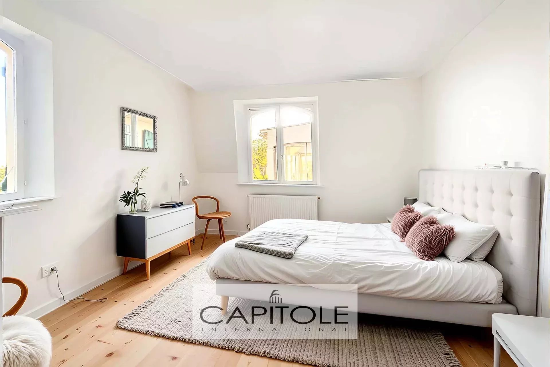 Au niveau jardin, les volumes généreux se prolongent vers un salon avec cheminée, une salle à manger ouvrant sur une véranda lumineuse de 24 m², et une cuisine contemporaine équipée avec îlot central. Trois chambres supplémentaires, deux salles de bains, un sauna et une buanderie complètent cet espace de vie raffiné et convivial.