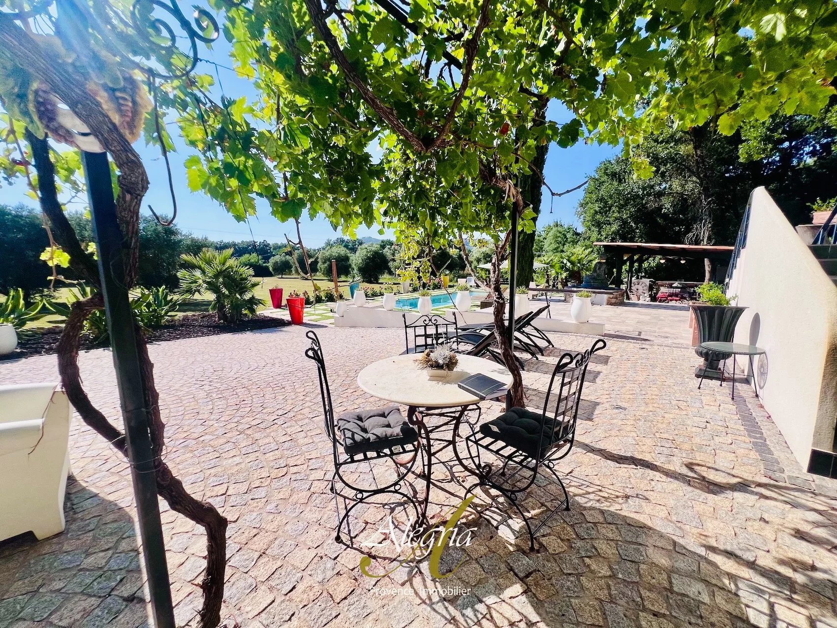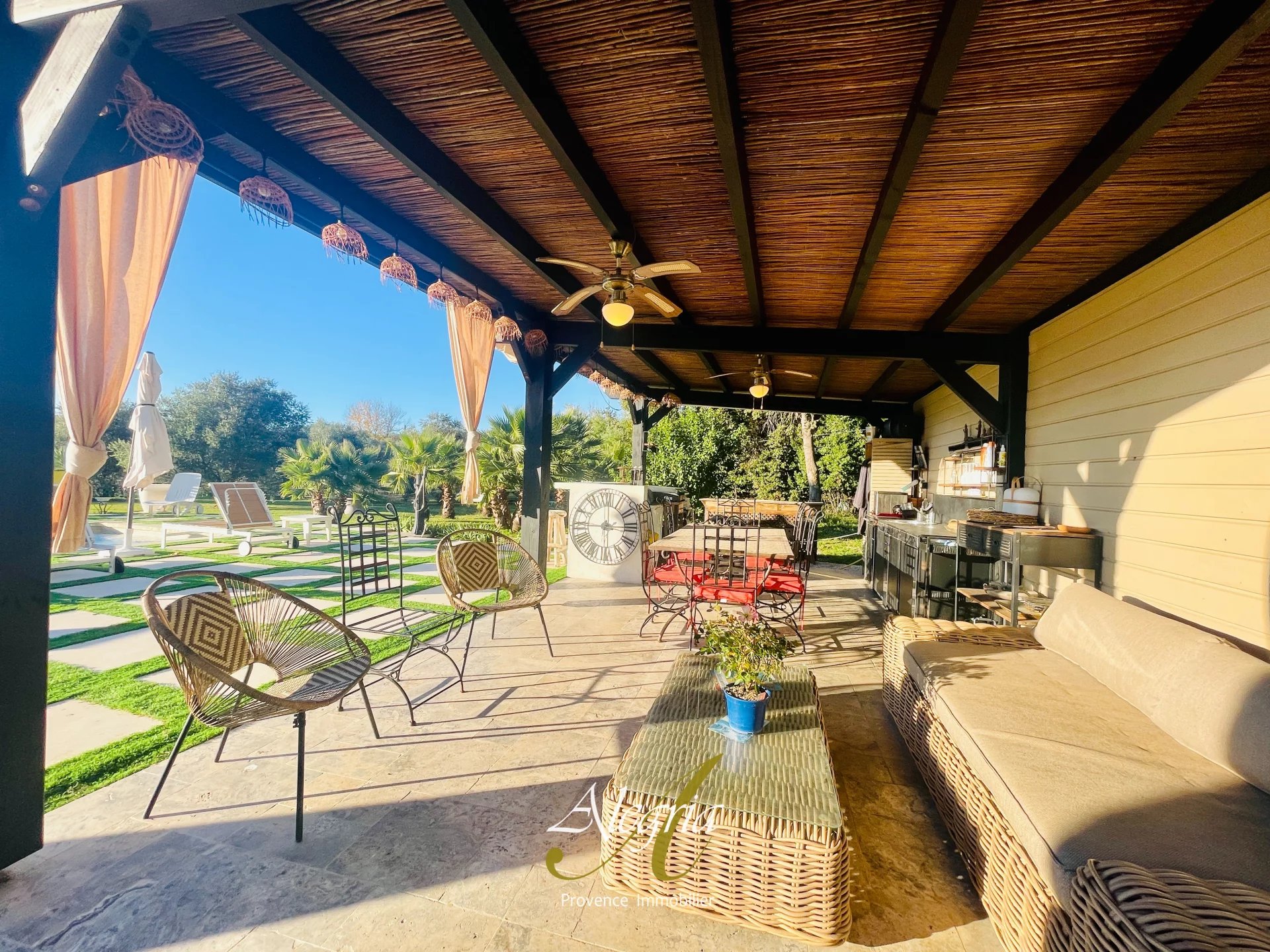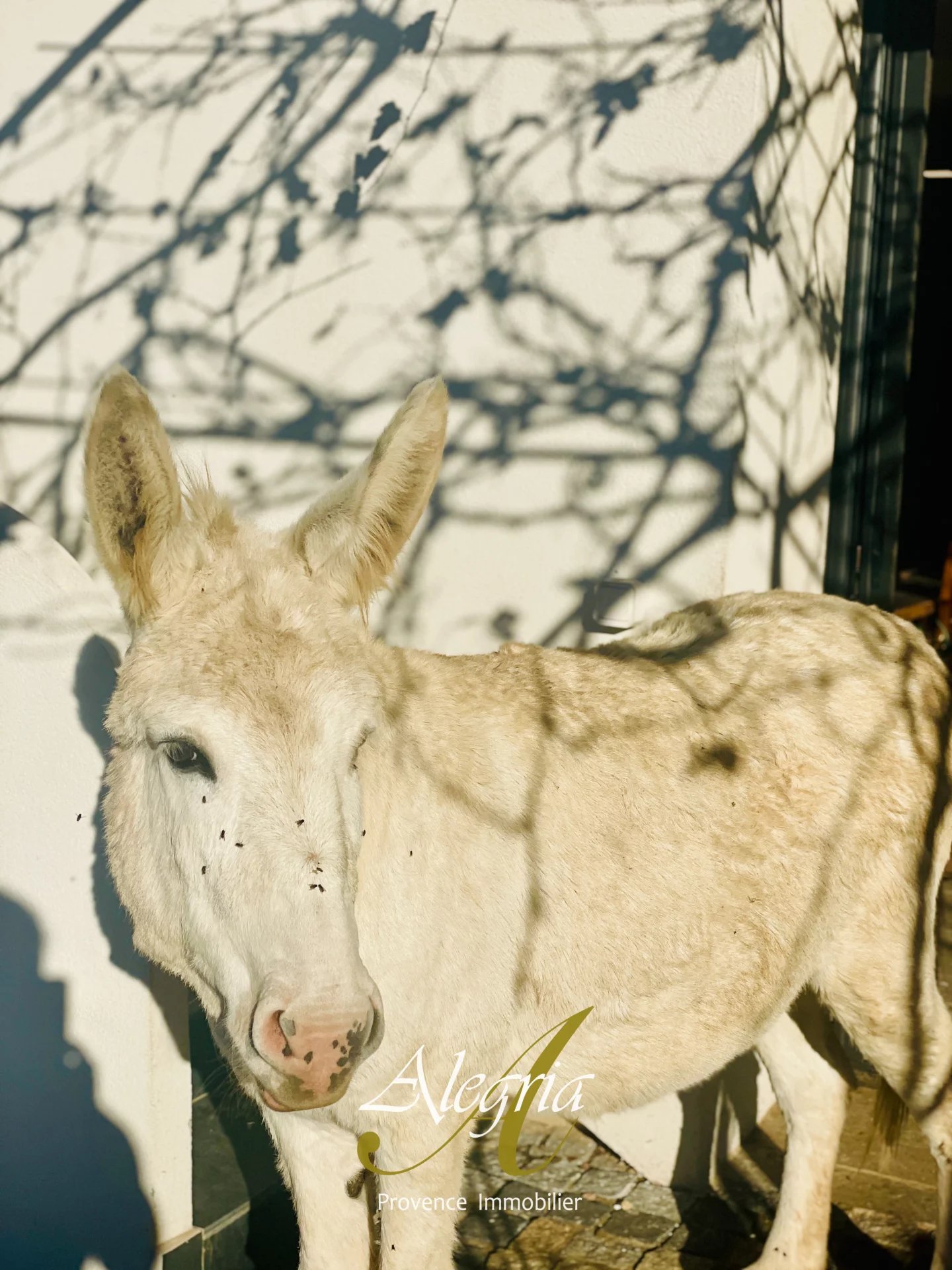 À l’extérieur, un grand parking, plusieurs terrasses, une cuisine d’été et une piscine au style zen s’ouvrent sur le paysage. Le regard porte loin, sans vis-à-vis, entre vignes ondoyantes et oliveraie mature. Et parfois, quelques ânes paisibles ponctuent la scène - silhouettes tranquilles qui rendent l’ensemble encore plus vivant, presque intemporel.