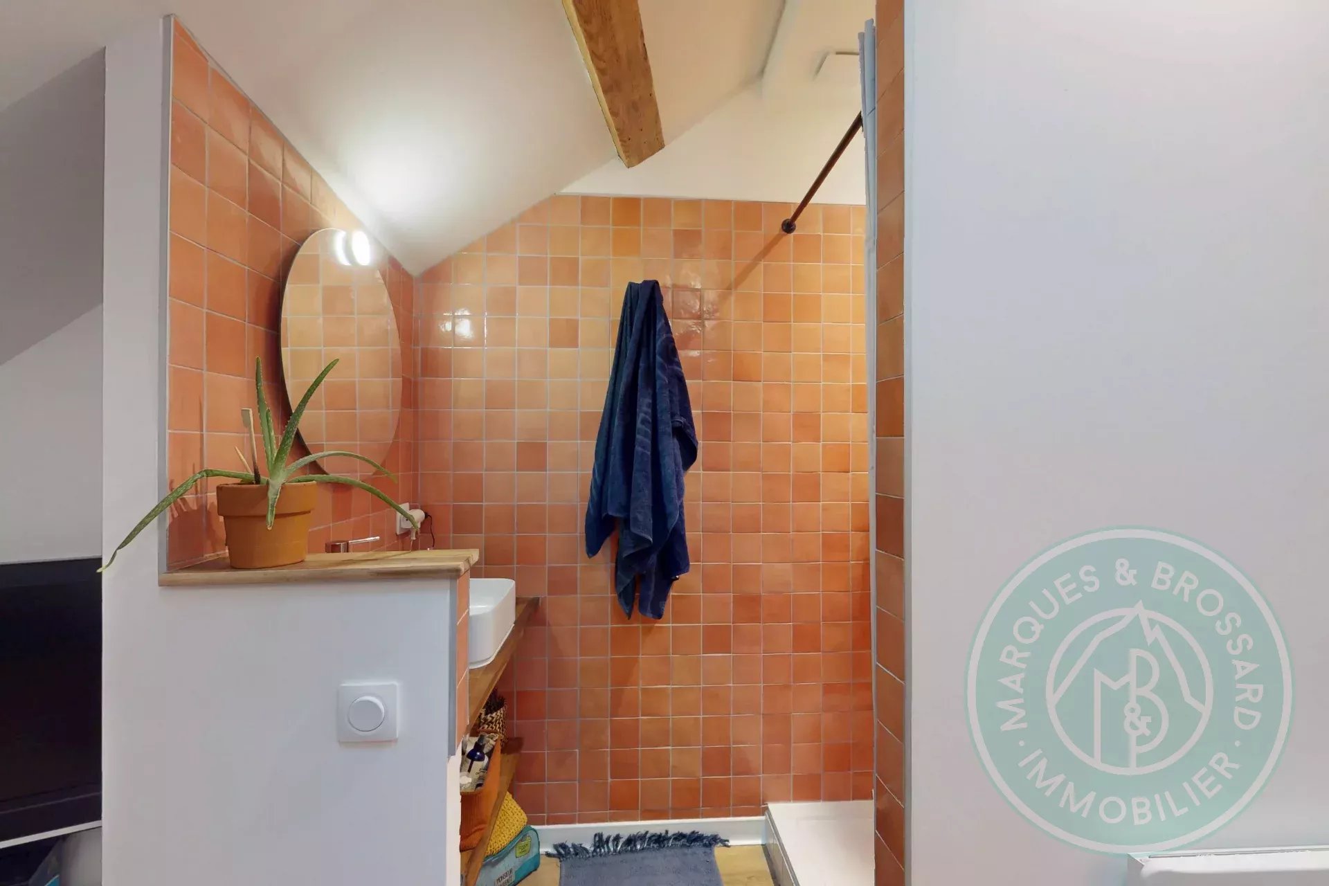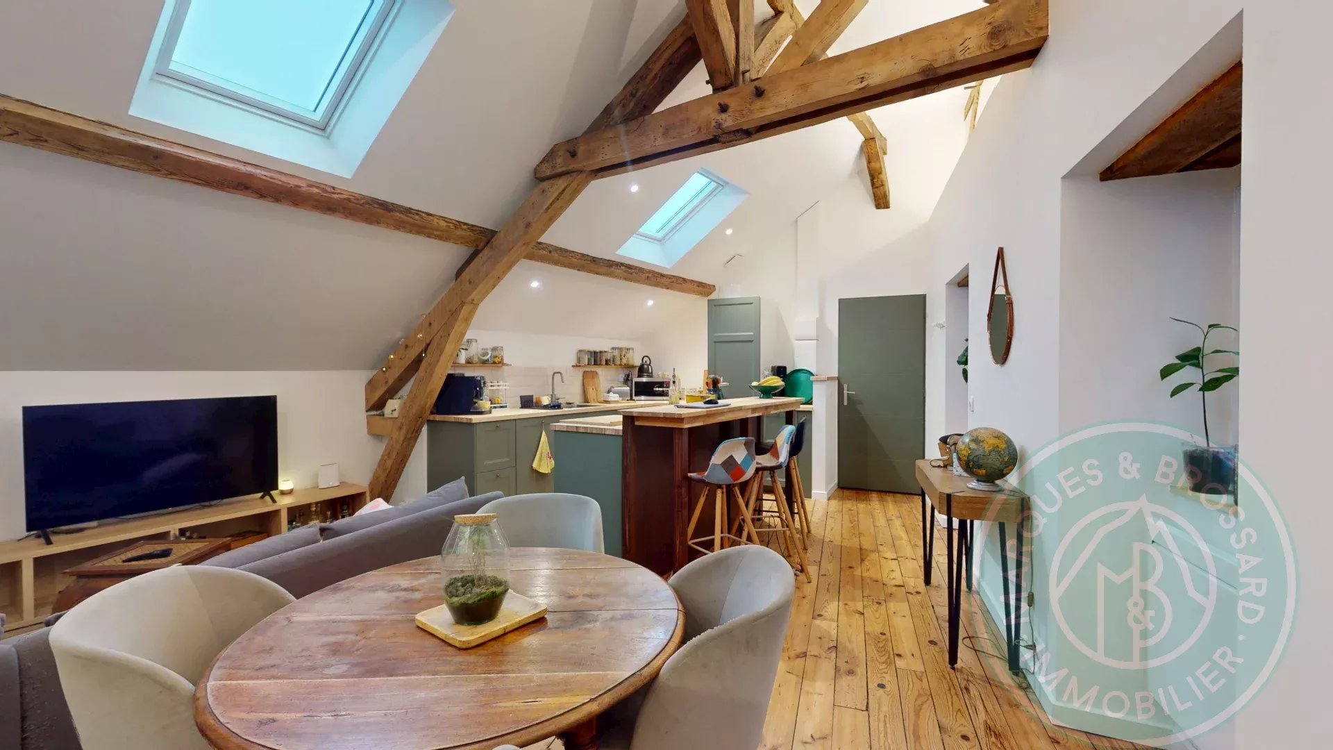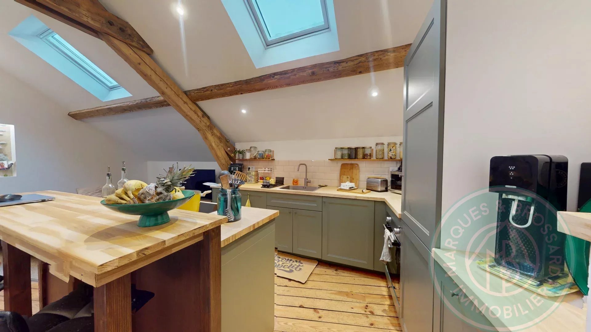 Vous apprécierez particulièrement sa cuisine ouverte sur un séjour avec poutres apparentes et beau parquet. Il dispose de deux chambres et un bureau, de deux salles d'eau et d'un WC.