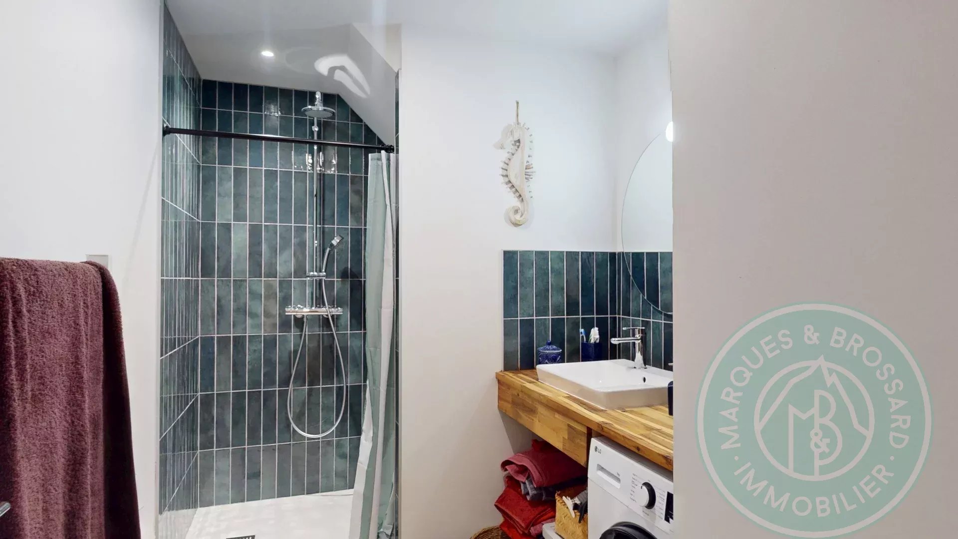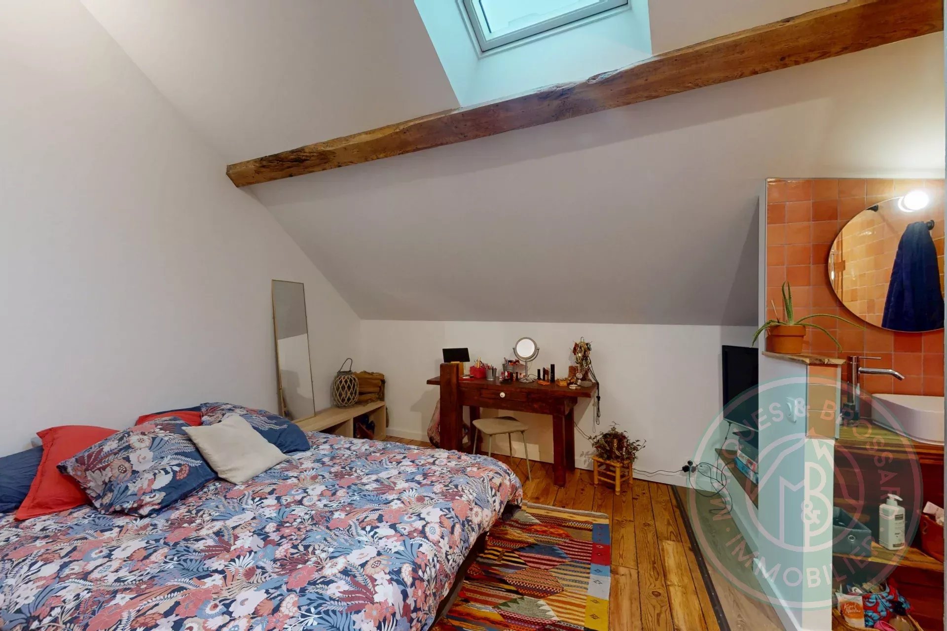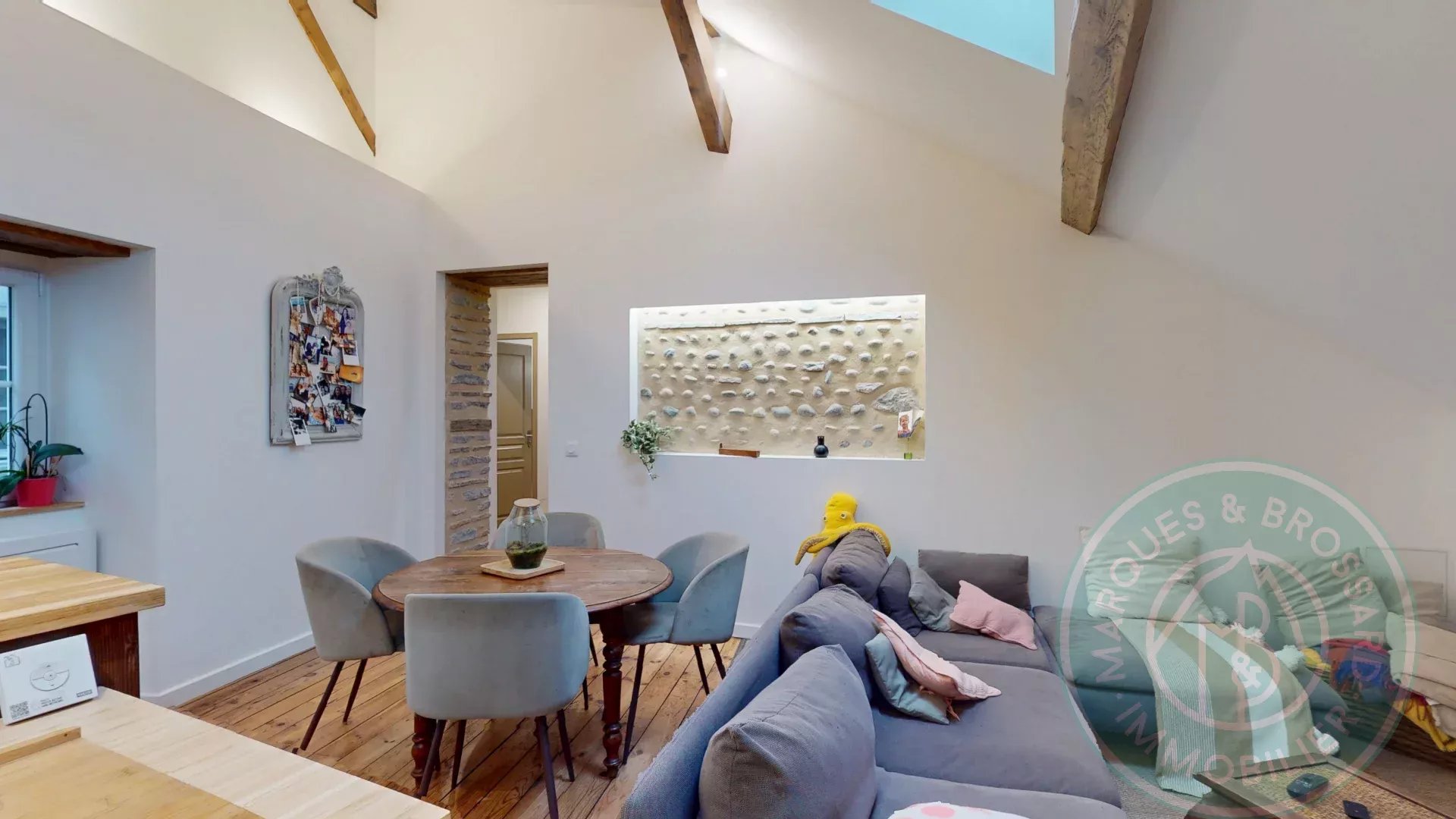 Vous apprécierez particulièrement sa cuisine ouverte sur un séjour avec poutres apparentes et beau parquet. Il dispose de deux chambres et un bureau, de deux salles d'eau et d'un WC.