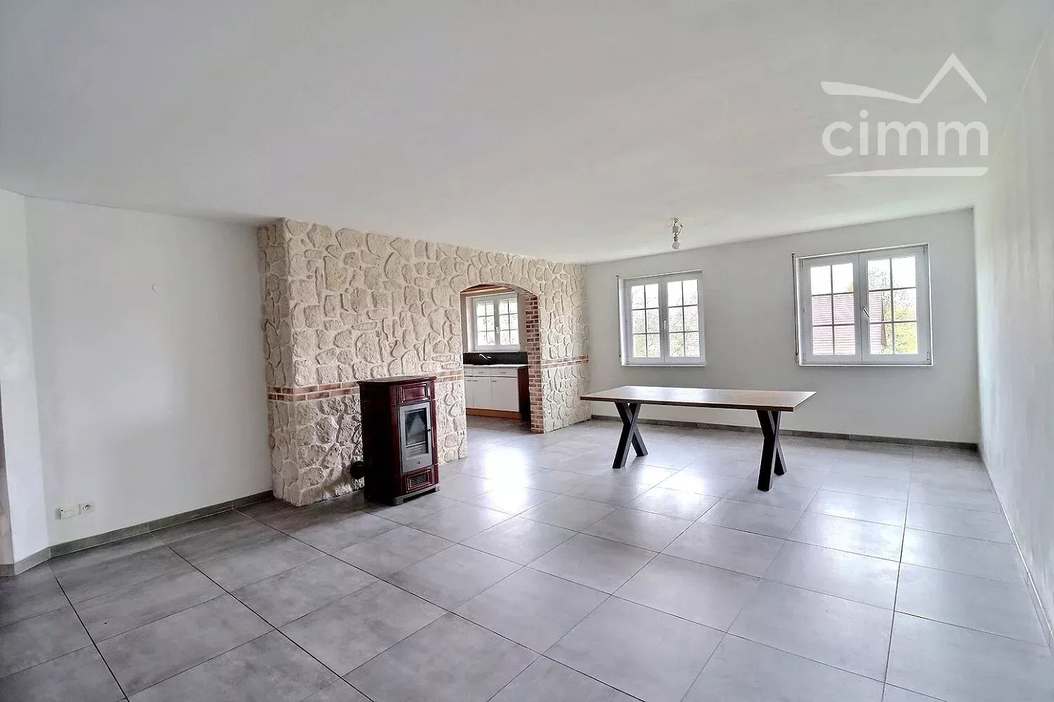 Le séjour, d’environ 37 m² et baigné de lumière naturelle, constitue le cœur de la maison : un espace convivial, agrémenté également d’un poêle à pellets.