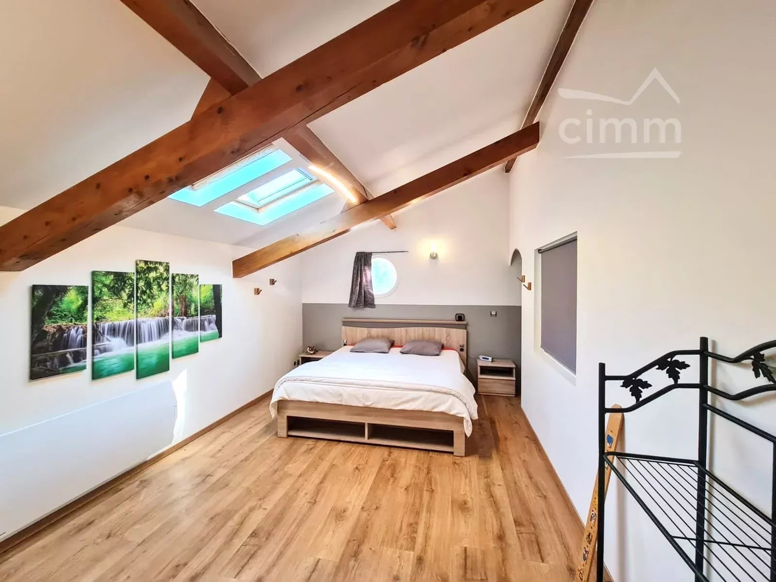Immense pièce de vie avec plafond cathédrale avec climatisation réversible et poële à bois, belle cuisine ouverte, dégagement desservant 2 belles chambres avec placard, salle de bain, wc indépendant, cellier, vaste garage.