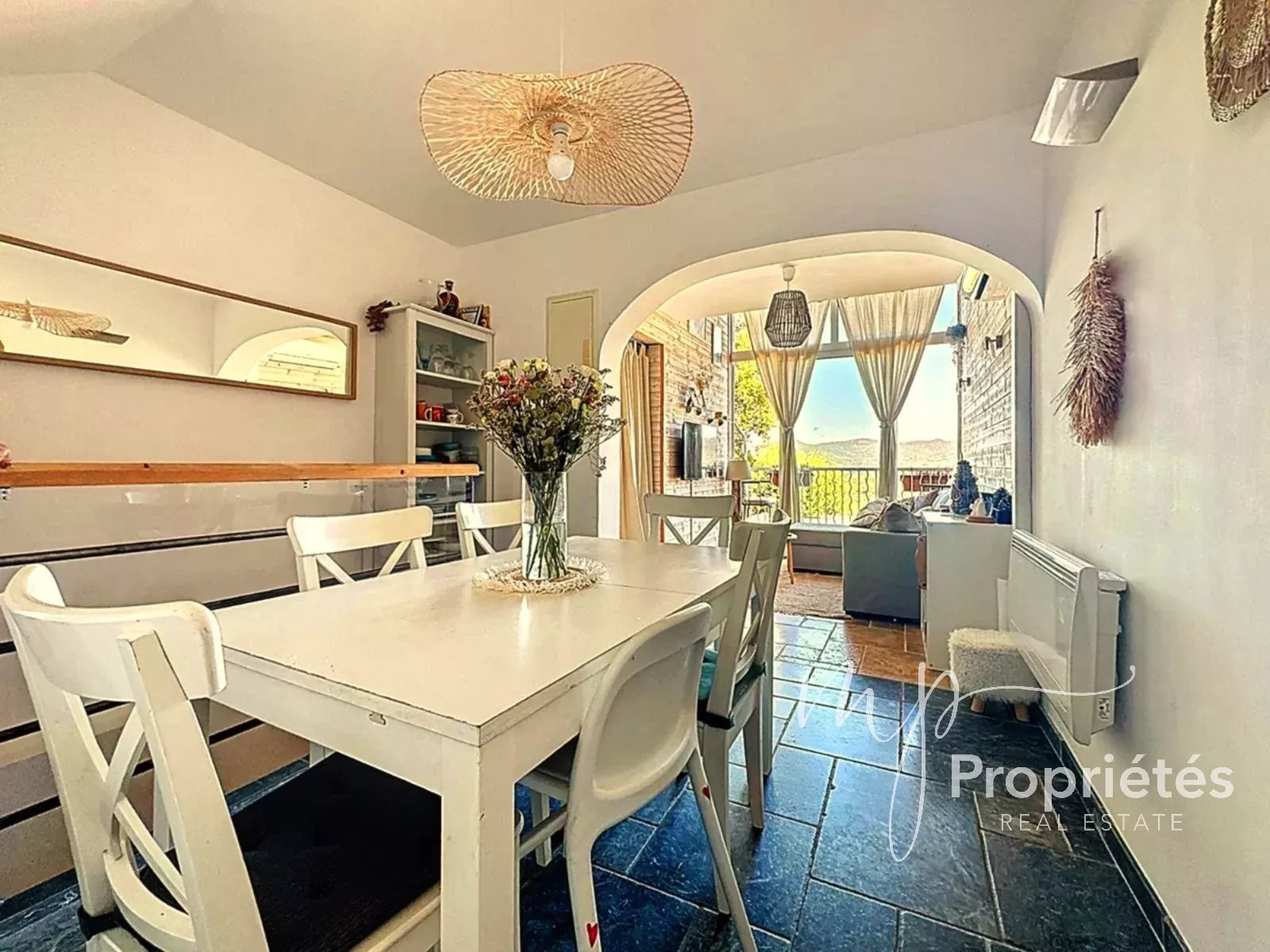 L’entrée se fait par une terrasse privative, idéale pour savourer des instants de quiétude, donnant accès à une cuisine ouverte parfaitement agencée et pensée pour la convivialité. Le séjour/salle à manger lumineux, aux volumes généreux, profite d’une vue dégagée et apaisante sur les collines environnantes.
