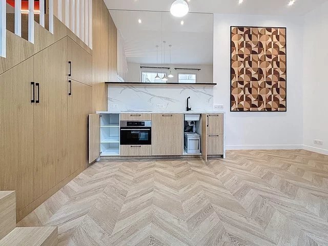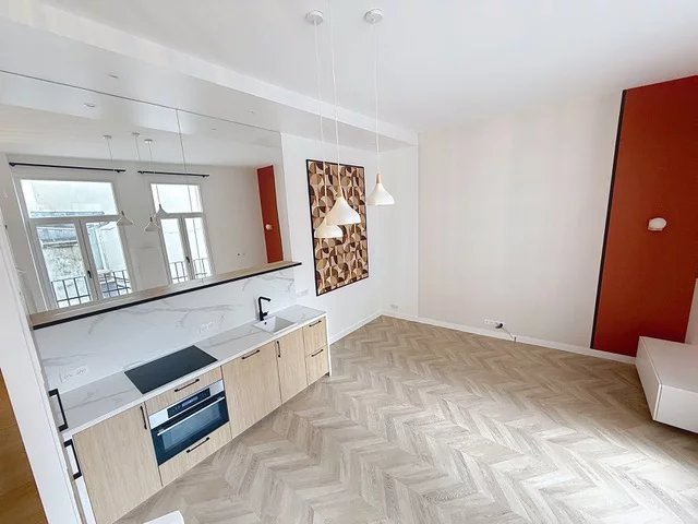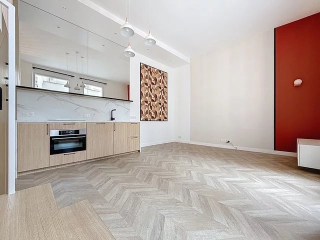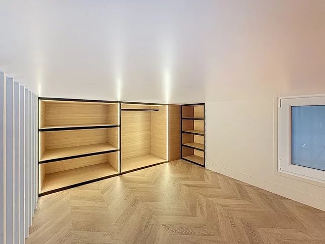 Cette pièce intègre une cuisine ouverte entièrement équipée, de nombreux rangements sur mesure, et profite d’une belle luminosité grâce à deux grandes fenêtres neuves en double vitrage.