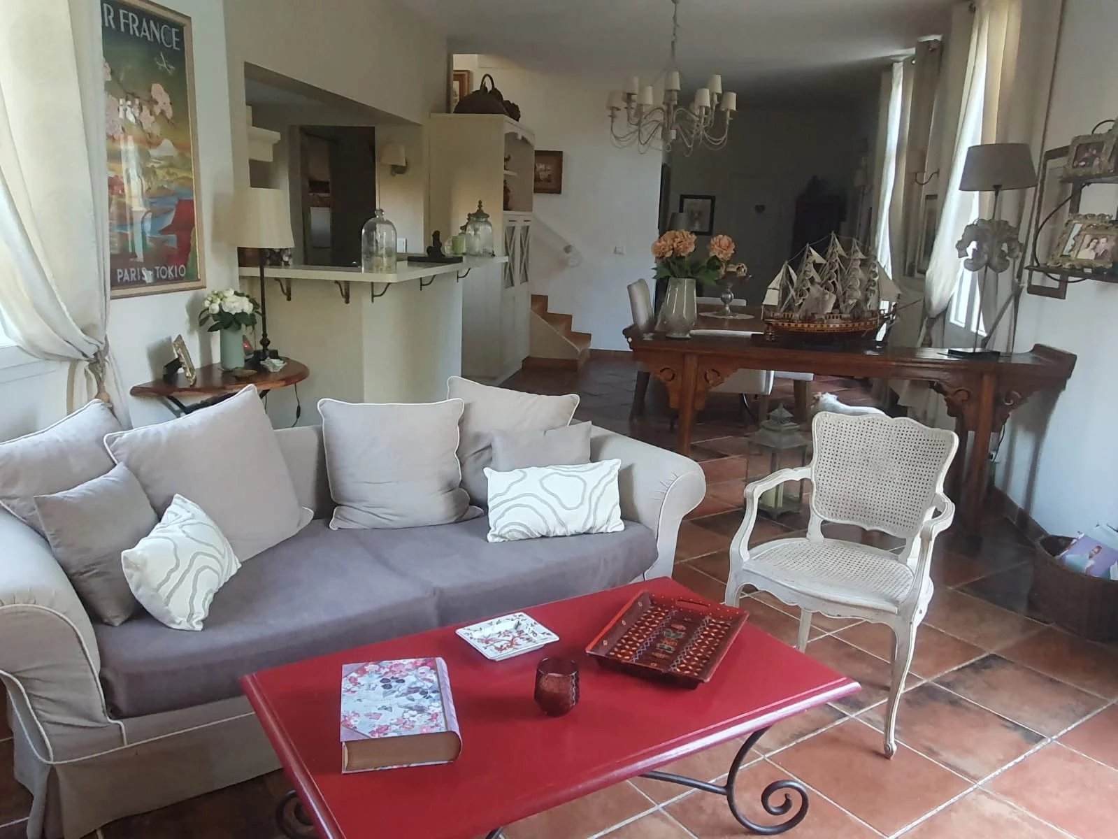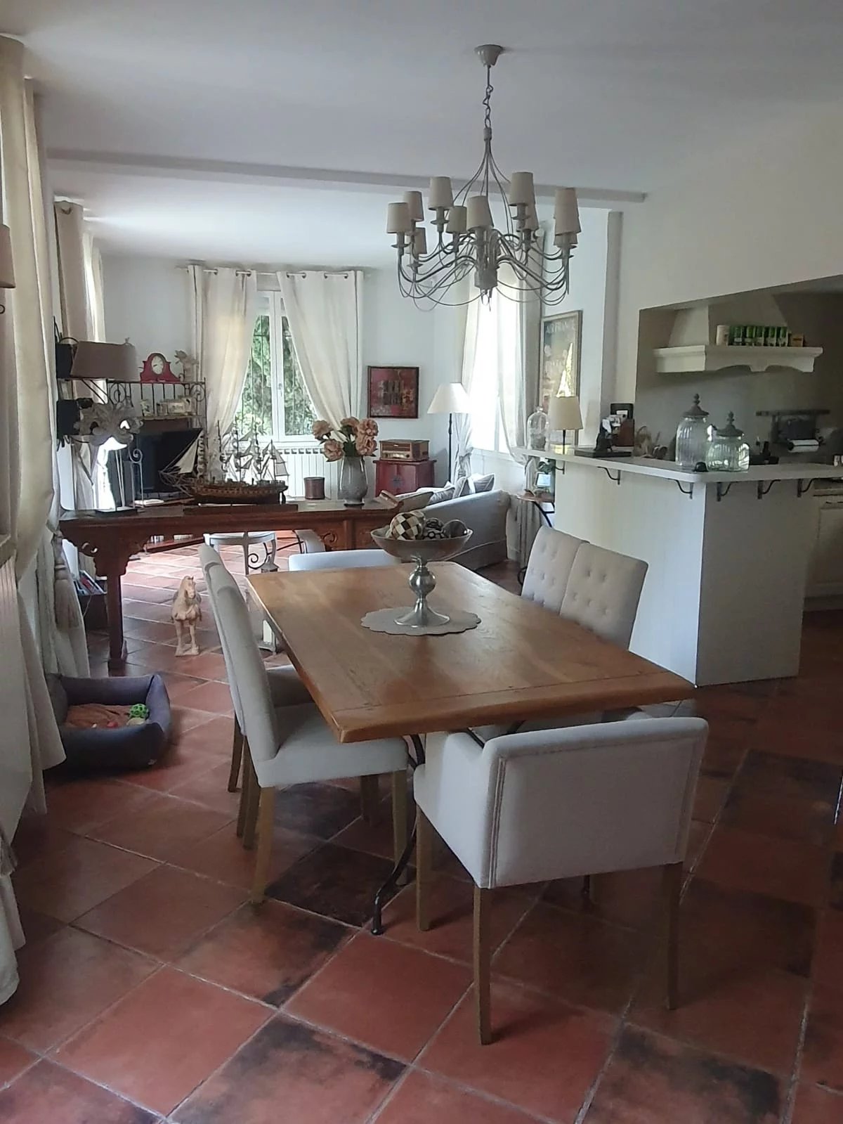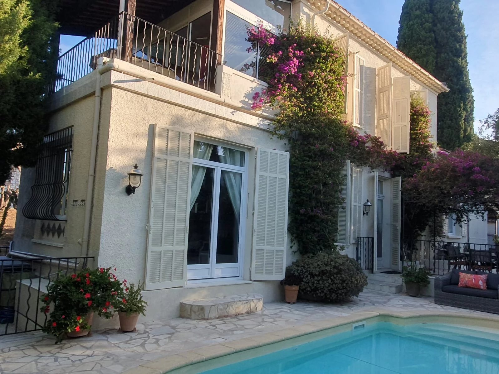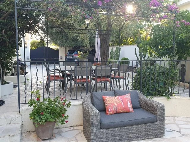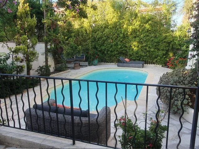 Elle offre un bel espace de vie lumineux, orienté plein Sud ,ouvrant sur la piscine et un agréable jardin agrémenté d'une tonnelle.