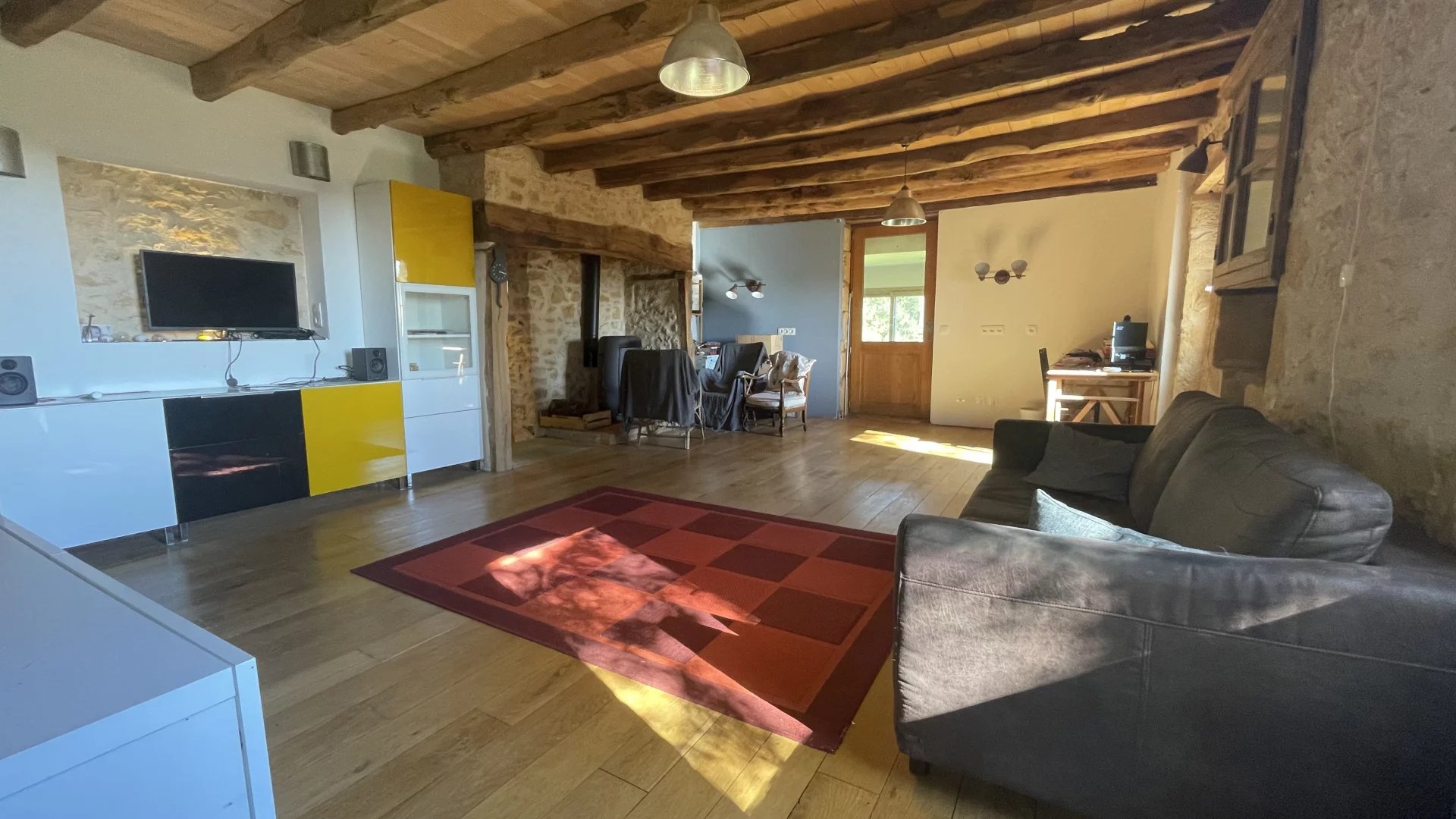 > Une belle pièce de vie avec murs en pierre et poutres apparentes,
